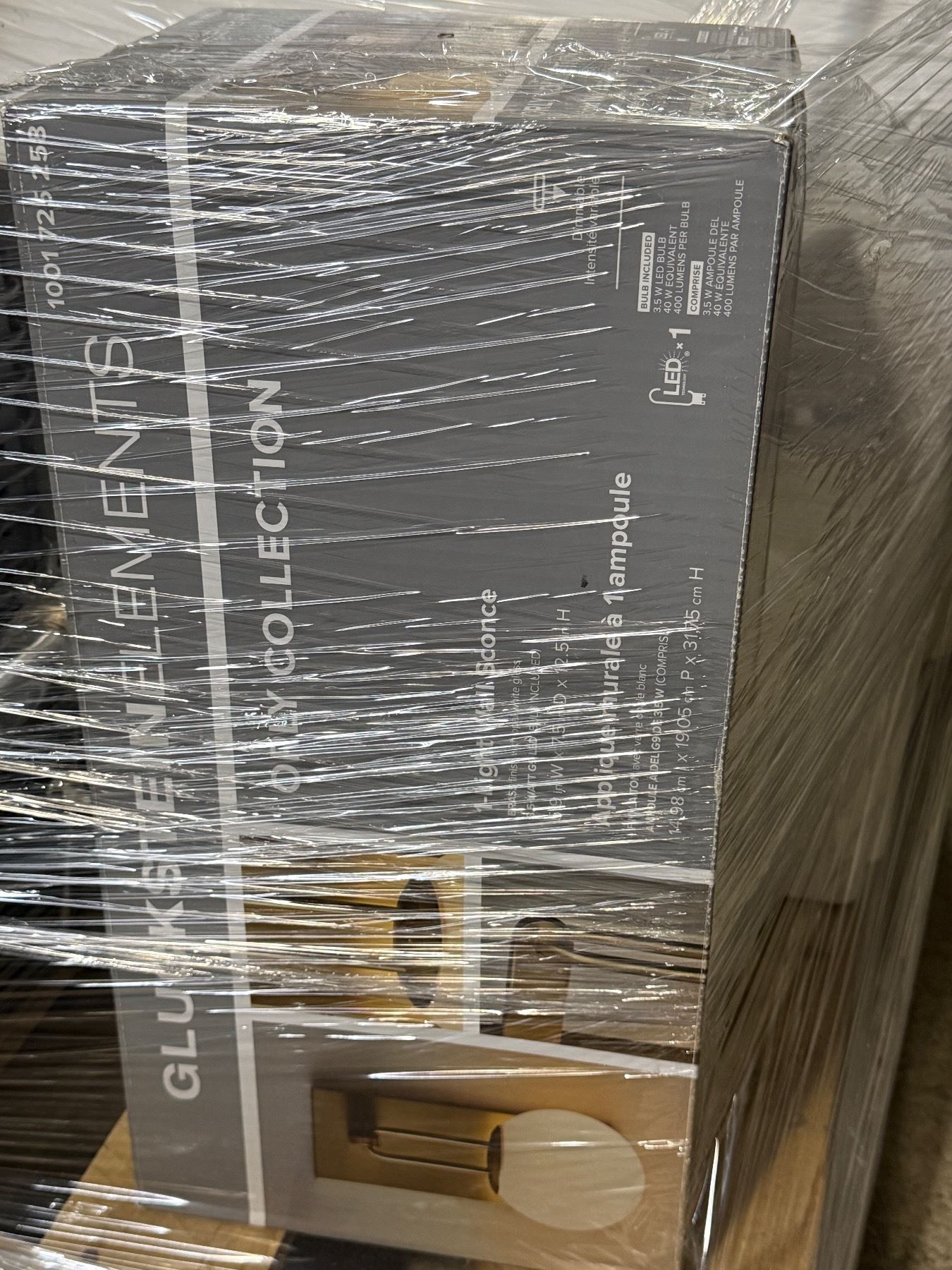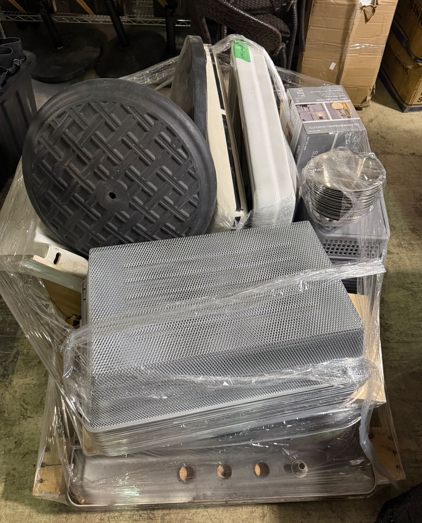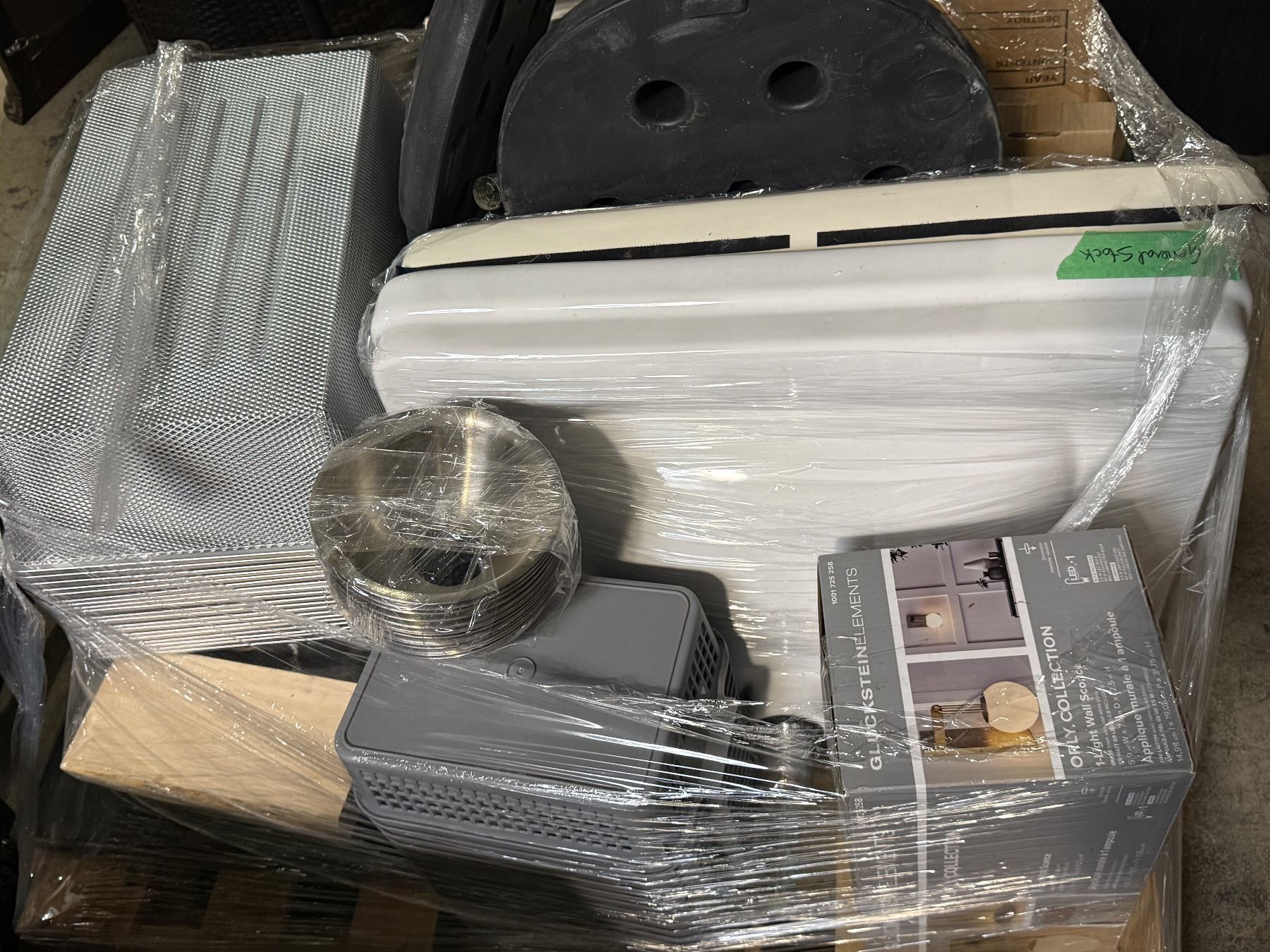 Pallet of Sinks, Cast Iron Bases, Metal Mesh Baskets, Light Wall Sconce, and More