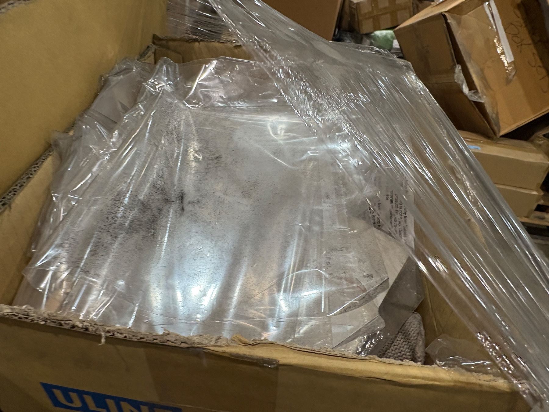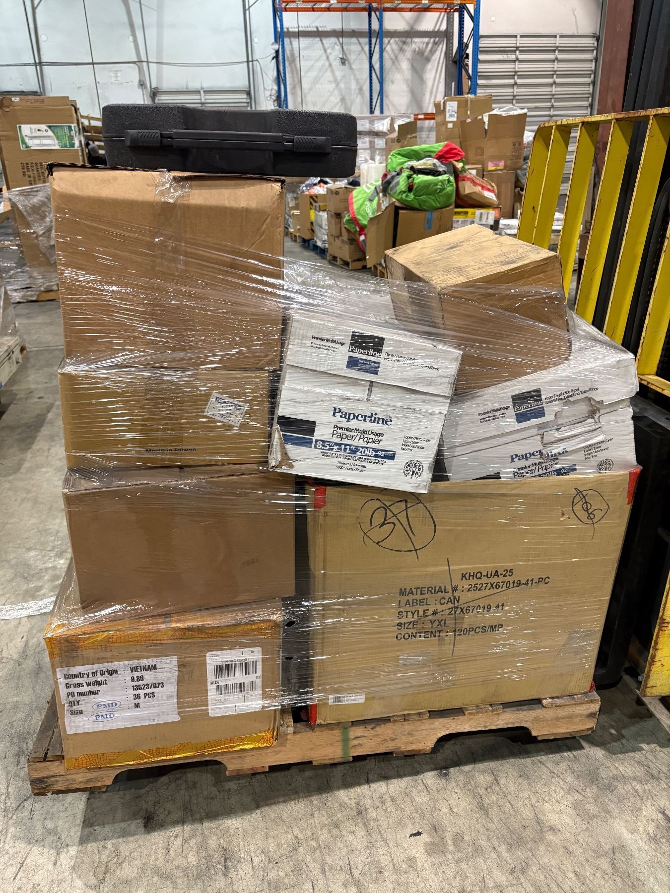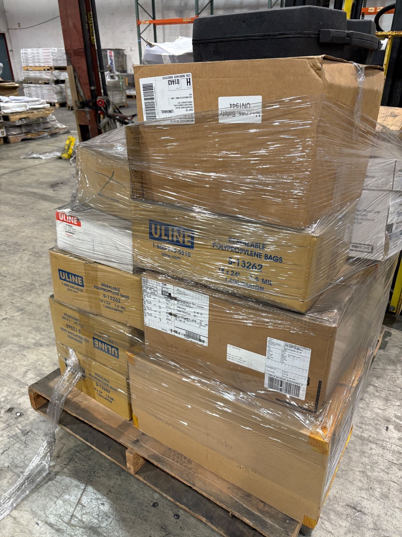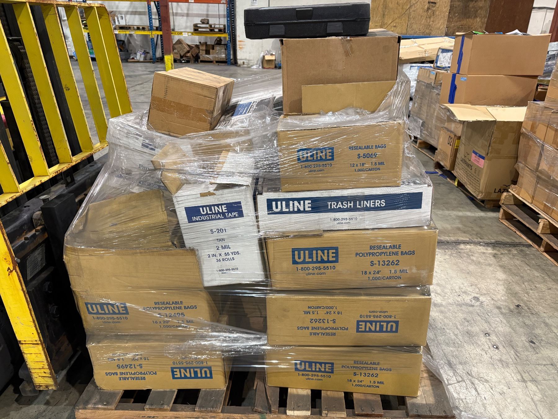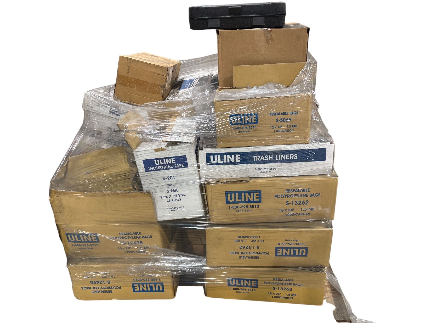 Pallet of Uline office supplies - trash liners, resealable polypropylene Bags, industrial tape, printing paper etc.
