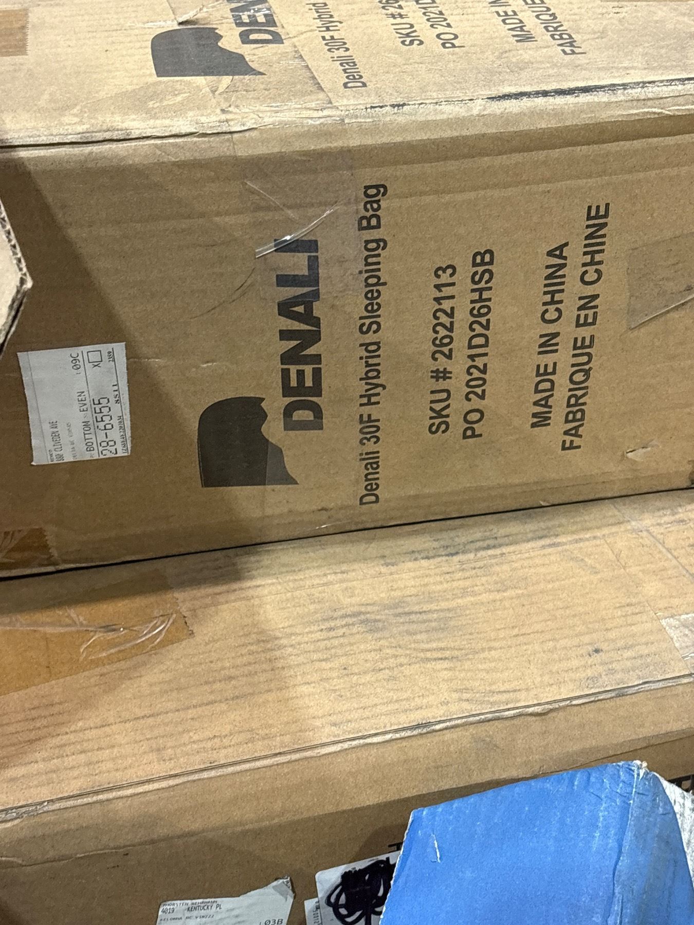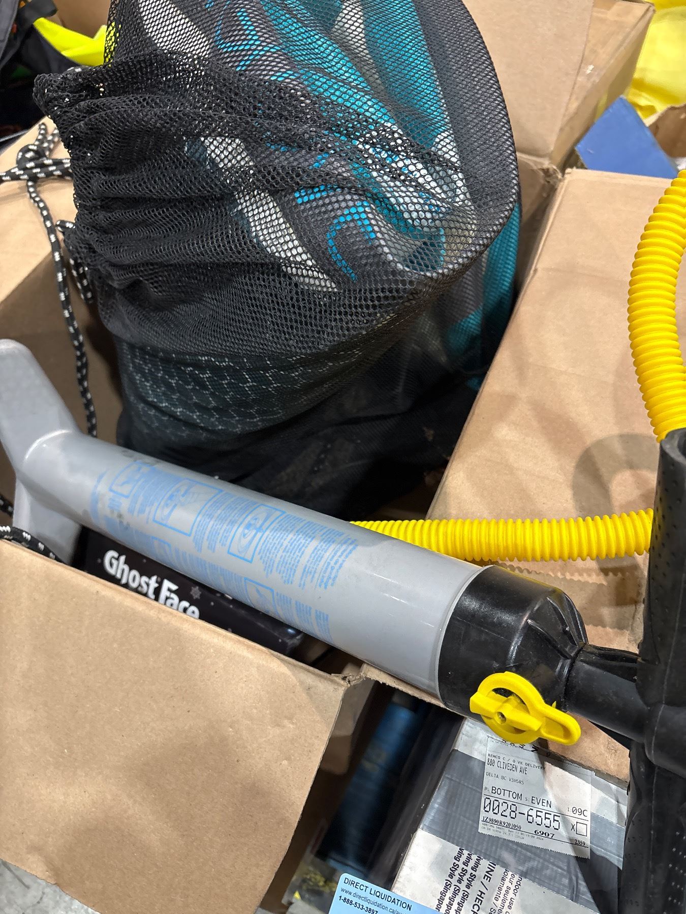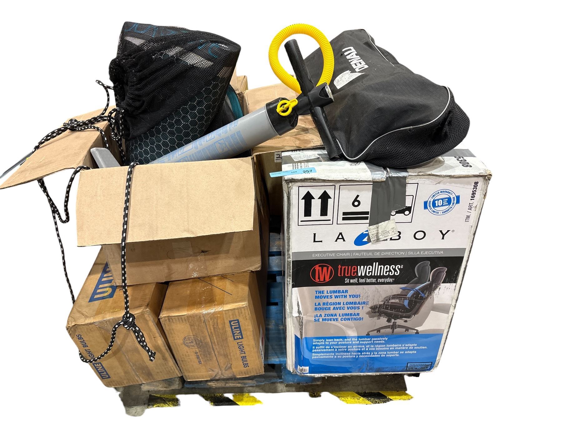 Pallet of assorted Costco return items & misc. - Water Sports rafts & gear, sleeping bag (lazy boy box contains water raft)