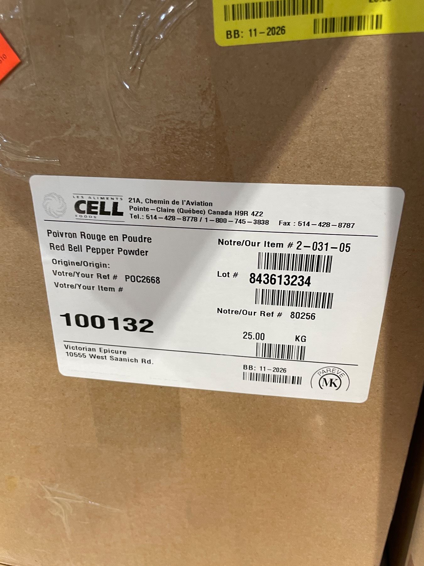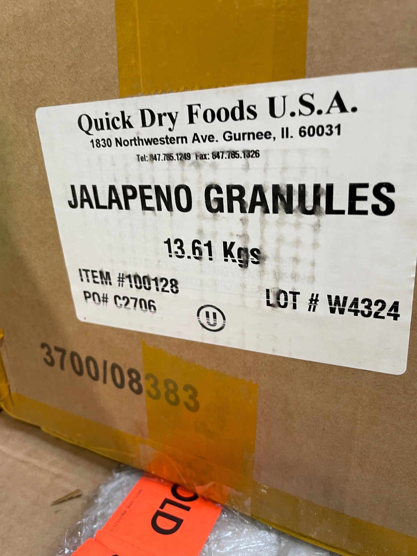 Pallet of assorted Dry foods - includes Jalapeno Granules, Red bell pepper powder, spinach crusher & etc.