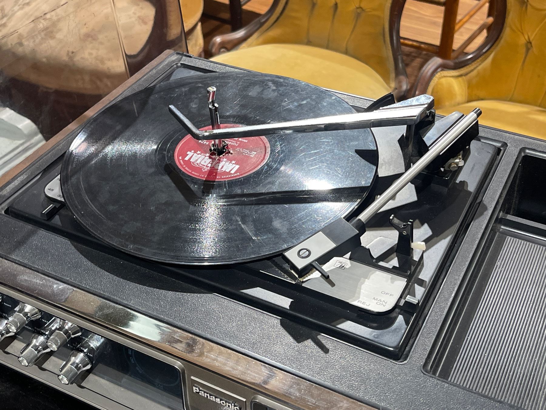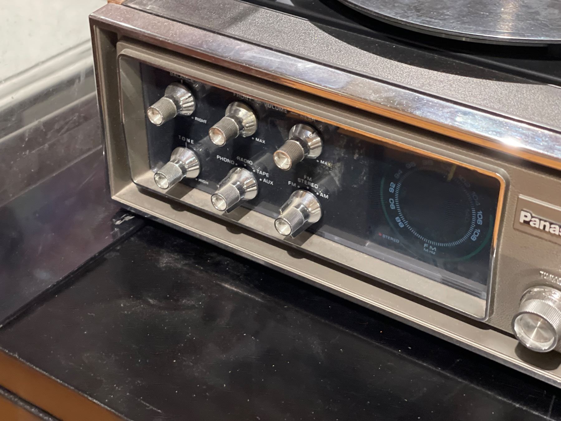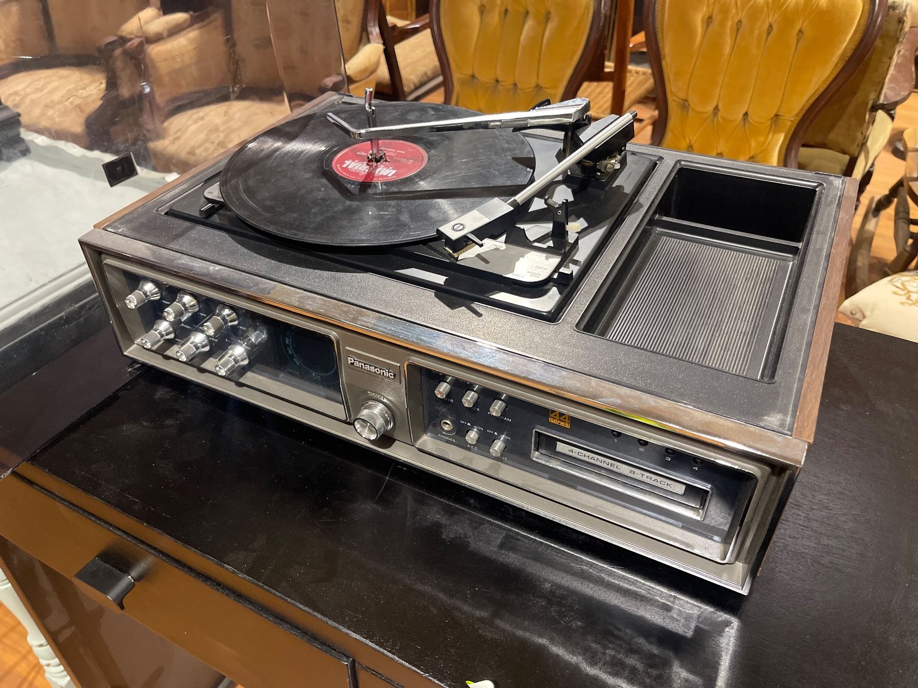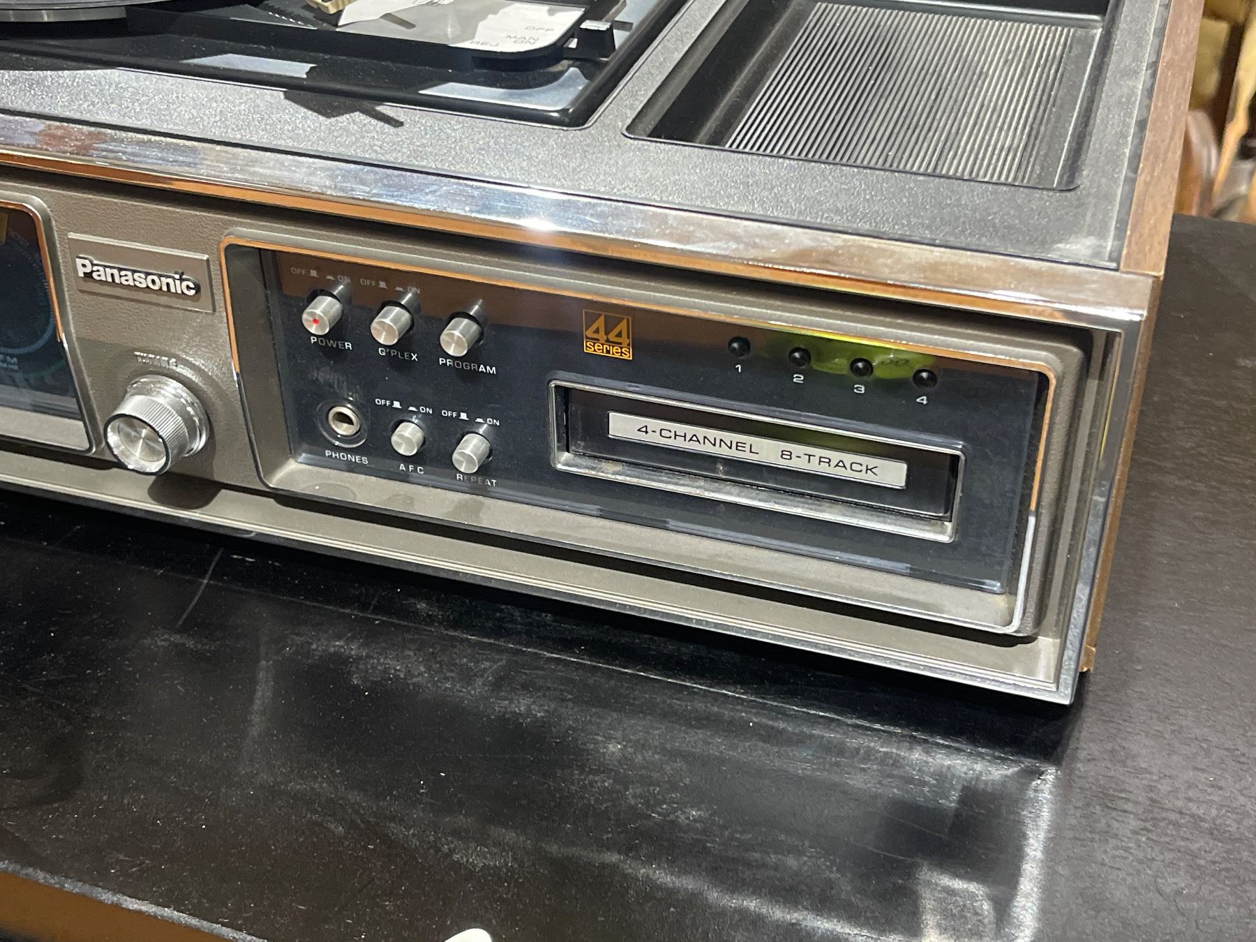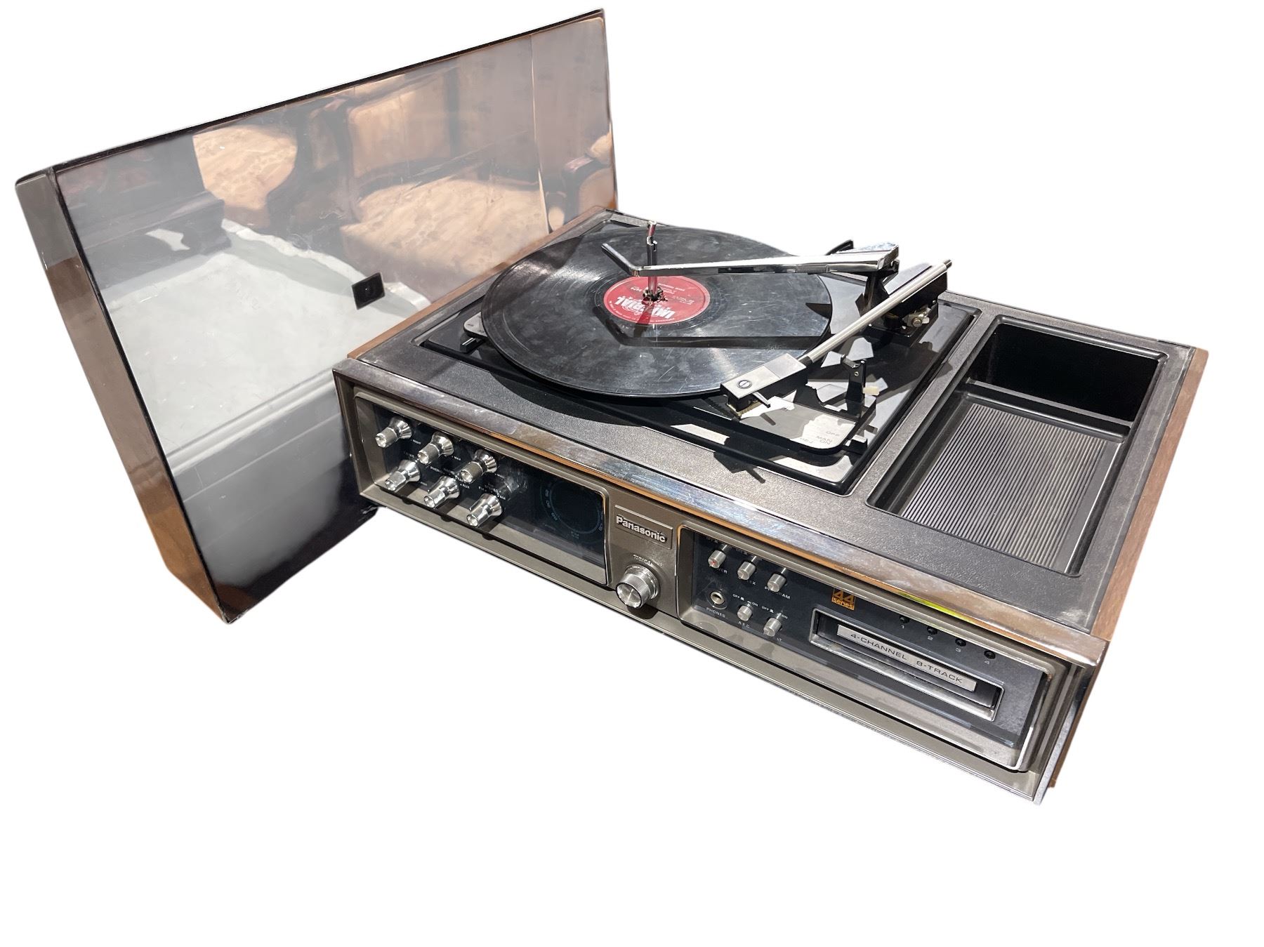 Panasonic SE-4340 from the 1973 'Compact Stereo 44' series. This vintage audio system features a 4-channel quadraphonic 8-track tape player, AM/FM radio, and turntable. Capable of playing both 4-channel and 2-channel 8-track tapes. A notable example of 1970s music center technology. Item is as pictured.