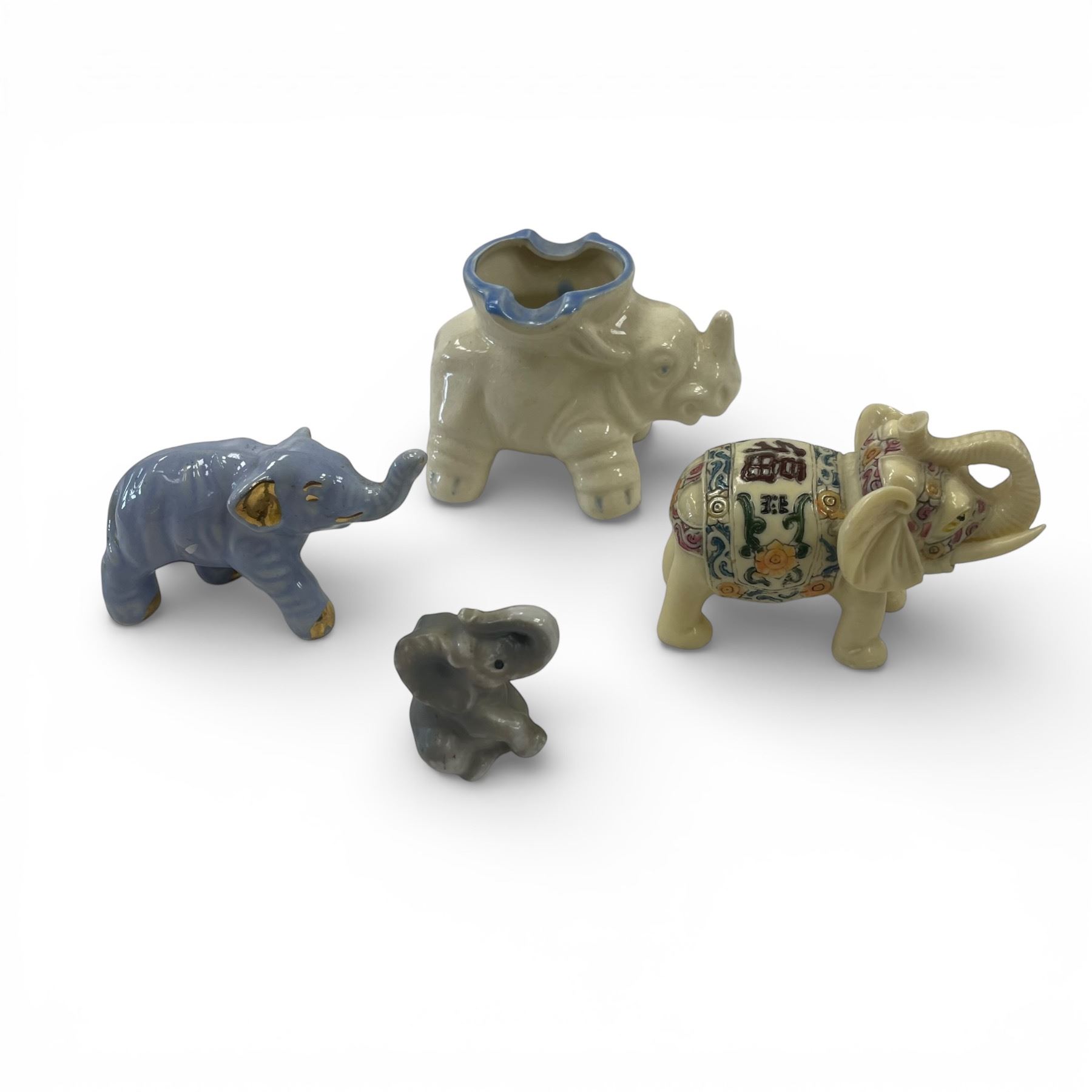 Set includes 4 small elephants made of porcelain and resin. Features Japan-made elephants and a Chinese good luck resin elephant. The tallest measures approximately 3-Inch tall. Item is as pictured.