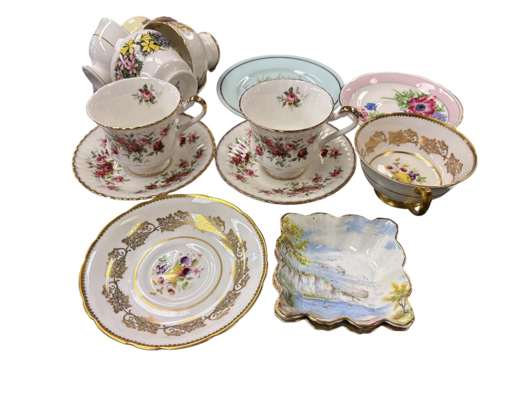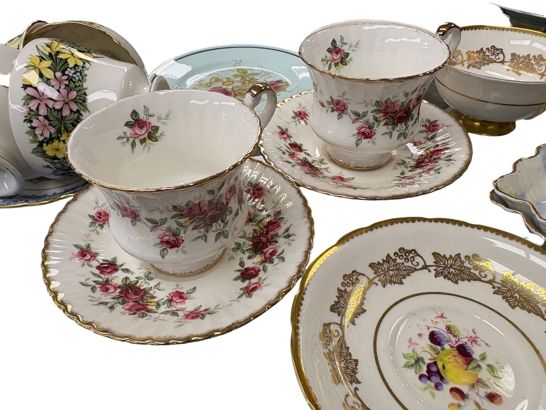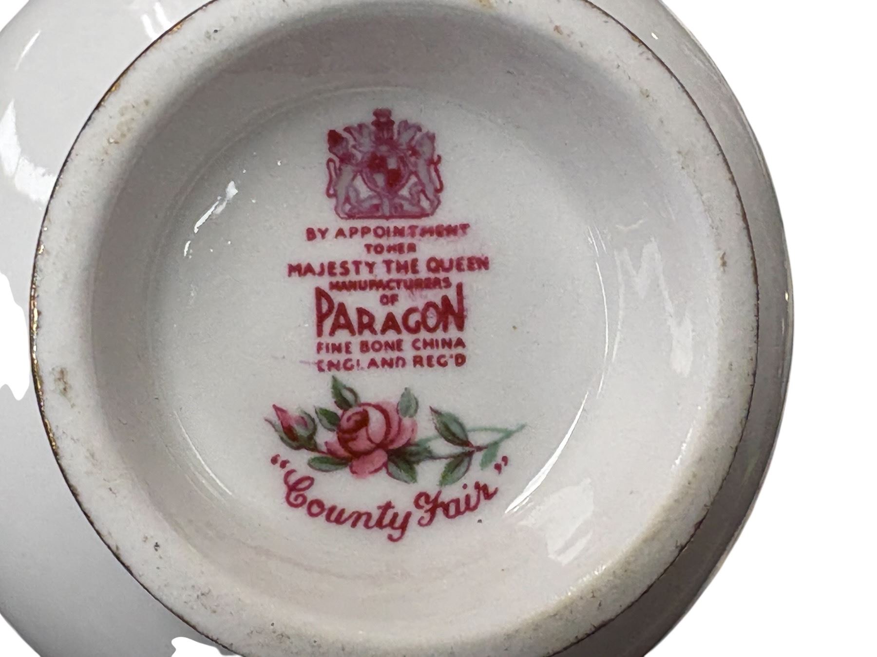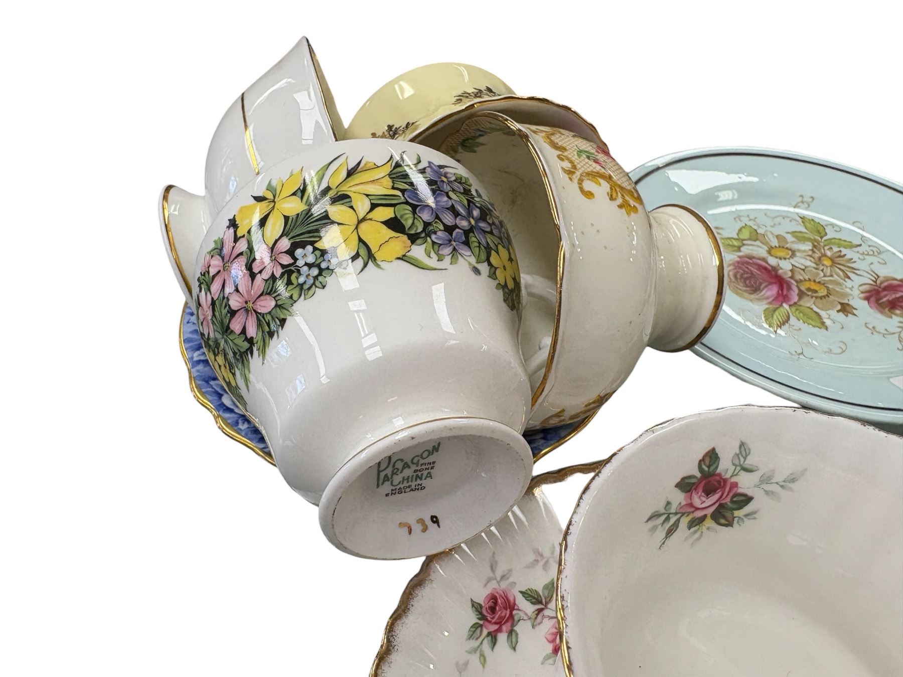 Collection of assorted Paragon tea cups, plates, and saucers. Includes both matched sets and unmatched individual pieces. Paragon, an English fine bone china manufacturer, was known for intricate floral and gilt designs. Exact patterns and quantities unspecified. Ideal for mixed display or set completion.