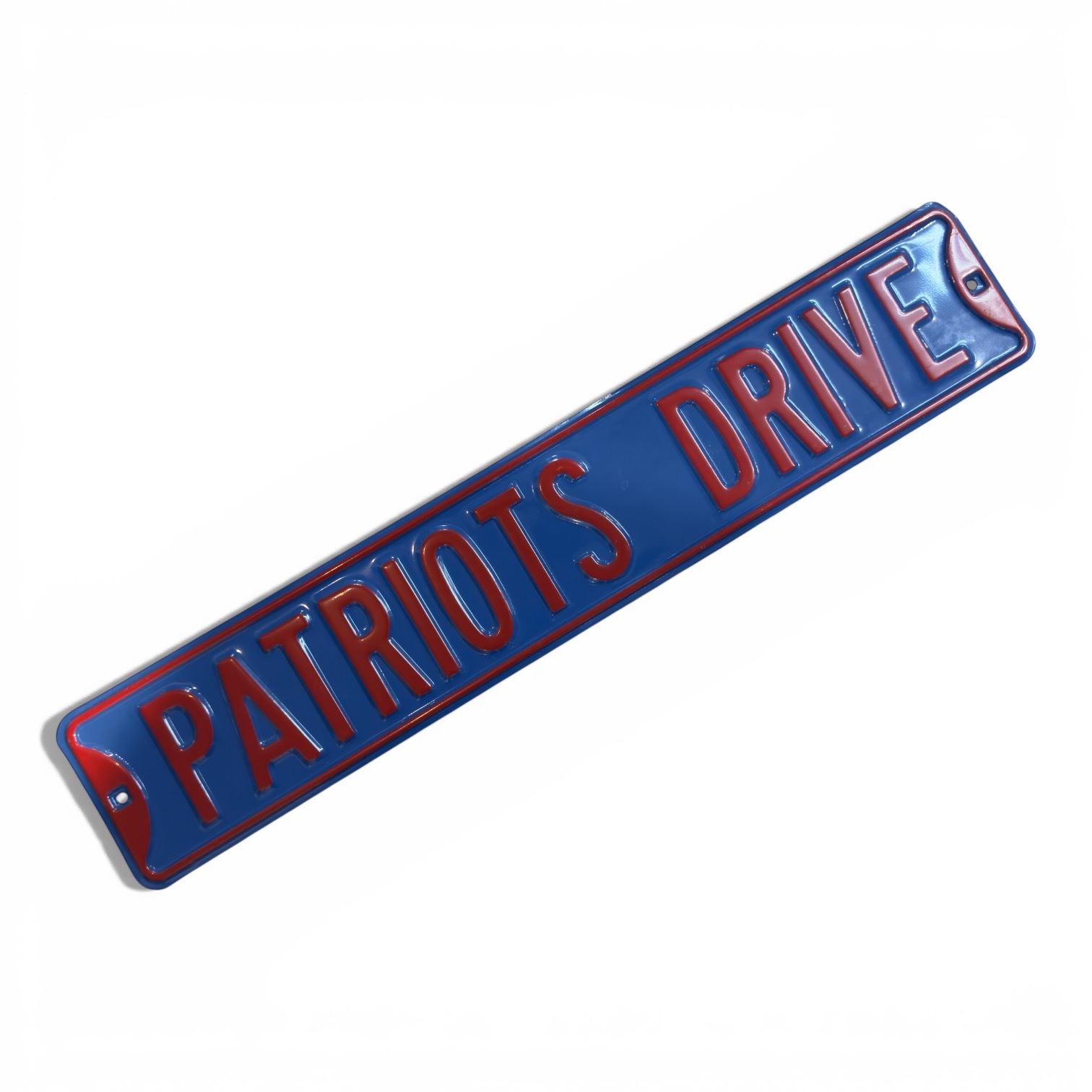 Patriot's Drive street sign made of metal with blue and red color scheme. Measures 32x6-Inch. Suitable for street-style decor or collection purposes. Item is as pictured.