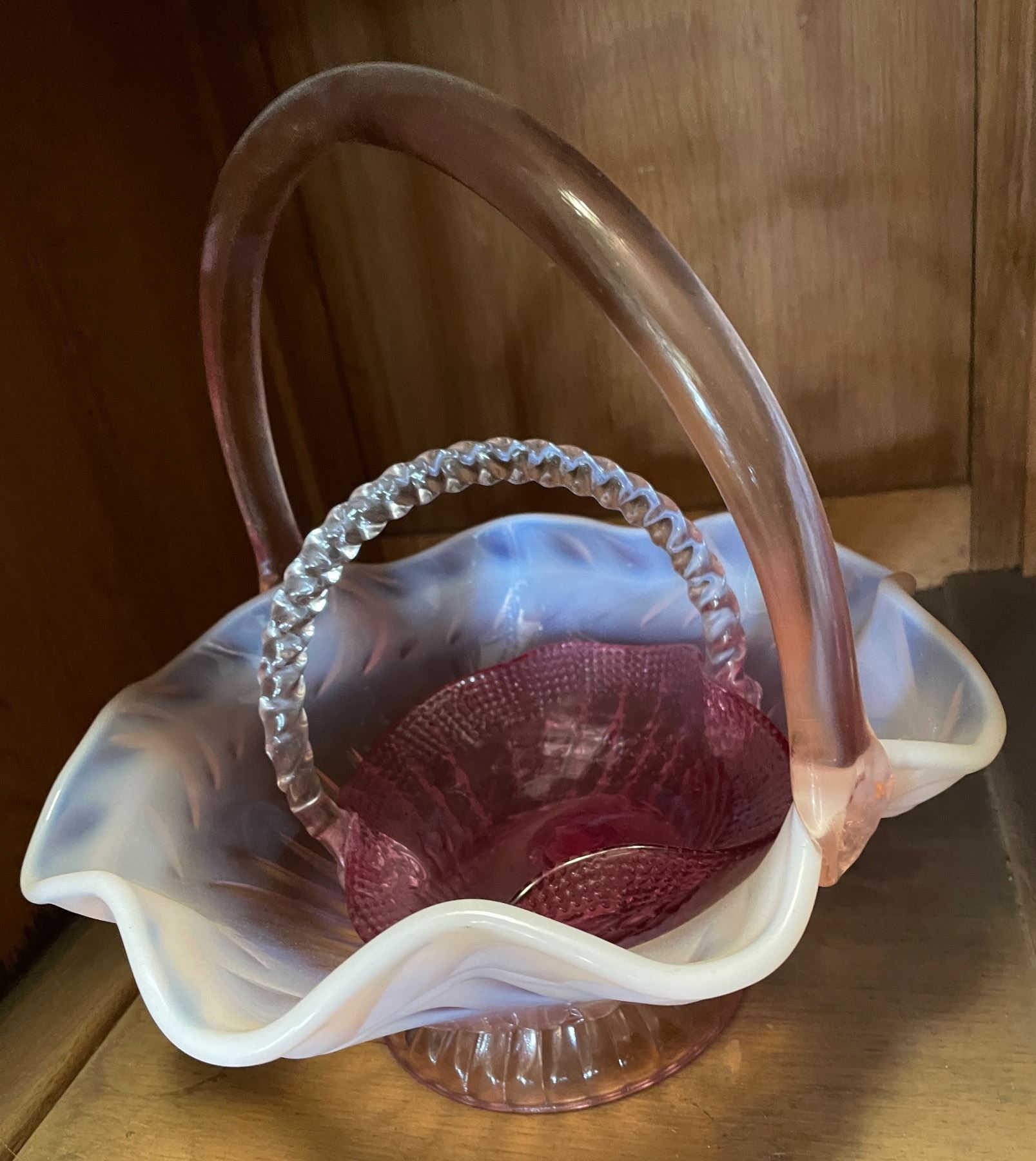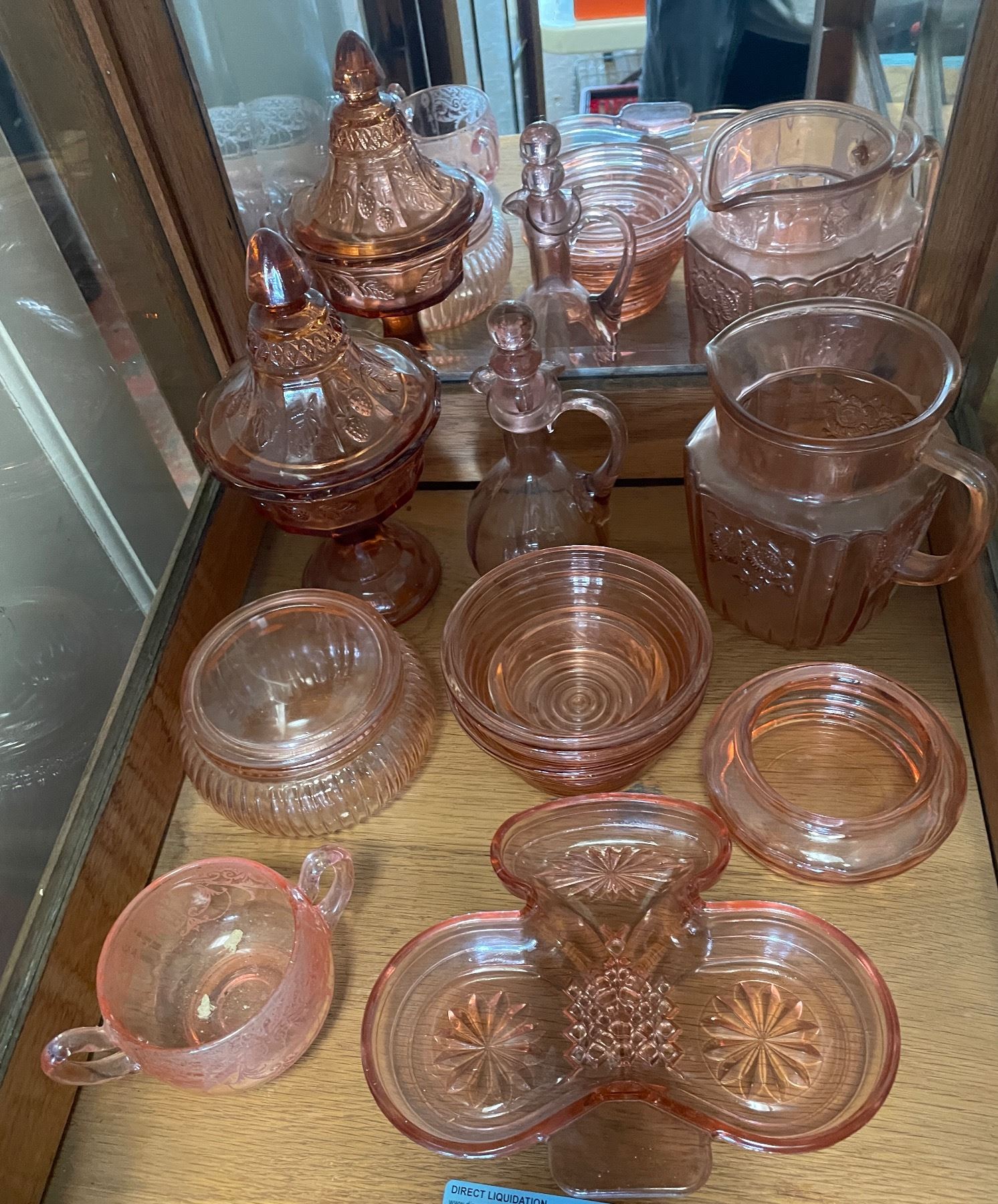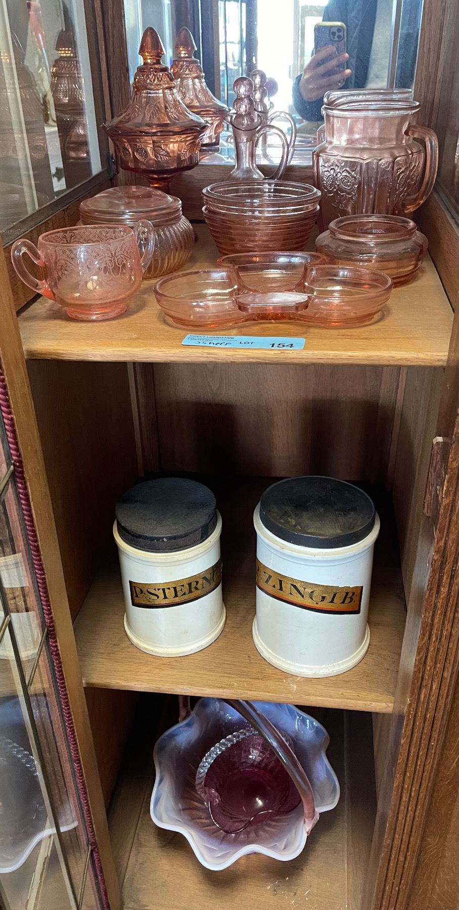 Pink Depression Glass, Apothecary Canisters & Art Glass Basket Group