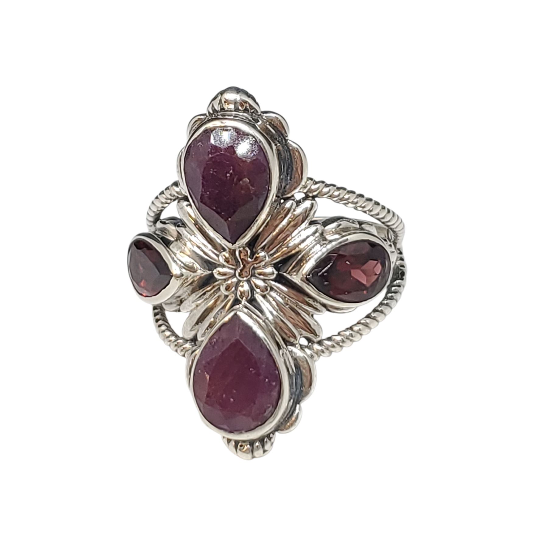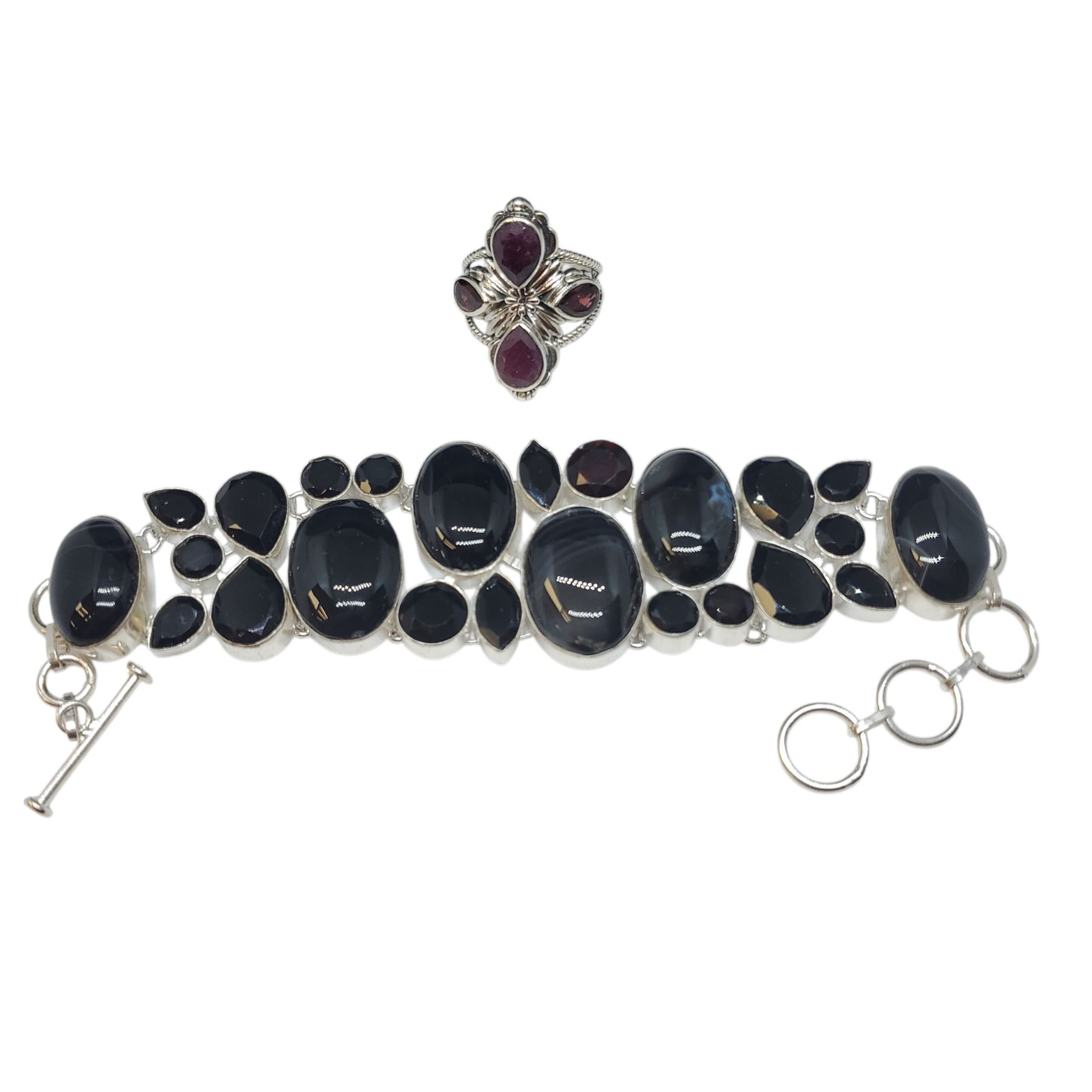 Polished Obsidian & Faceted Dark Garnet Bracelet & Sterling & Garnet Ring - Bracelet is 1.5" wide with a toggle Clasp
