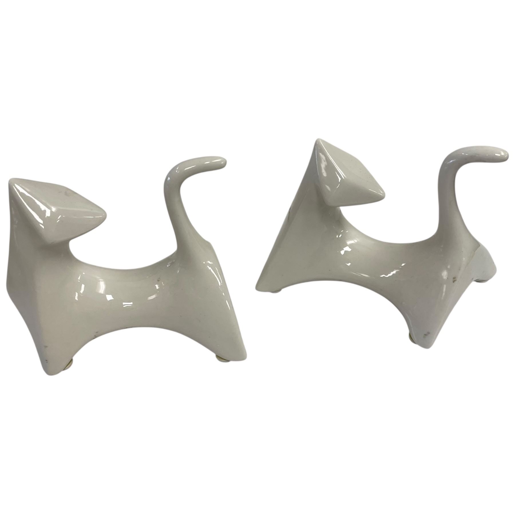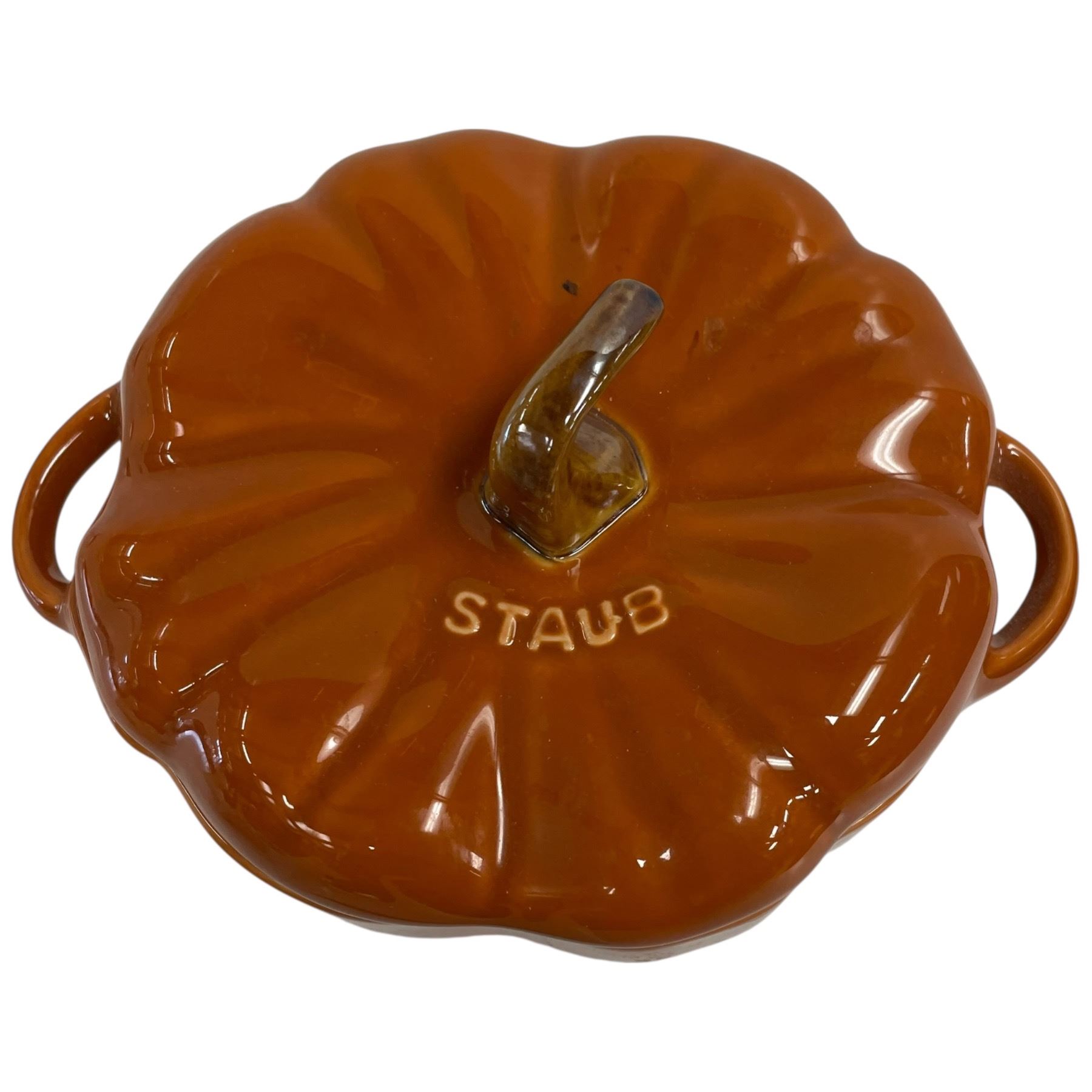 Lot includes porcelain Cat Lady figurines featuring cat designs, Anchor Hocking Milk Glass cake tray, and Staub pumpkin-shaped lidded dish. Each piece is distinct in design and material. Items are as pictured.