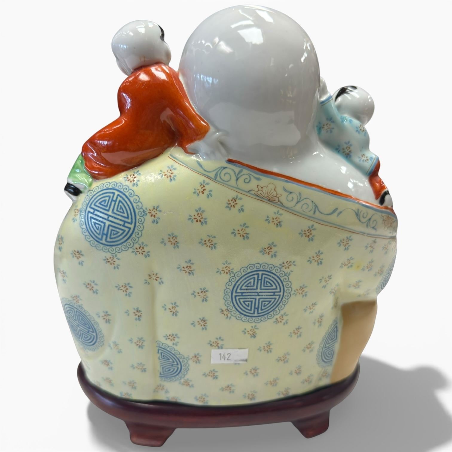 Porcelain Laughing Buddha figurine measuring 10-Inch in height. Depicts Buddha in a joyful pose. Includes a stand as part of the design. Item is as pictured.
