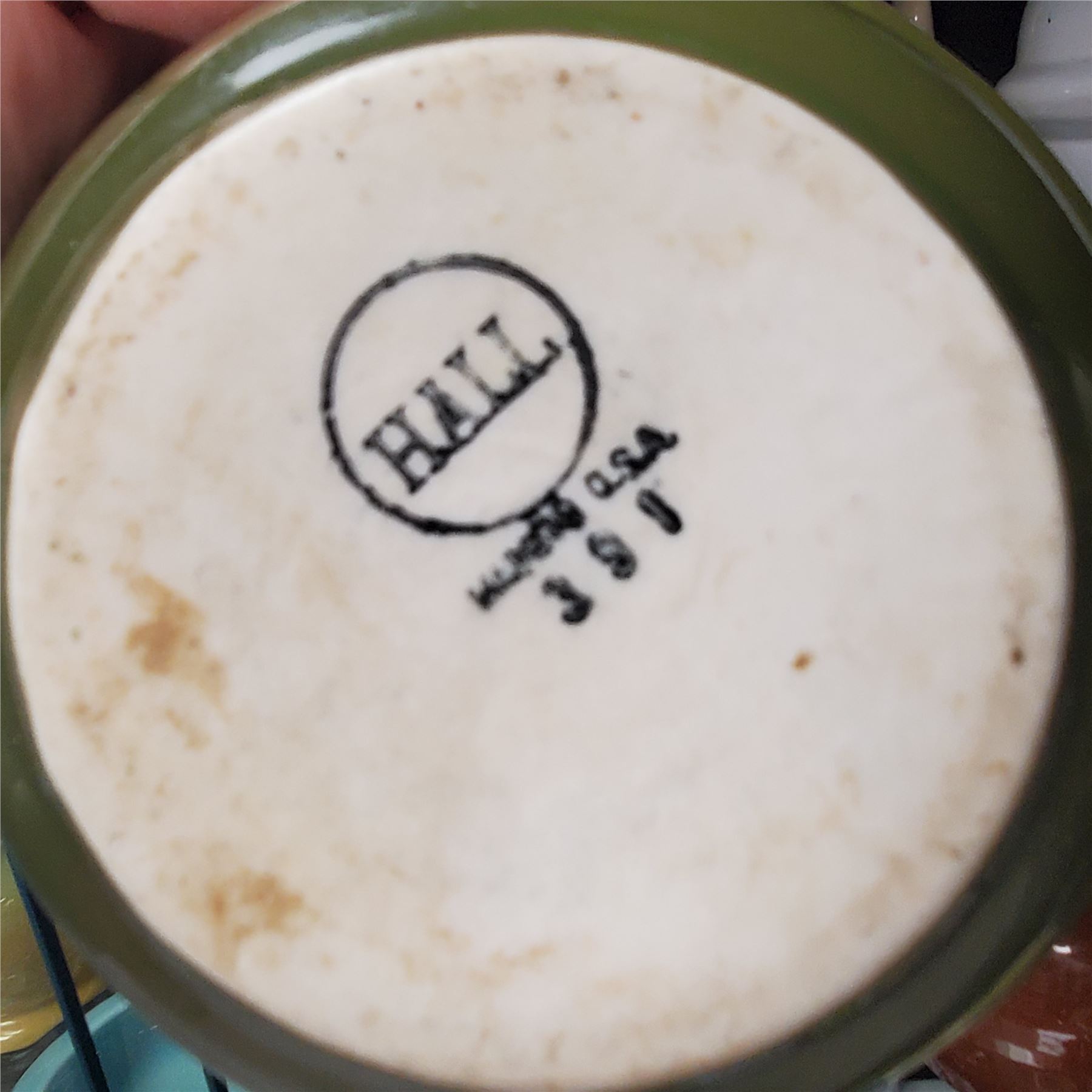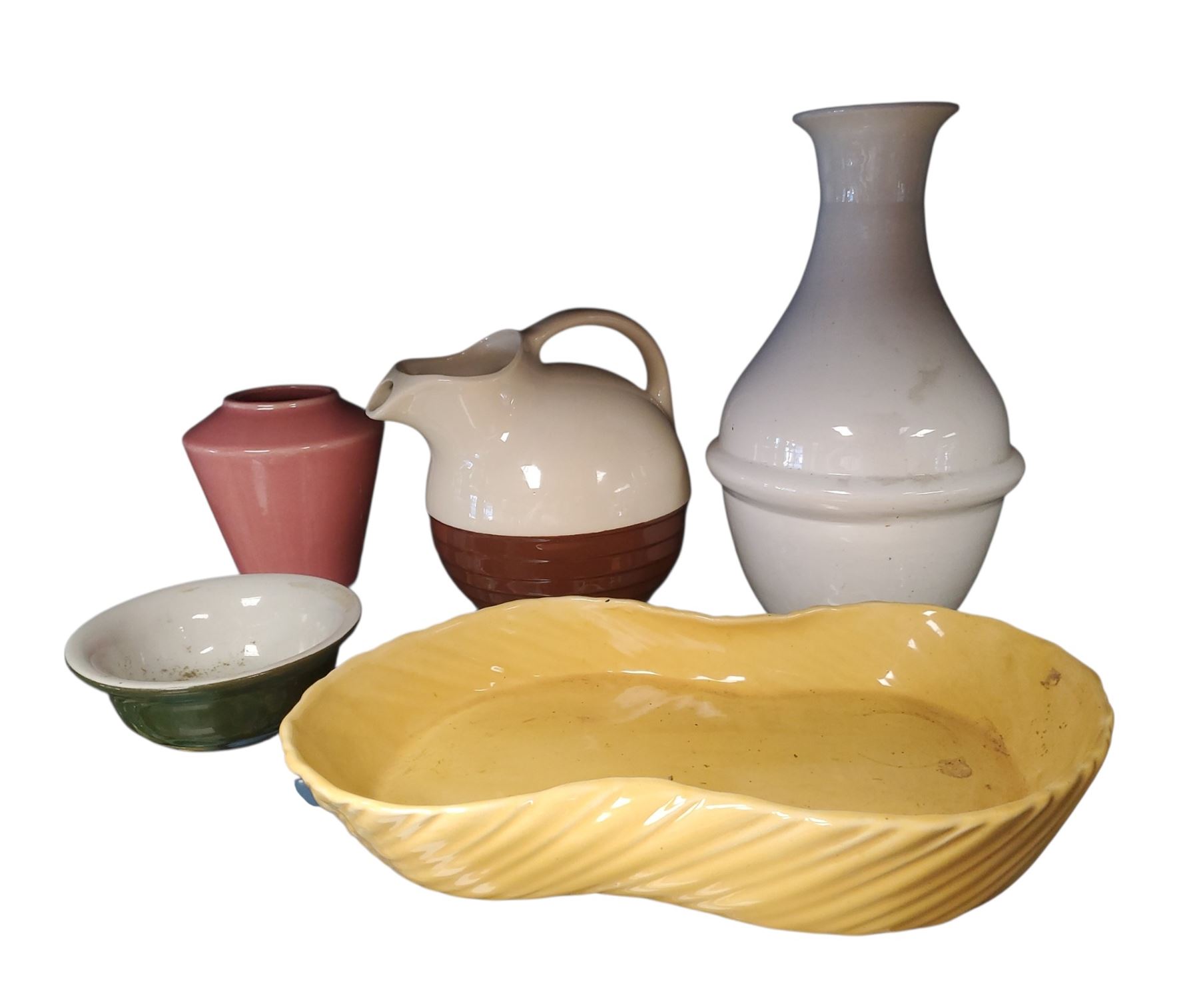 Lot includes various pottery pieces: German pottery, Hall ceramic piece, Bauer pottery, a piece from Homer Laughlin, and a National Brotherhood Operative Potters ball tilt jug. Each item showcases unique craftsmanship from these historic pottery manufacturers. Item is as pictured.