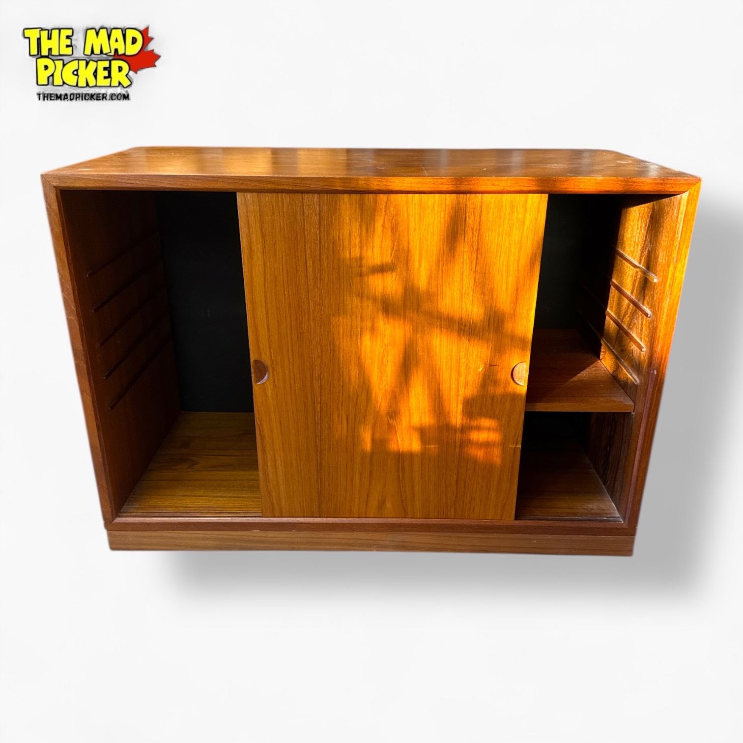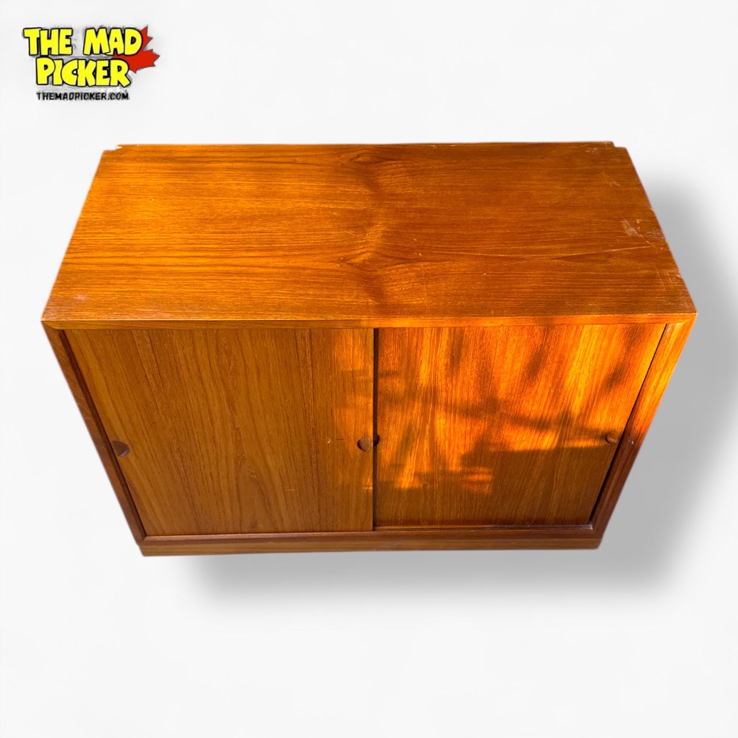Mid-century wall cabinet in the style of Poul Cadovius' Danish Royal System. Made of teak wood, featuring clean, minimalist design. Dimensions: 31.5in x 16in x 22in. Functional and visually distinct, reflecting the modular furniture trends of the 1950s-1960s.