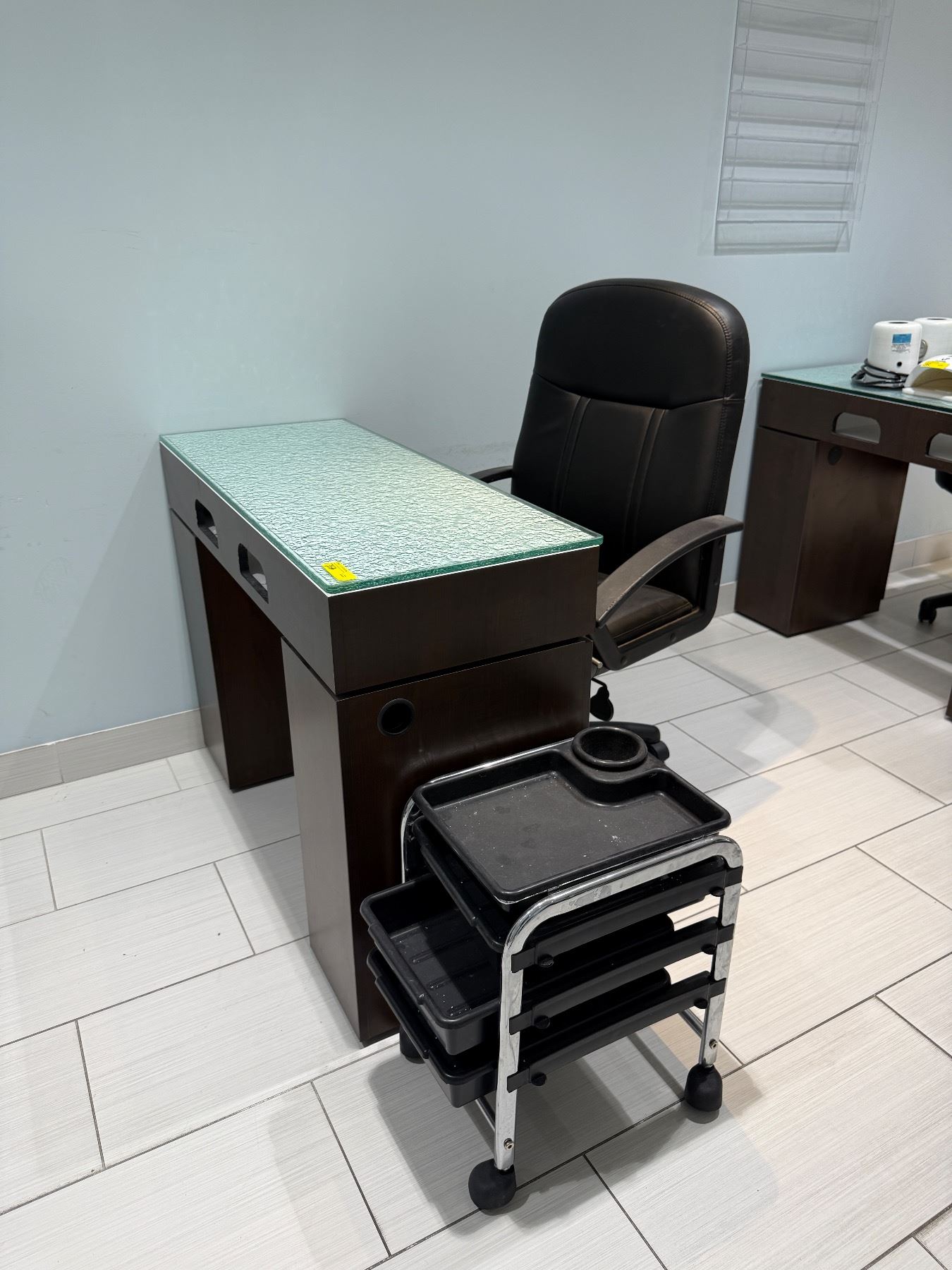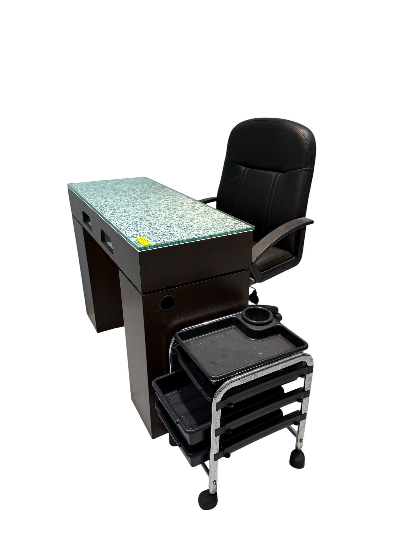 Professional Manicure Station Set - Glass Top Nail Desk, Rolling Technician Chair & Storage Trolley