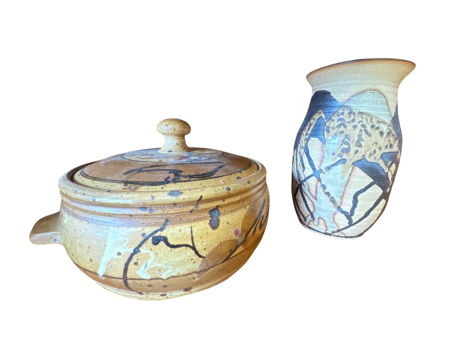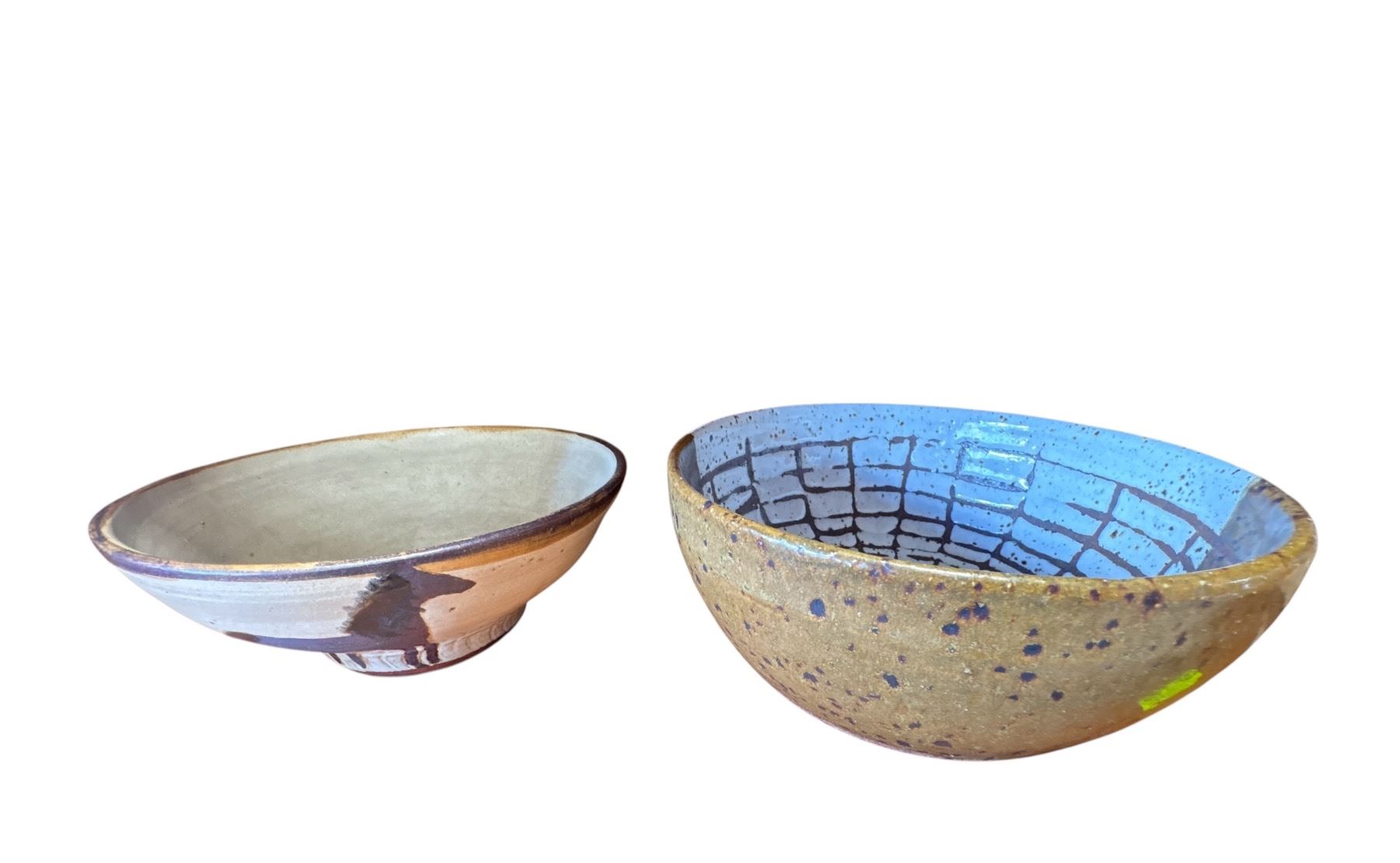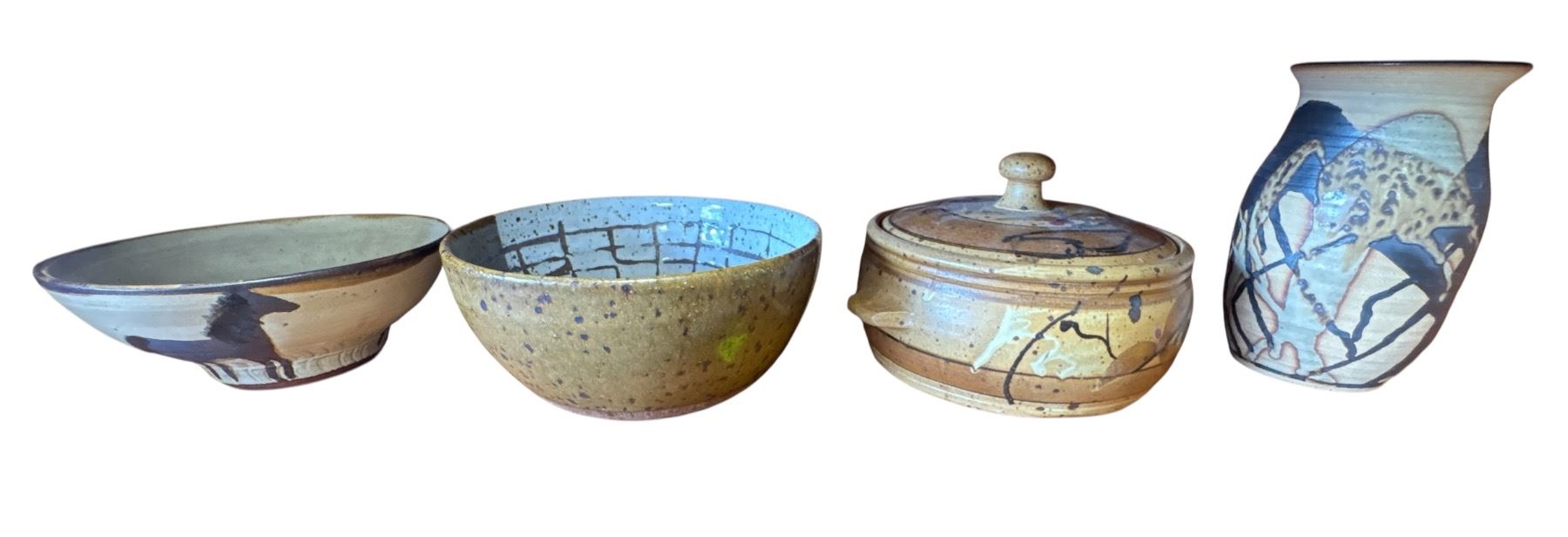 Quartet of 4 pottery pieces including bowls and vases. The tallest piece measures 8.25 inches in height. Item is as pictured, showcasing distinct pottery forms and designs. Exact origin and maker unspecified.