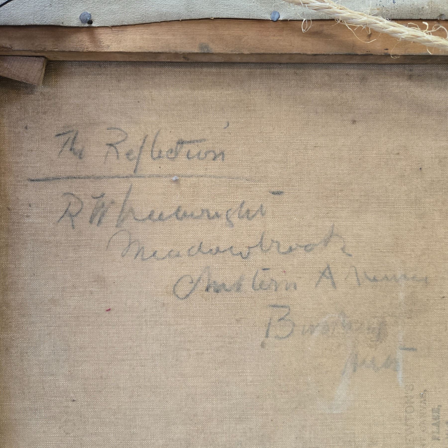 Original fine art piece titled 'The Reflection' by R. Wheelwright. The artwork is framed and features a serene depiction of a woman by the water. Framed piece measures x24-Inch as specified. Item is as pictured. Appraised value is $3500.