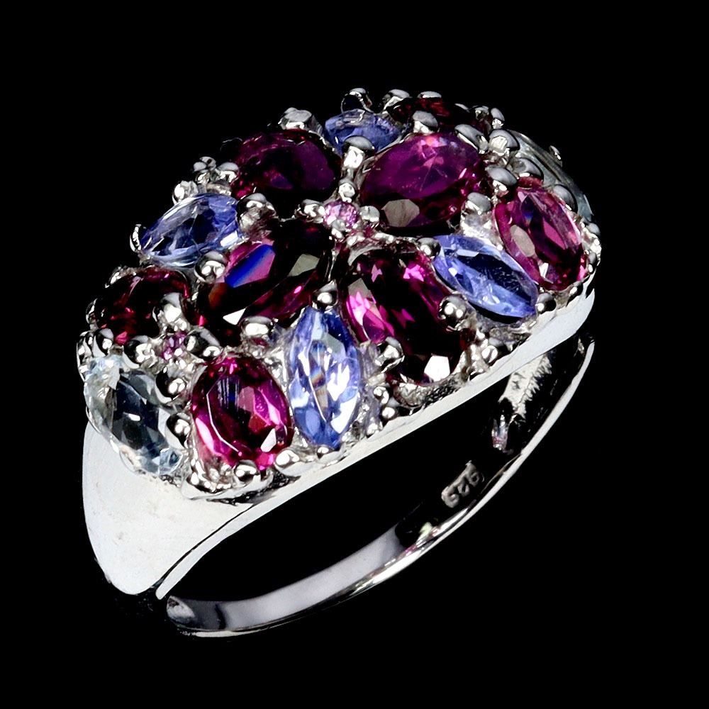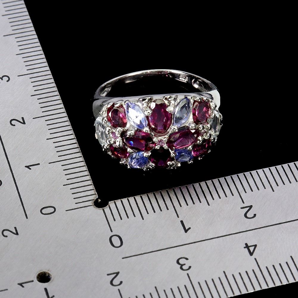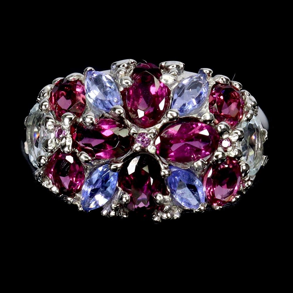 RHODOLITE GARNET AND AQUAMARINE RING IN 14K WHITE GOLD PLATED OVER 925 STERLING SILVER - SIZE 7 - APPRAISED REPLACEMENT VALUE CAD 700