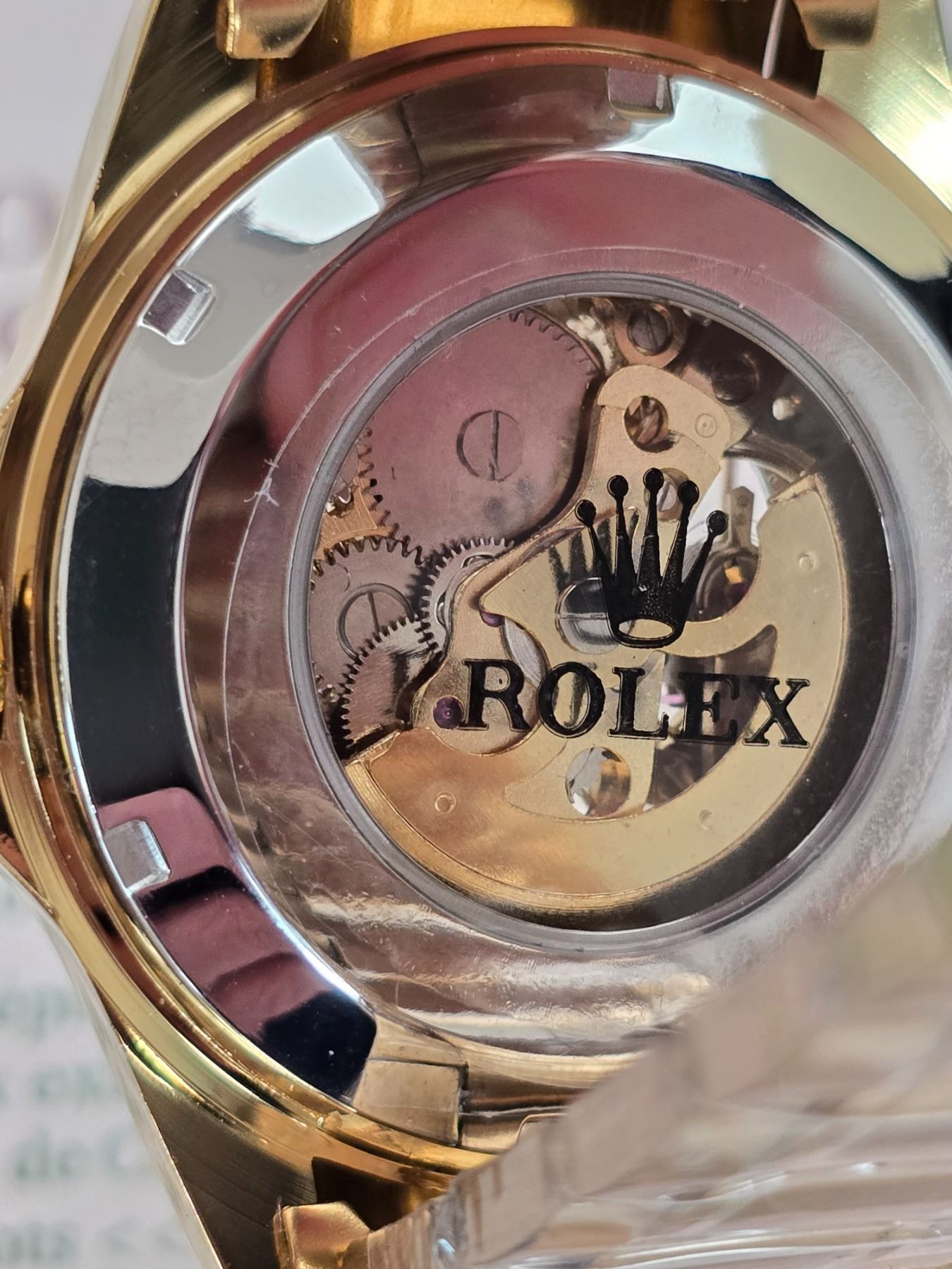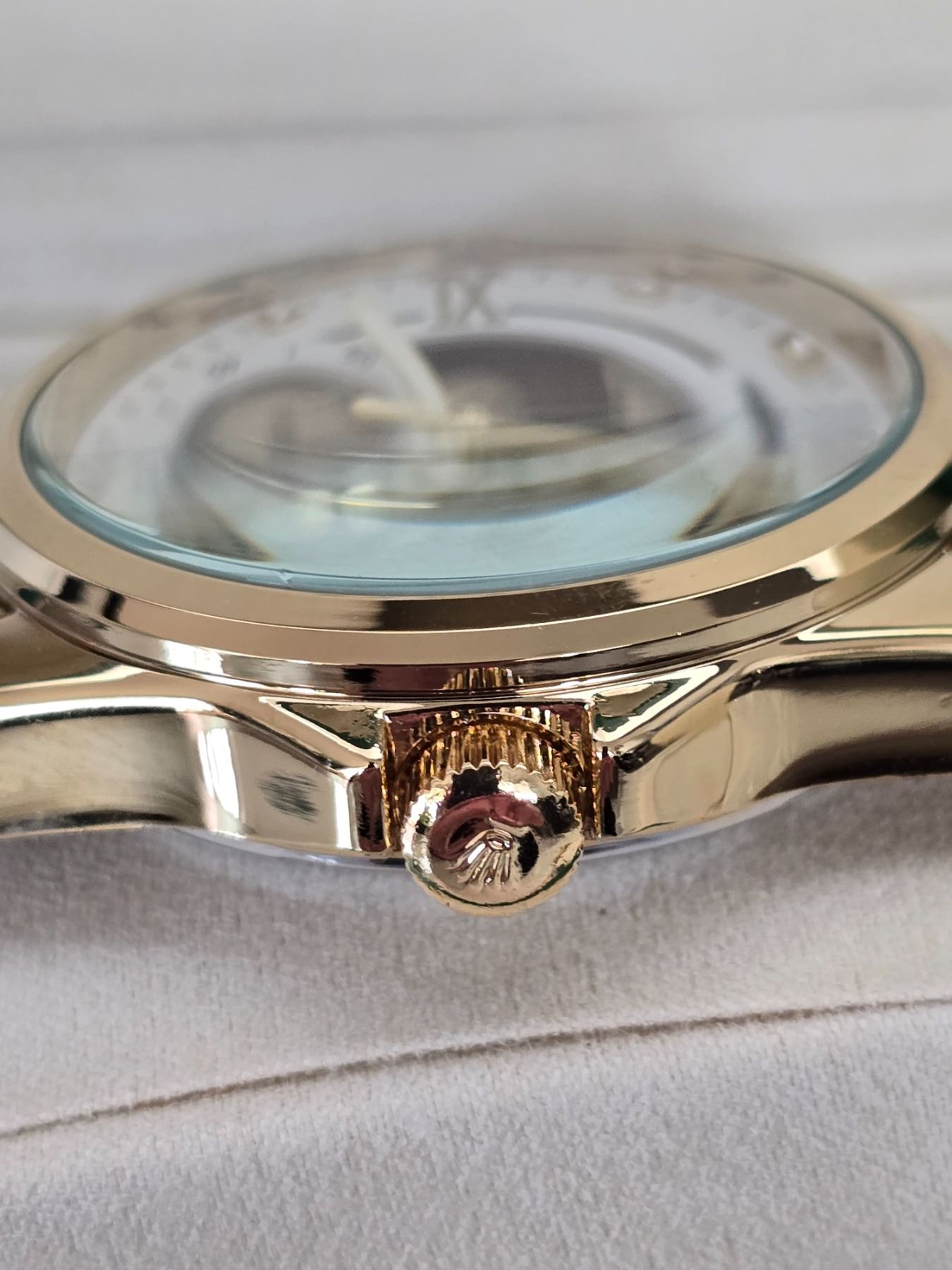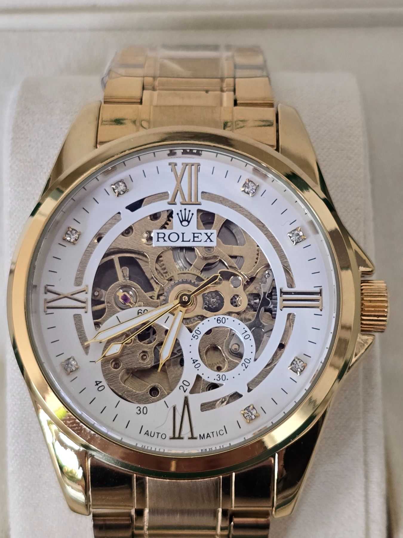 ROLEX DATE JUST 40 MM FULLY AUTOMATIC BRIGHT WHITE SKELETON DIAL ROLEX HIGH QUALITY REPLICA WATCH. ORIGINAL HAS 18K YELLOW GOLD CASE AND OYSTER BRACELET. 904 L STAINLESS STEEL USED – THE SAME STEEL USED IN AUTHENTIC ROLEX WATCHES. FULL SET WITH BOX, PAPERS AND BAG.
