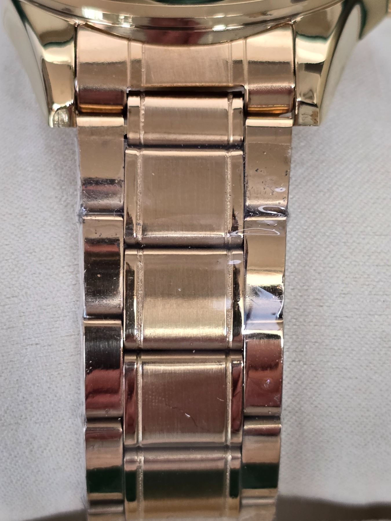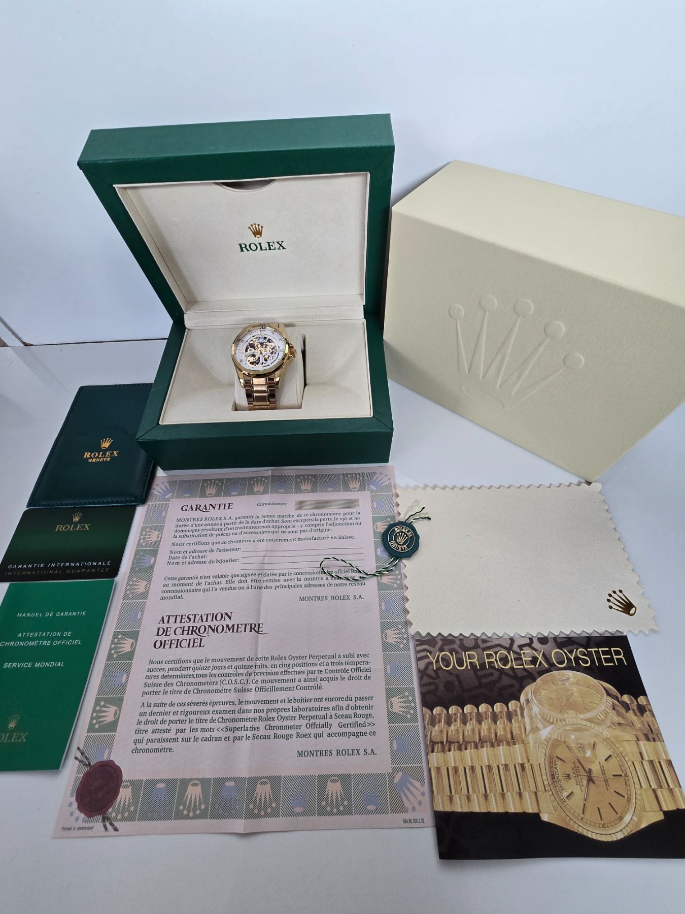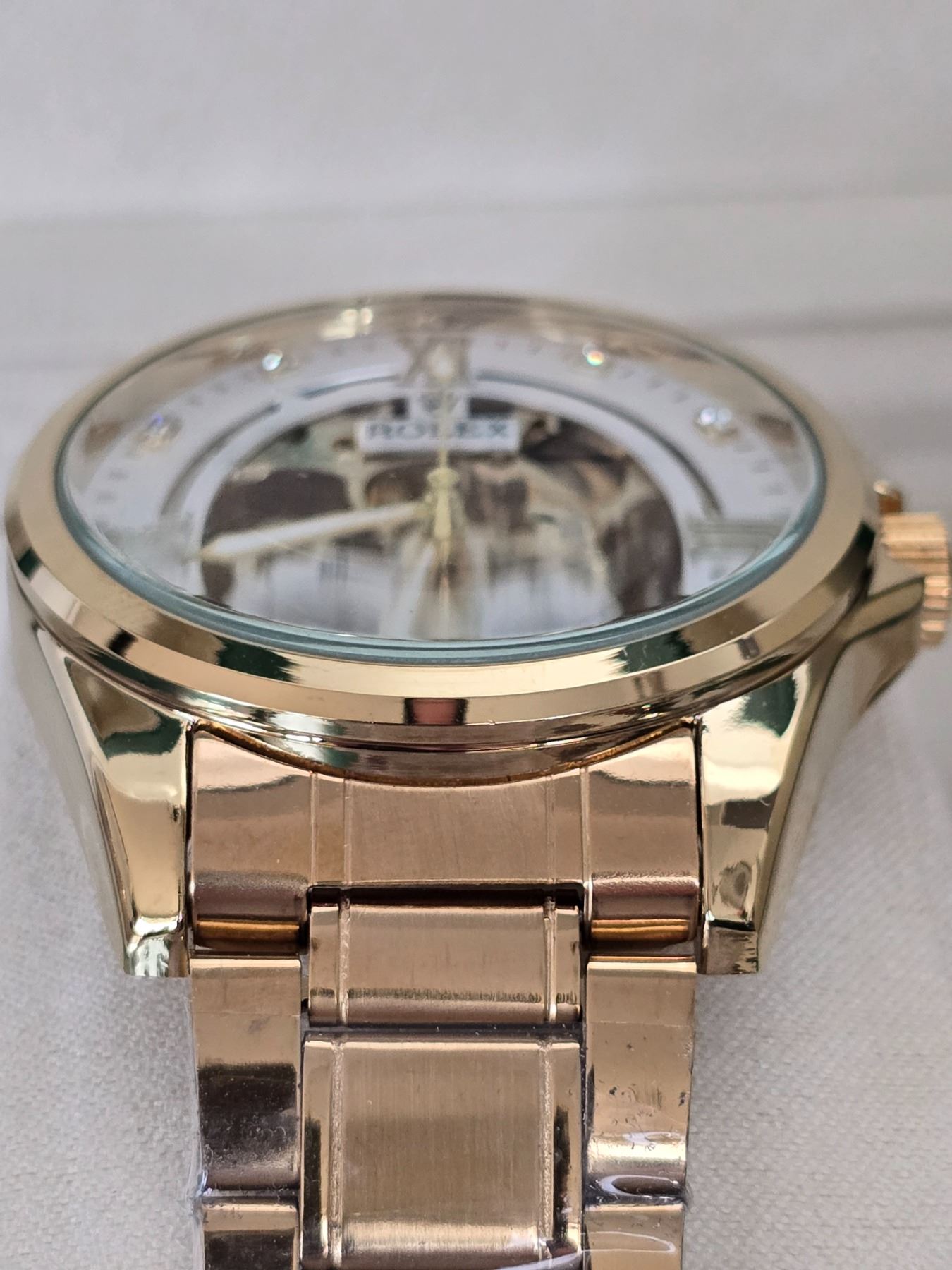 ROLEX DATE JUST 40 MM FULLY AUTOMATIC BRIGHT WHITE SKELETON DIAL ROLEX HIGH QUALITY REPLICA WATCH. ORIGINAL HAS 18K YELLOW GOLD CASE AND OYSTER BRACELET. 904 L STAINLESS STEEL USED – THE SAME STEEL USED IN AUTHENTIC ROLEX WATCHES. FULL SET WITH BOX, PAPERS AND BAG.