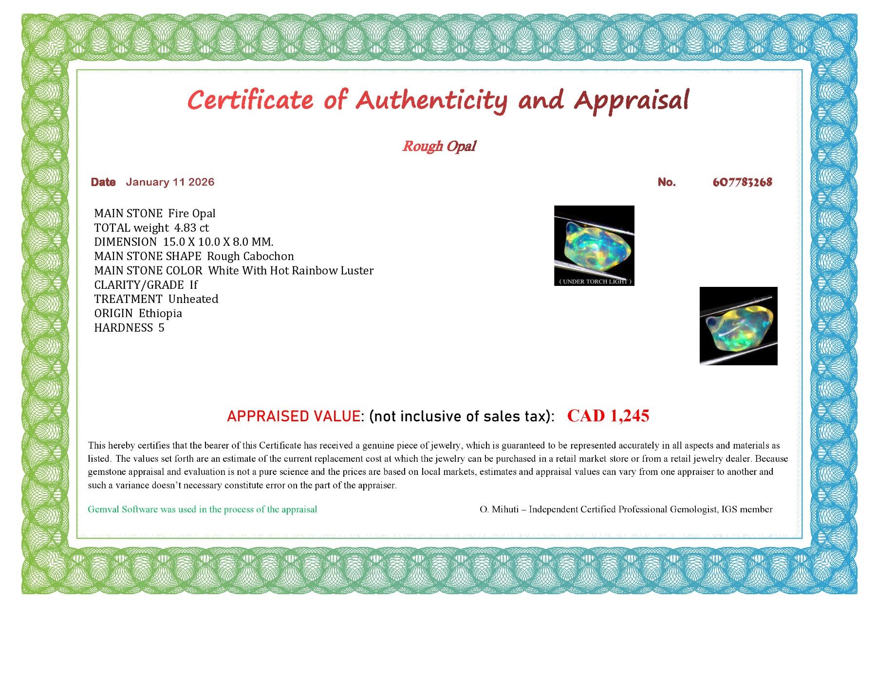 ROUGH 4.83 CARATS AAA FLORAL FLASH PLAY OF COLOR ETHIOPIAN CRYSTAL FIRE OPAL 15X10 mm - APPRAISED REPLACEMENT VALUE CAD 1,245