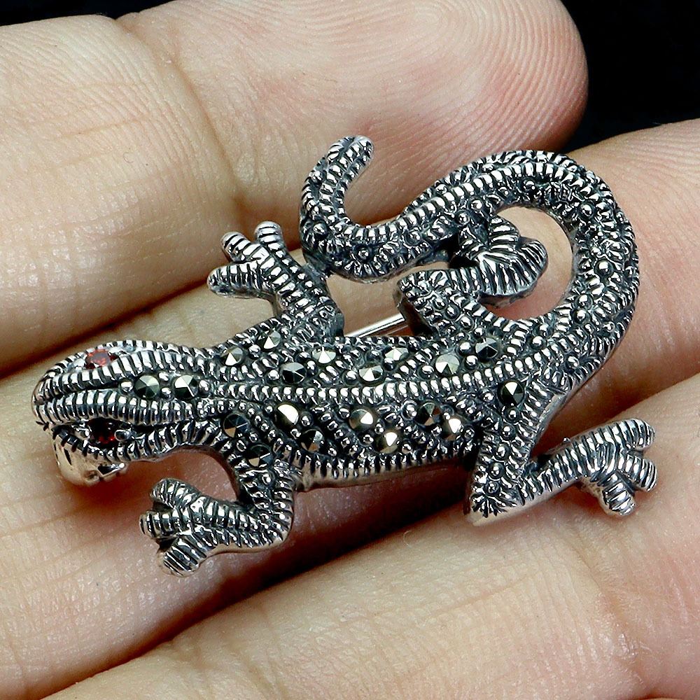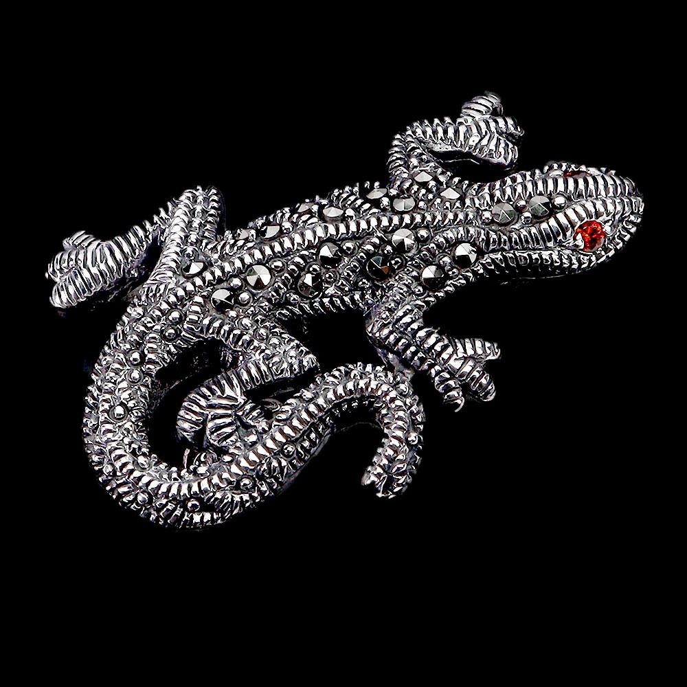 ROUND CUT MARCASITE AND CZ LIZARD SHAPPED BROOCH IN 925 STERLING SILVER
