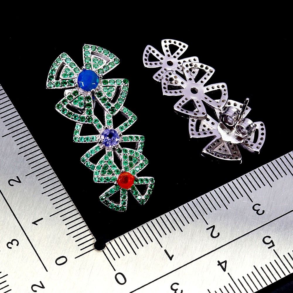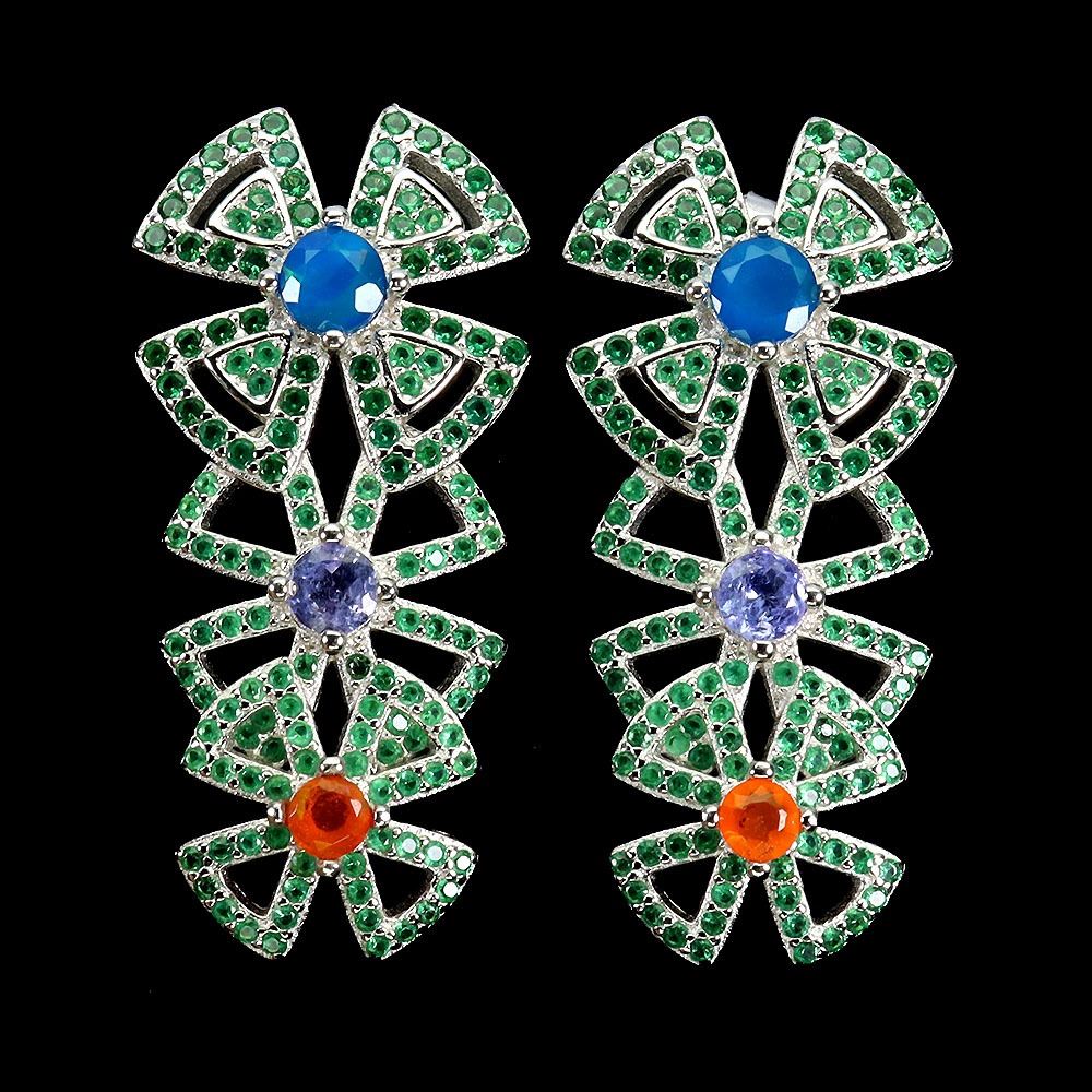 ROUND ORANGE OPAL, BLUE OPAL, TANZANITE AND GREEN CZ EARRINGS IN 14K WHITE GOLD PLATED OVER 925 STERLING SILVER - APPRAISED REPLACEMENT VALUE CAD 1,070