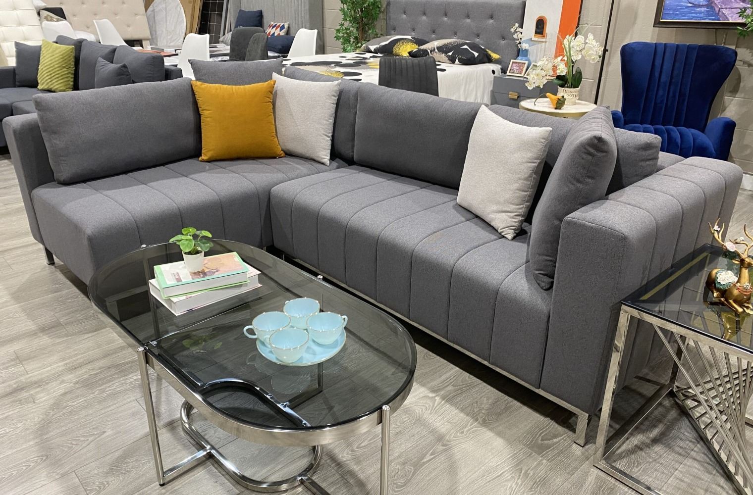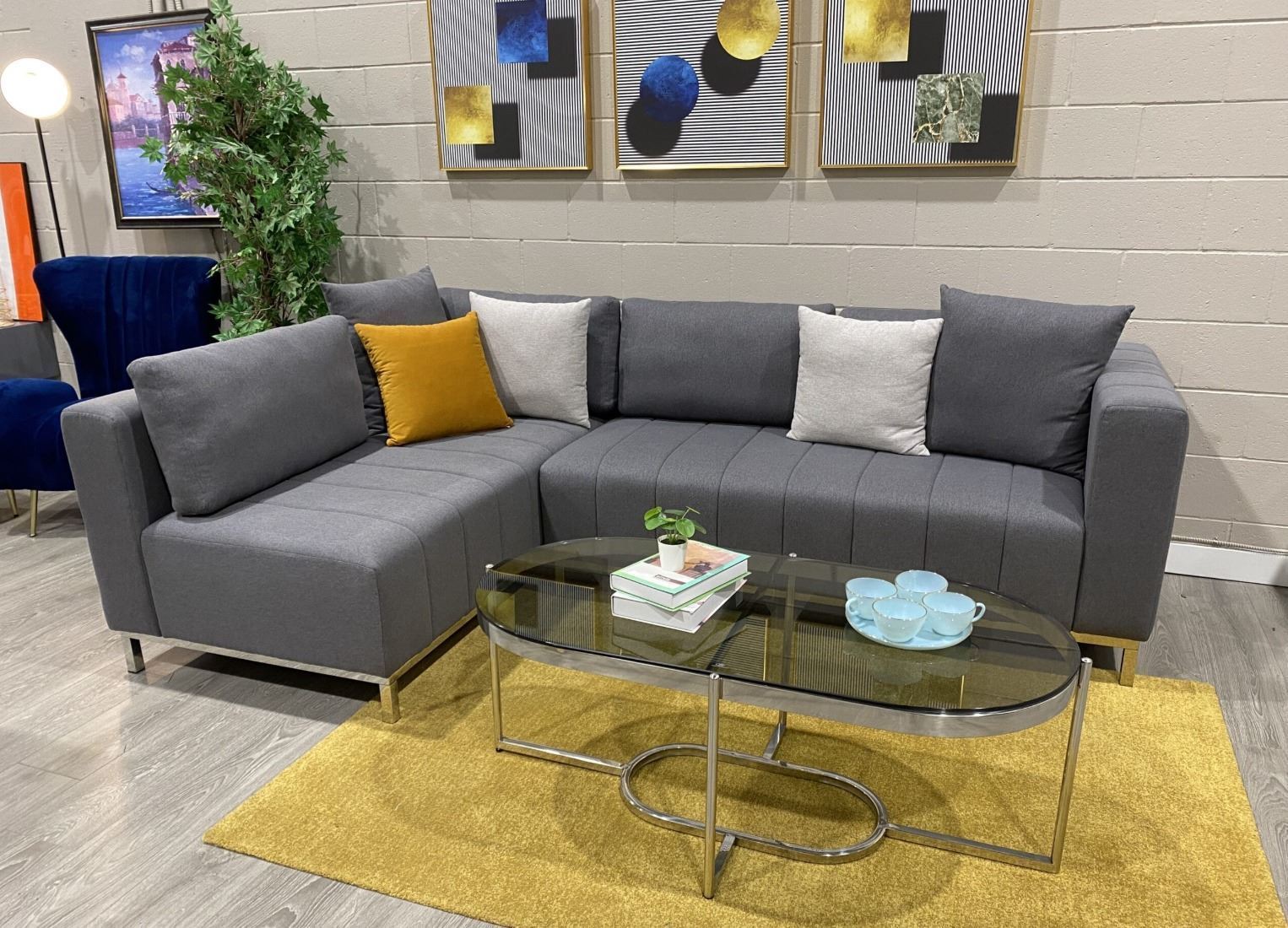 RS NEW Andrew Dark Grey L-Shape Sectional Couch - Retails: $2299 modern art meets midcentury design in this highquality sectional couch. Size approx 100L x 36D x 35H with chaise 68; colour grey with right or left chaise. Selected variant: Dark Grey. - Located in store