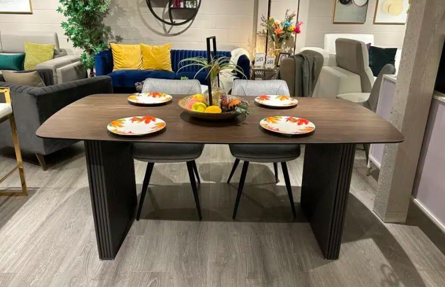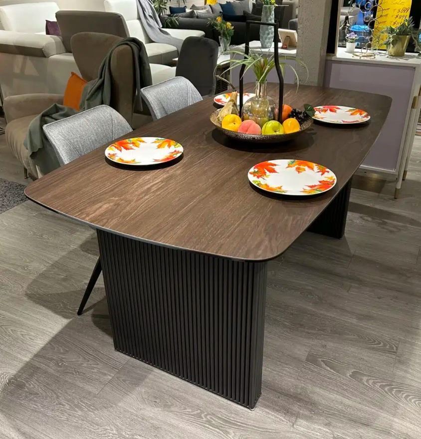 RS NEW Iris 71" Sintered-Stone Dining Table - Retails: $1699 modern oval wood colour dining table with sintered stone top and solid metal base. Scratch, stain and heat resistant. Available in 63or 71 length. Selected variant: 71". - Located in store