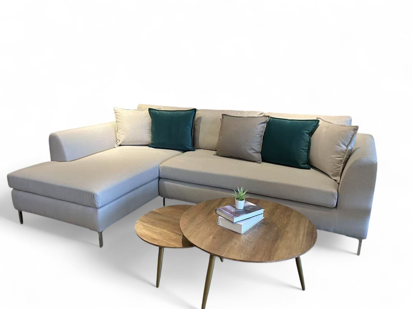 RS NEW Leonardo Left Hand Facing Sectional Couch - Retails: $2699 - modern fabric sectional couch with wide chaise. Approx size 108L (sidetoside) with chaise 68long and 50wide; colour beige or dark grey; chaise direction left or right. Selected variant: Left Hand Facing. - Located in store