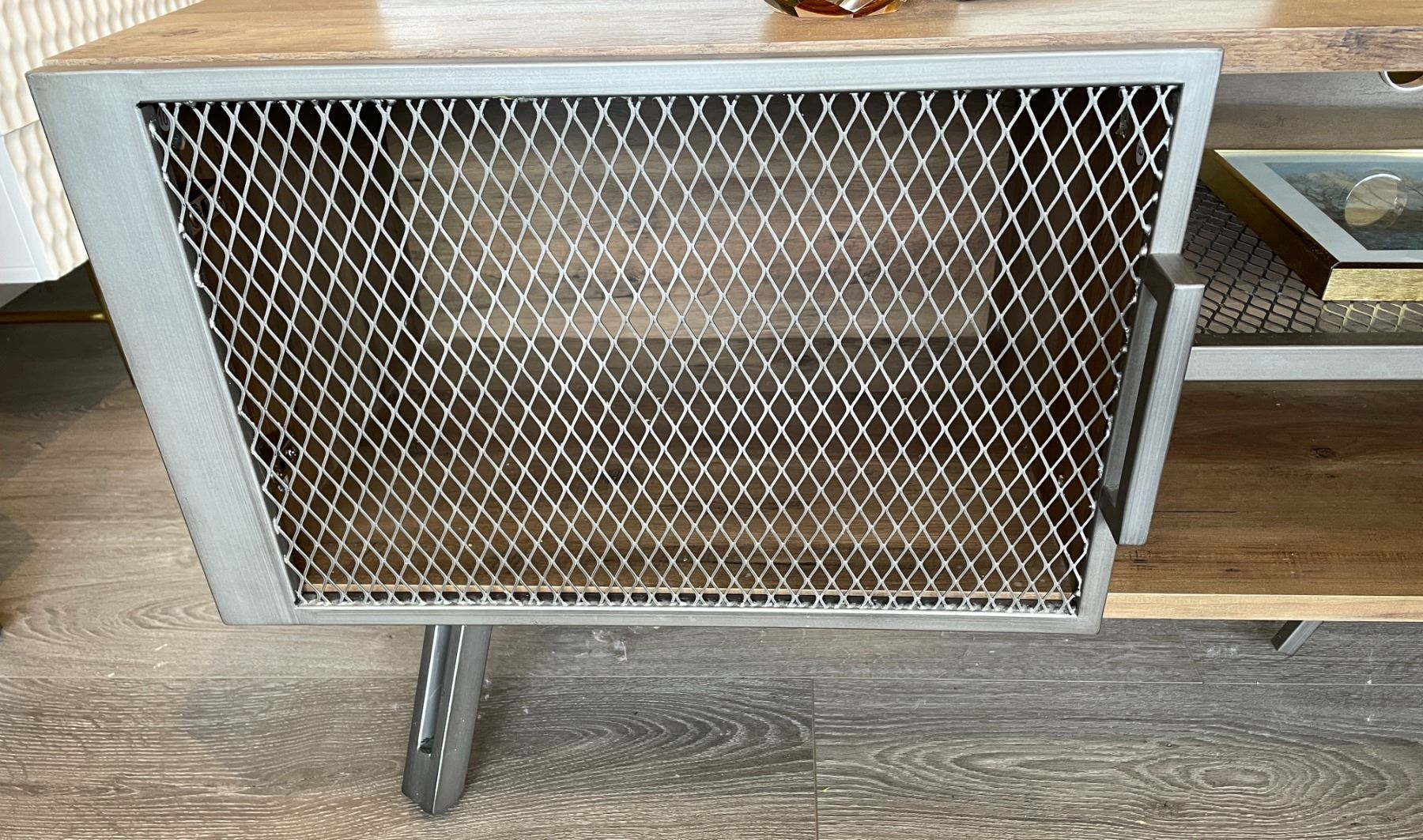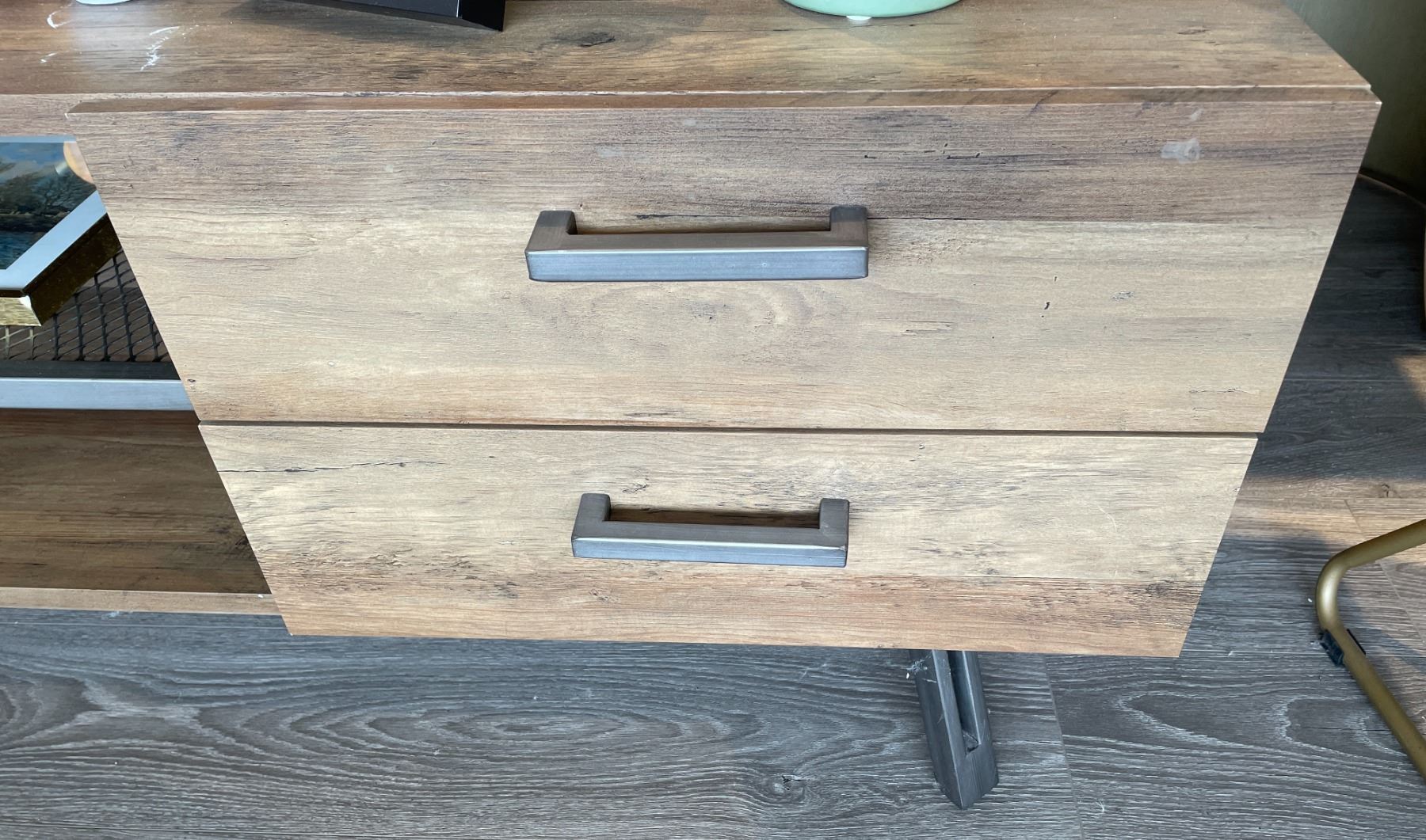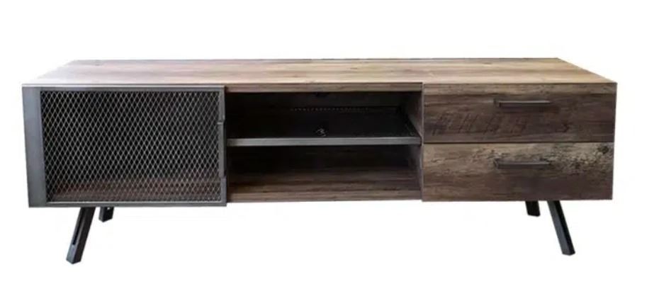 RS NEW Mike TV Stand - Retails: $1499. industrial style wood TV stand with two drawers, two shelves and a cabin; natural wood texture. Approx size 63L 16D 20H.