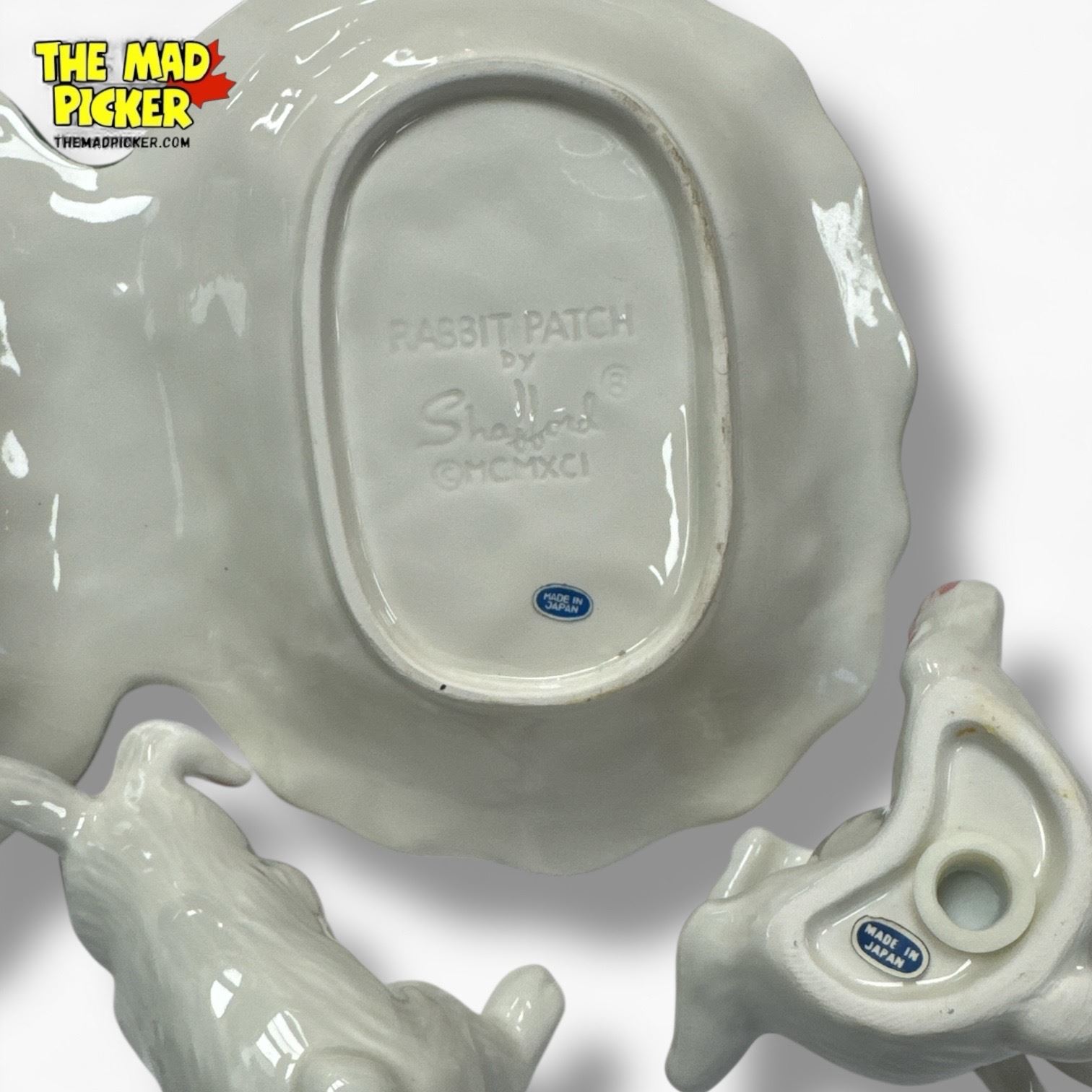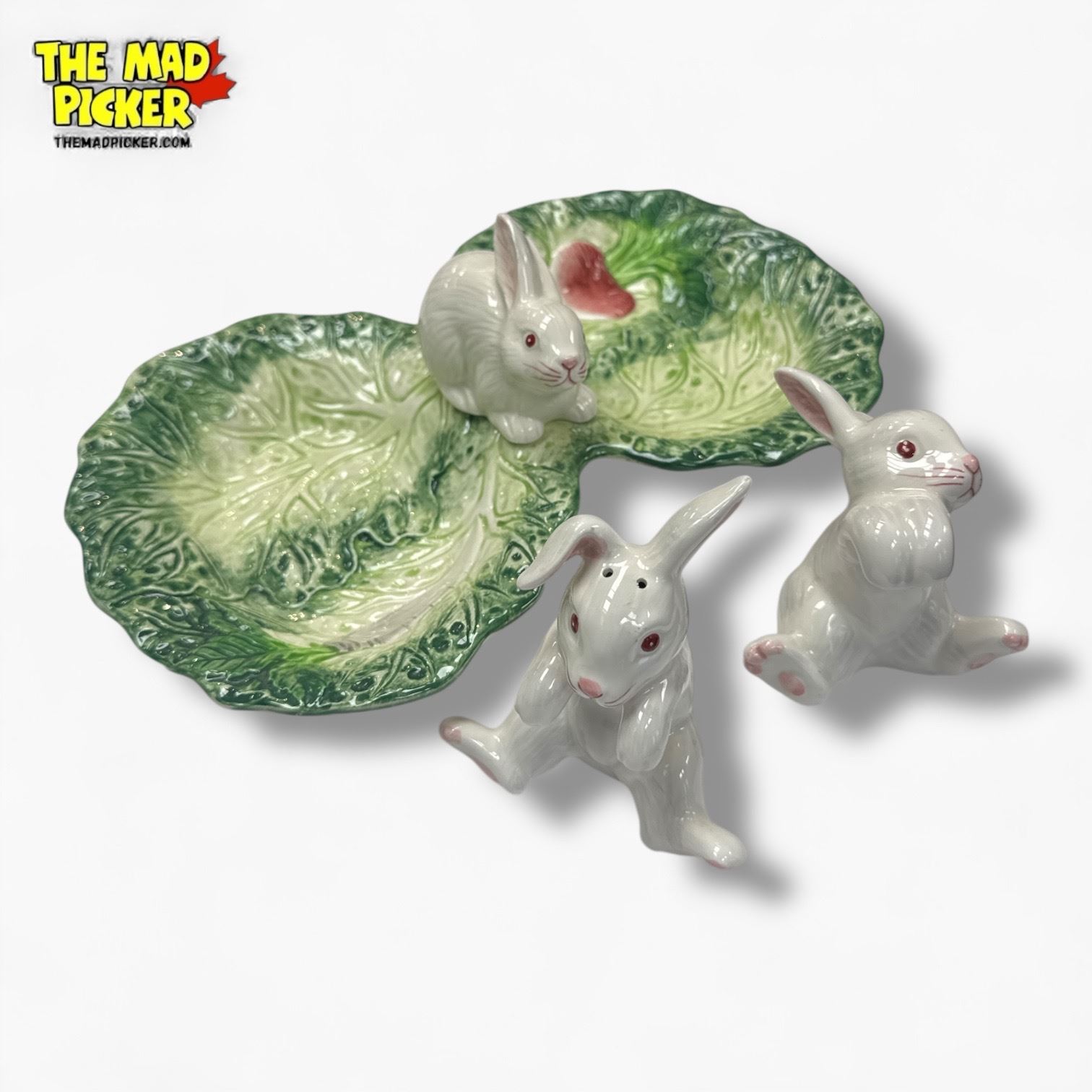 Rabbit Patch by Shafford serving set includes a double cabbage-shaped ceramic serving dish and a pair of matching salt and pepper shakers. Featuring hand-painted details, this mid-century Japanese-made set showcases a whimsical cabbage and rabbit motif. Marked 'Shafford Japan' on the base.