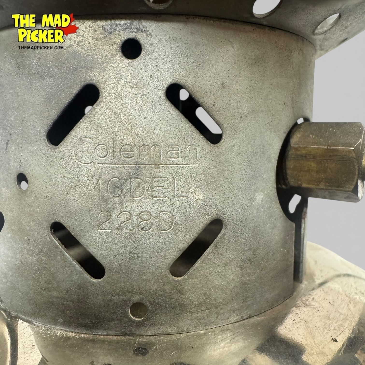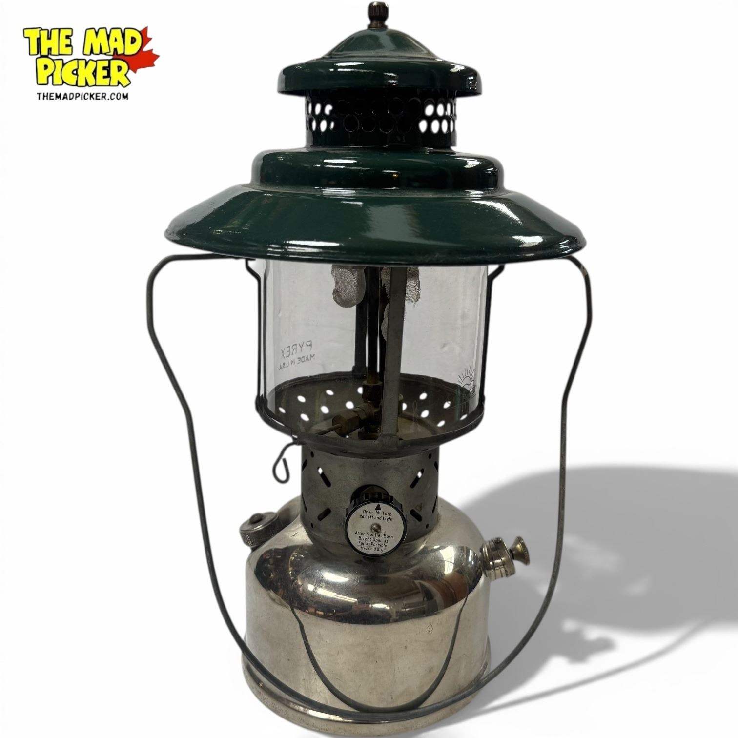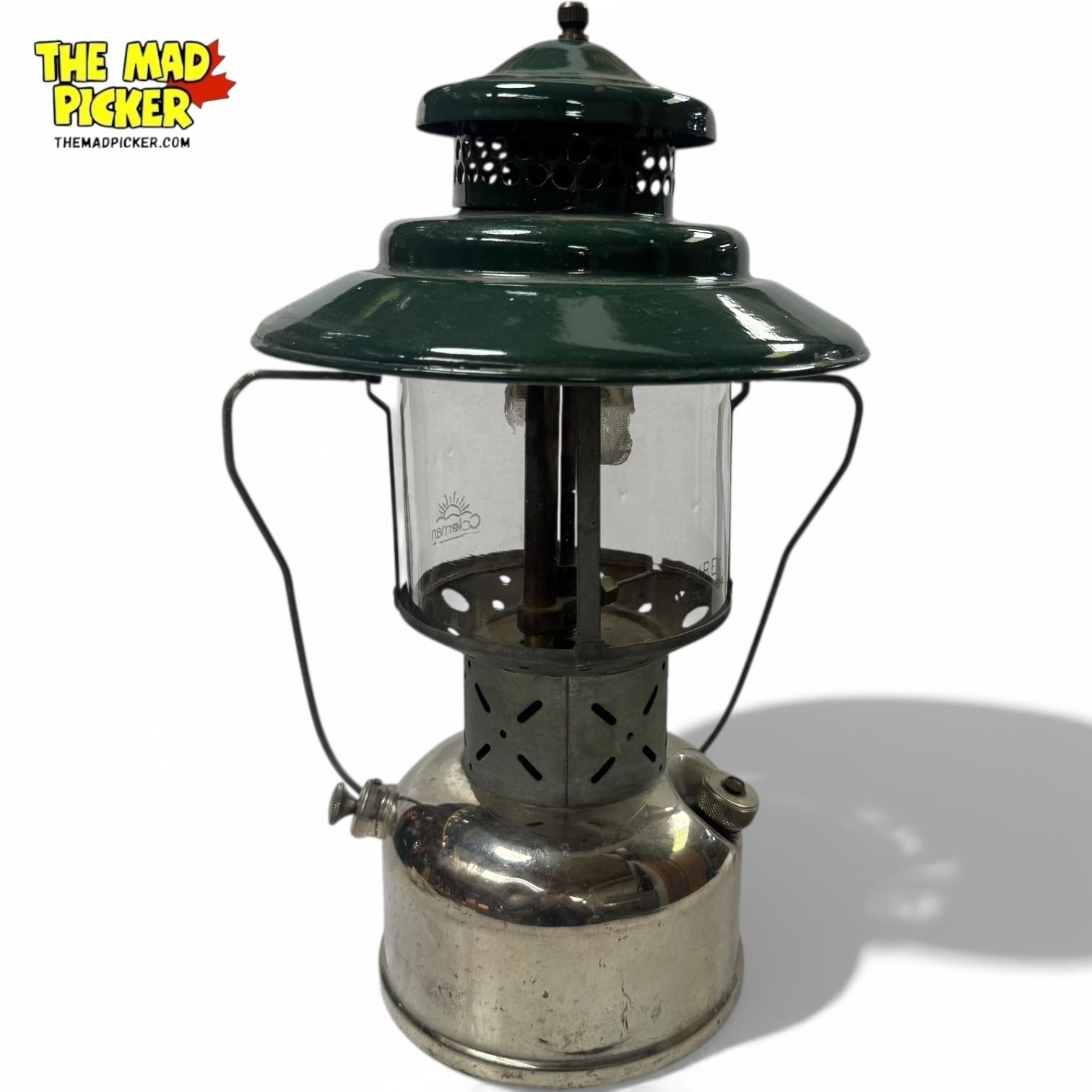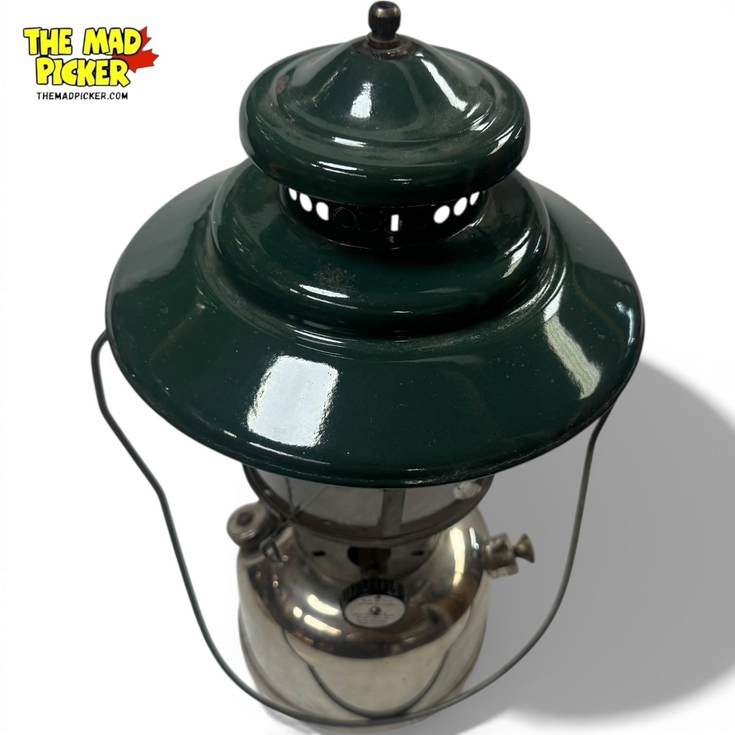 Coleman Model 228D Lantern, manufactured in 1948 by the Coleman Company, USA. Features a green enamel ventilator and large globe. Double-mantle design ideal for outdoor use. Part of Coleman's durable series from the mid-20th century, popular for camping and outdoor activities.