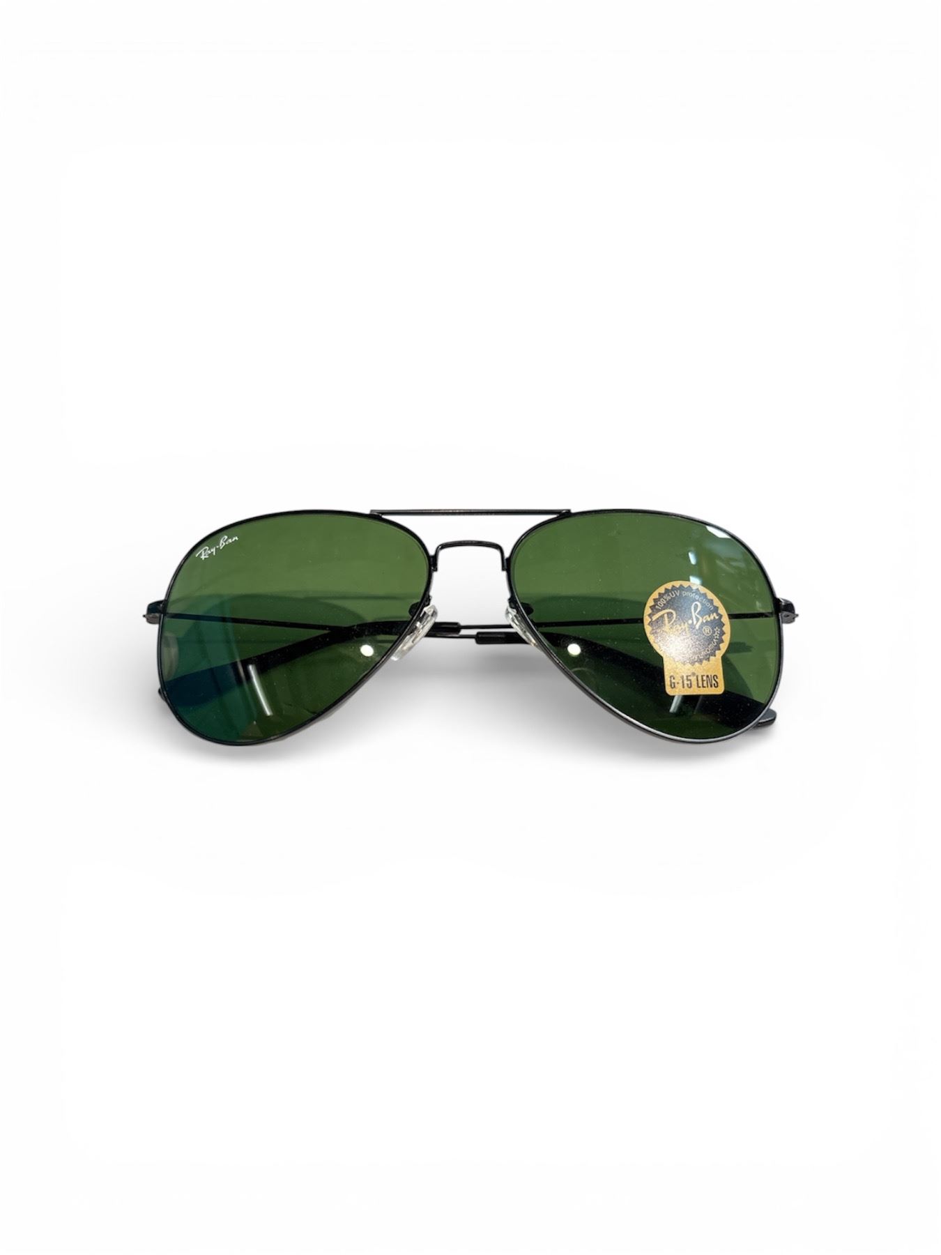 Ray-Ban Aviator sunglasses model RB3026 featuring a black frame and G15 green lenses. Lens size measures 62mm. Designed for classic aviator style with durable metal construction and UV protection. Iconic Ray-Ban branding on the lens and arms. Item is as pictured.