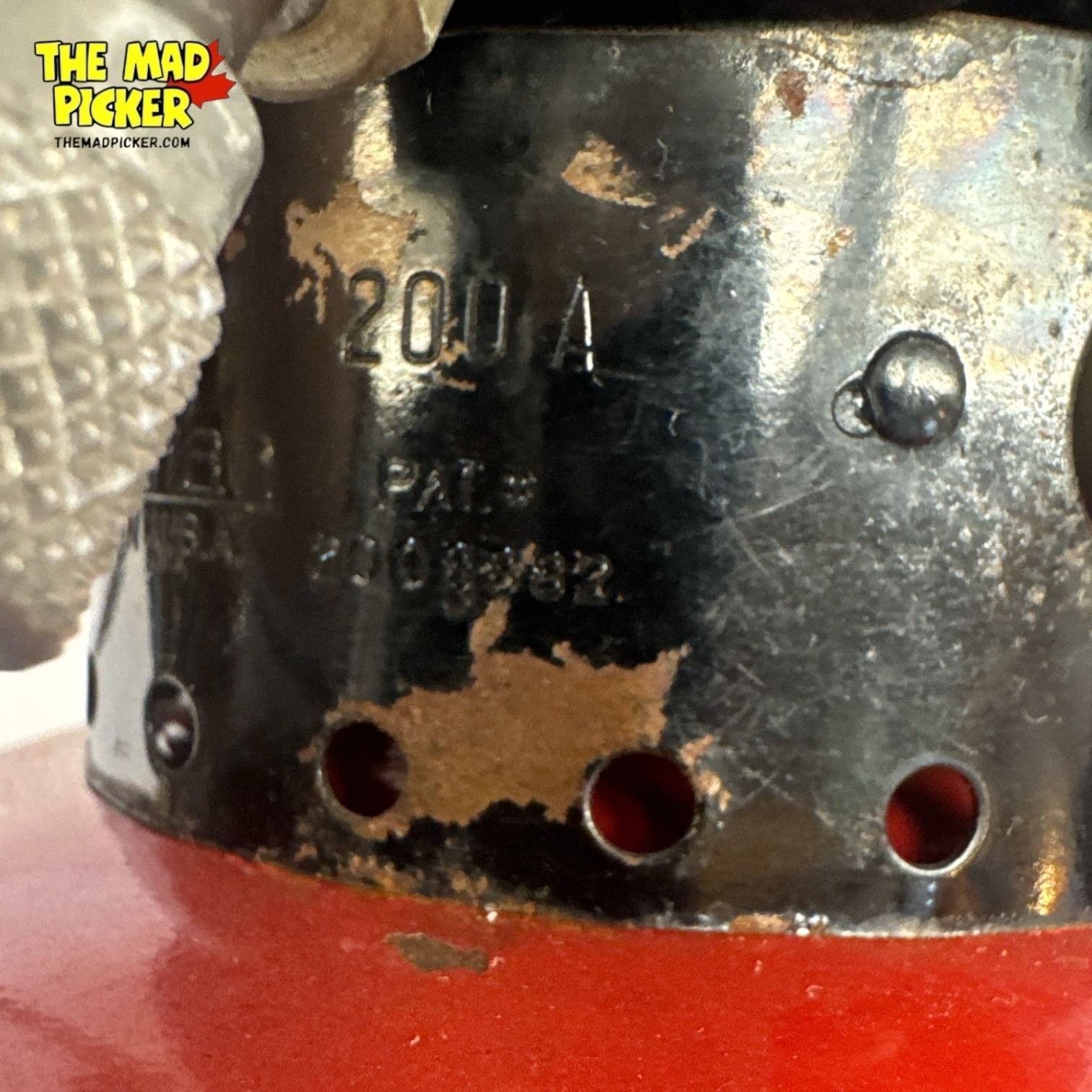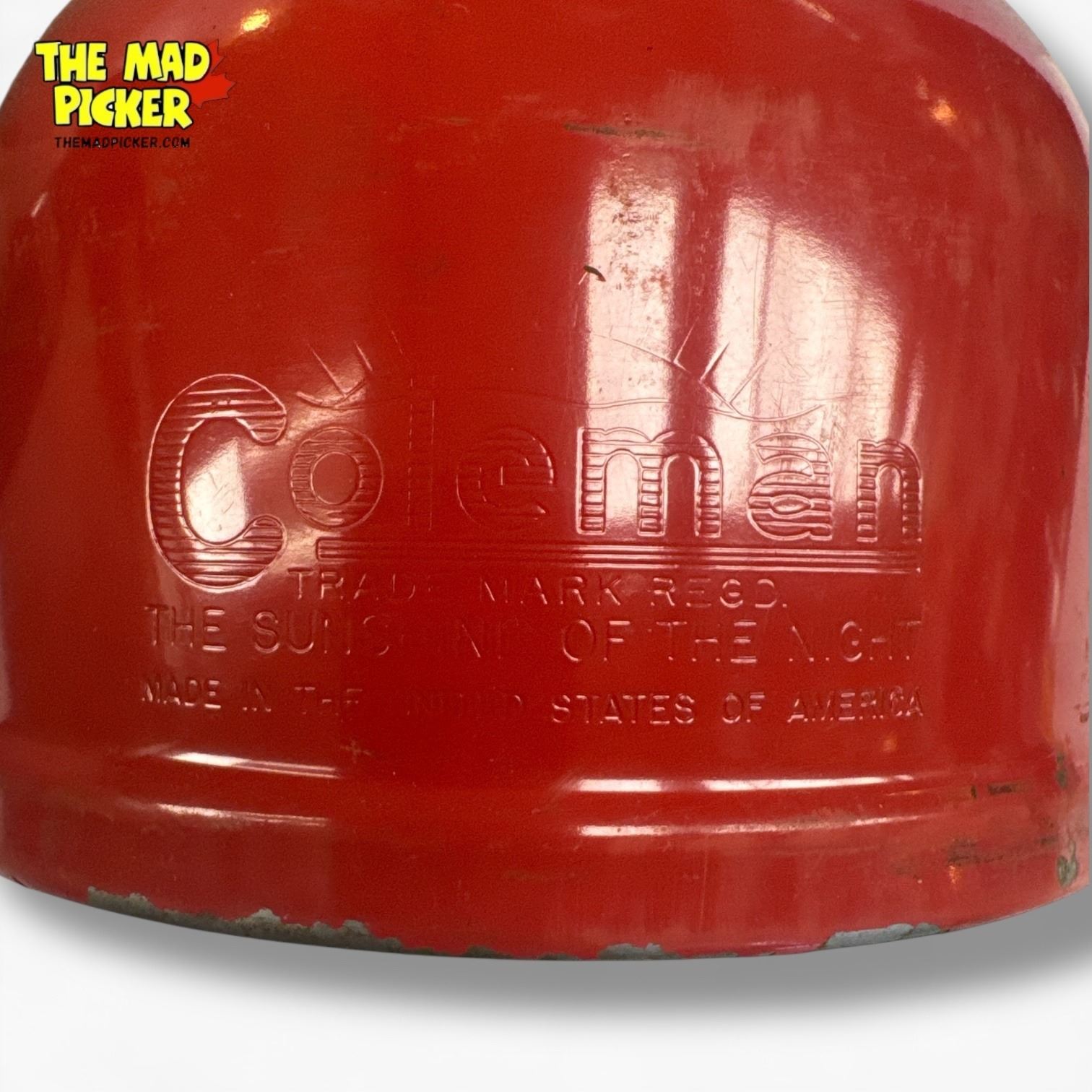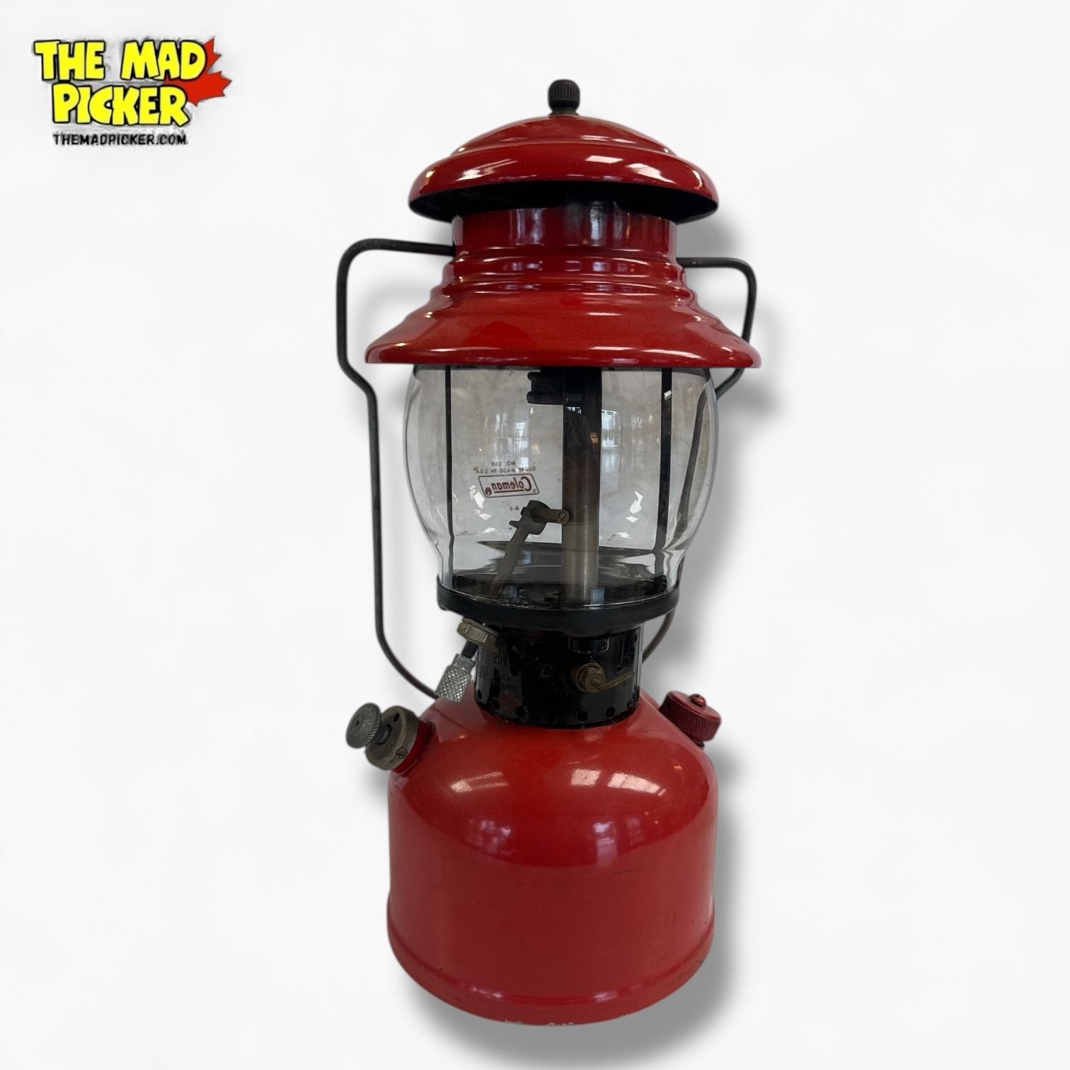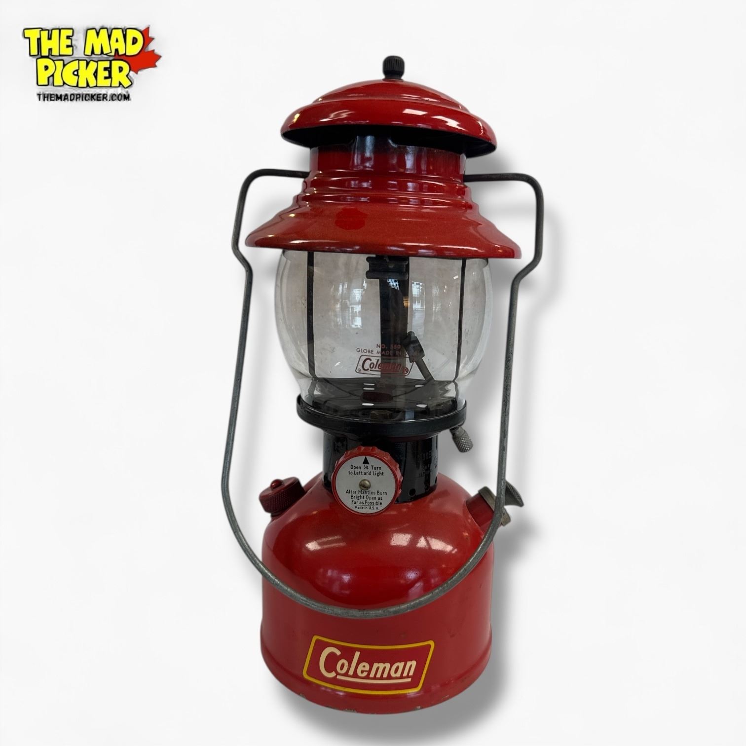 Coleman Model 200A lantern from 1952 in red finish. Features distinctive yellow border 'Made in USA' decal and original components. Single-mantle lantern designed for white gas. Measures approximately 12 inches in height. Known for its durability and classic camping utility.