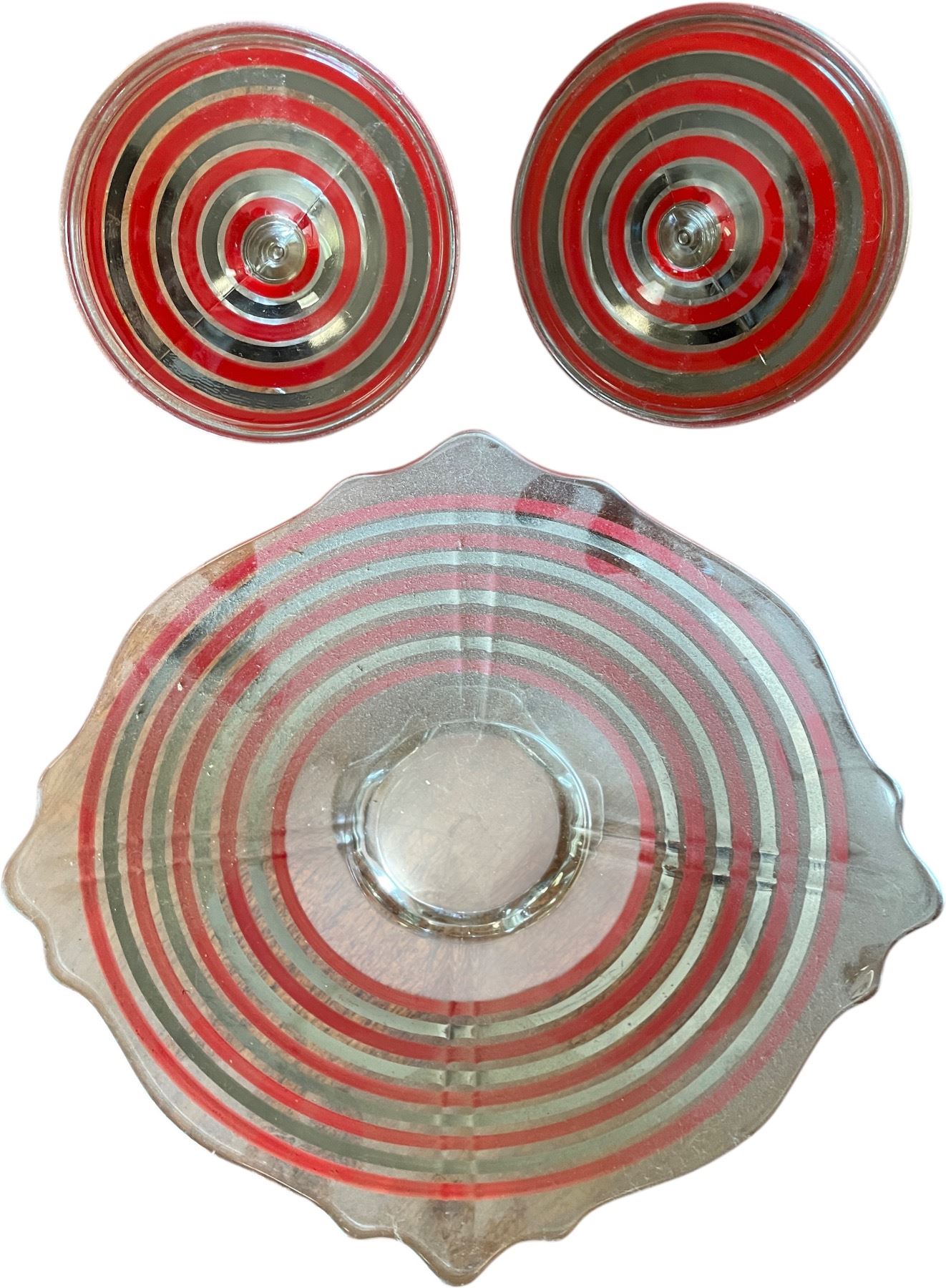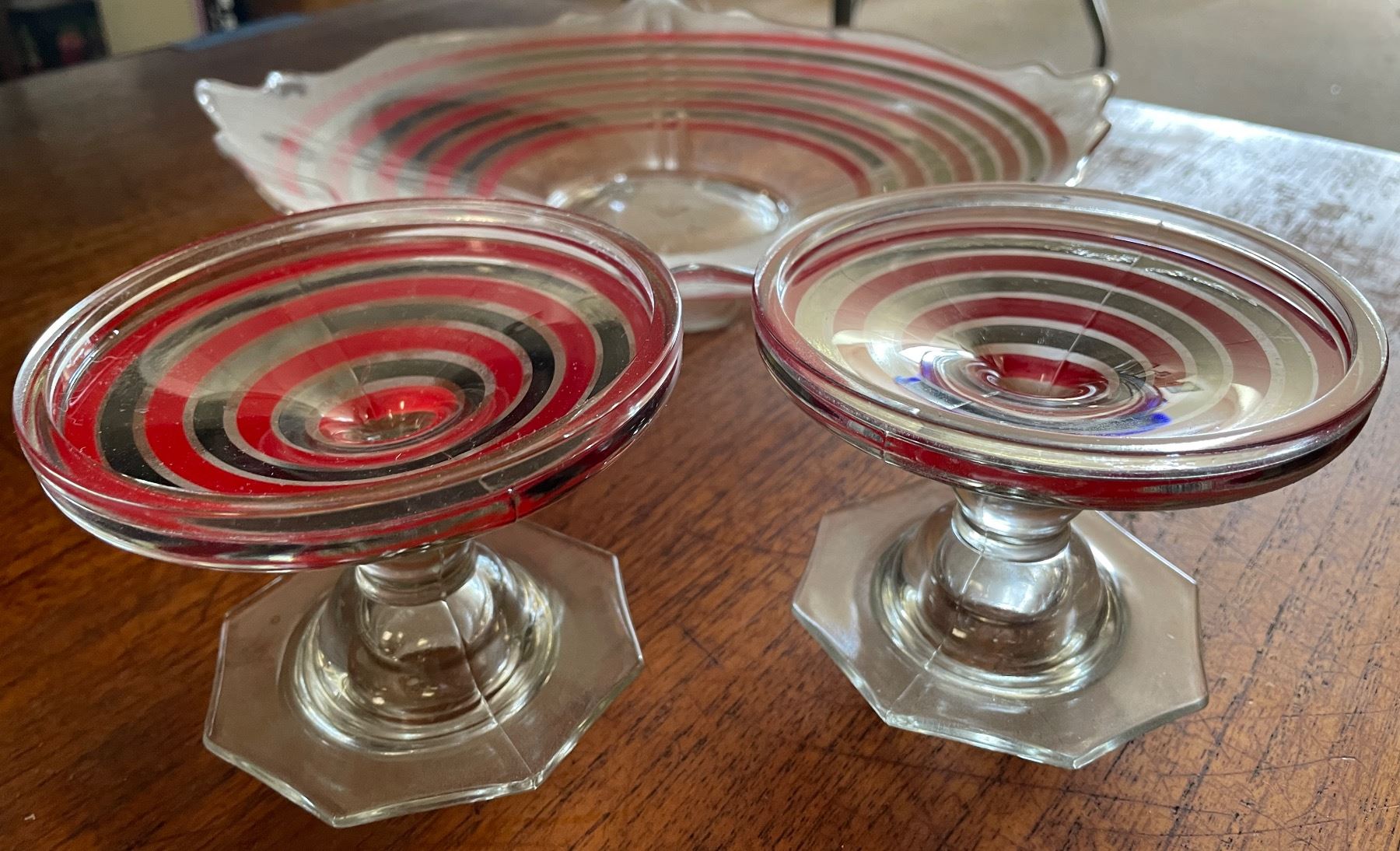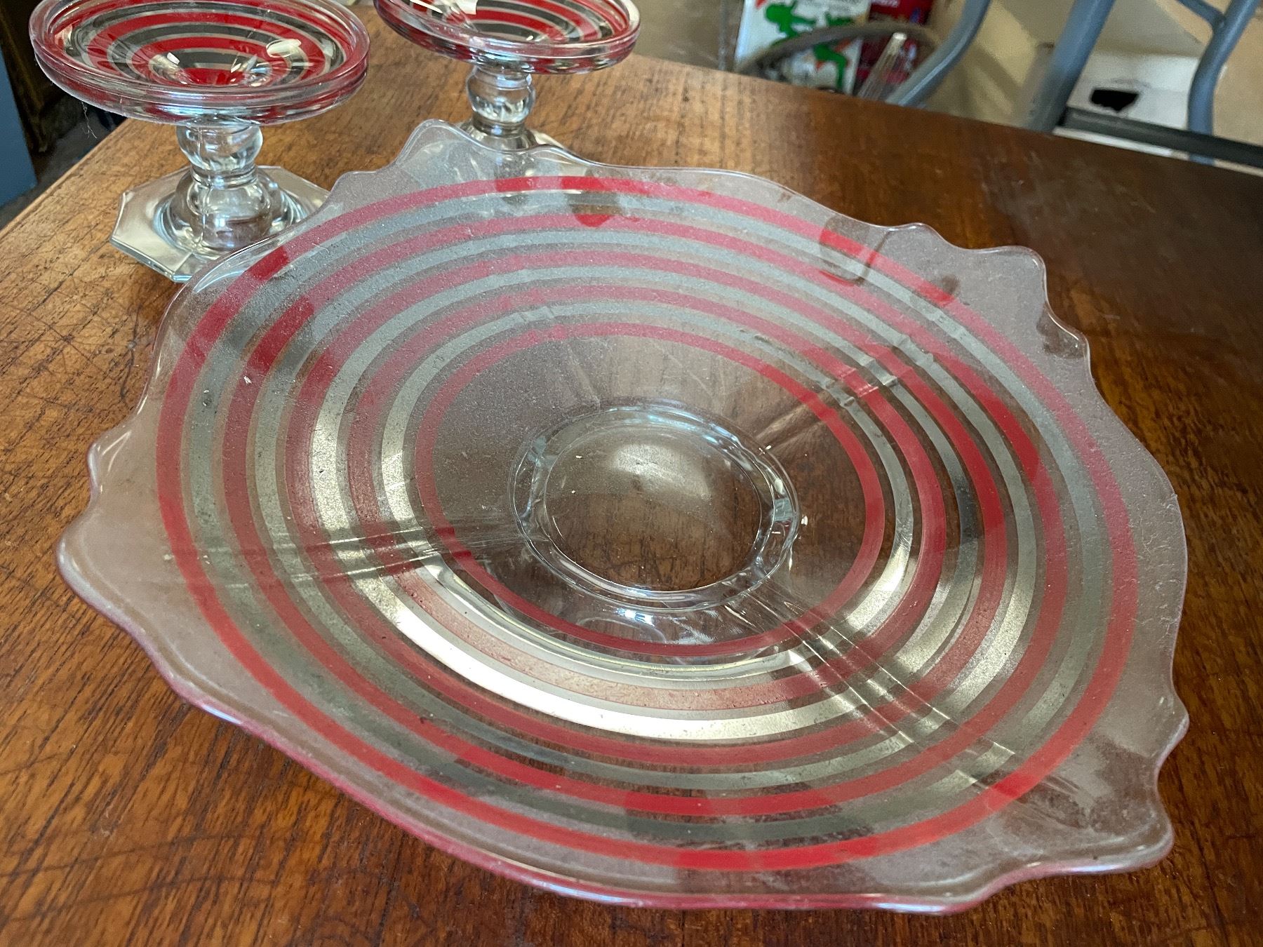 Red Stripe Glass Comport & Candlestick Set