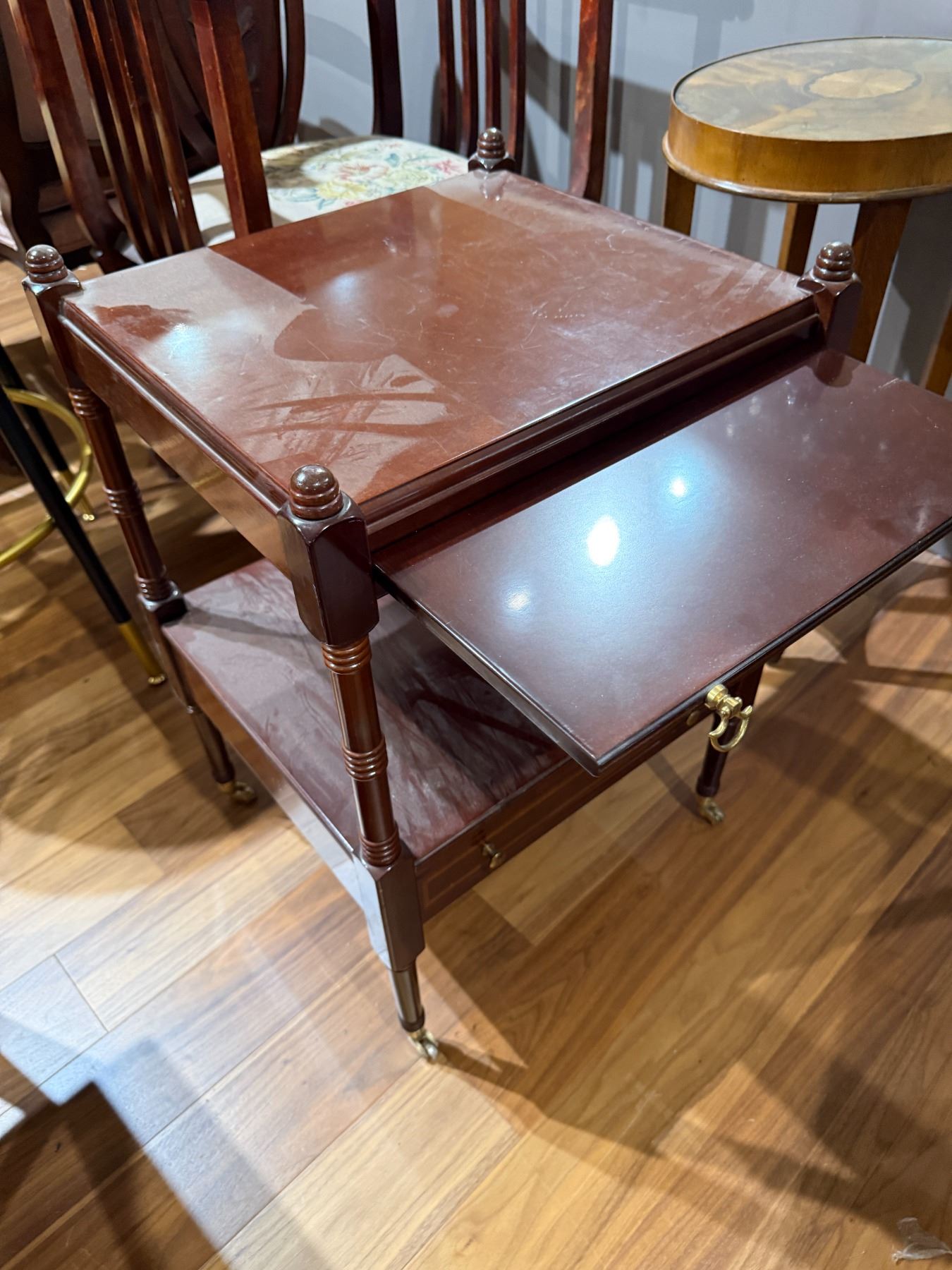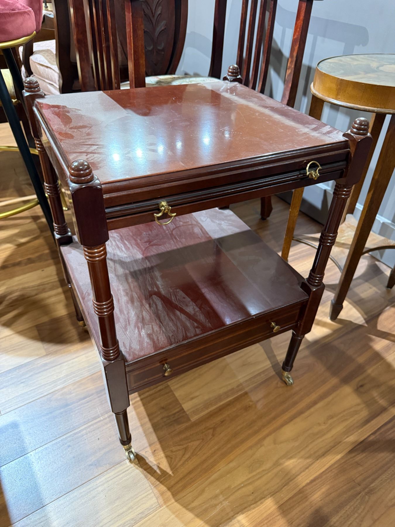 Regency style two tiered side table featuring a drawer for storage and a pull out writing surface. Table measures 17-Inch length, 16-Inch width, and 25.5-Inch height. Designed with classic aesthetics suitable for functional and decorative uses. Item is as pictured.