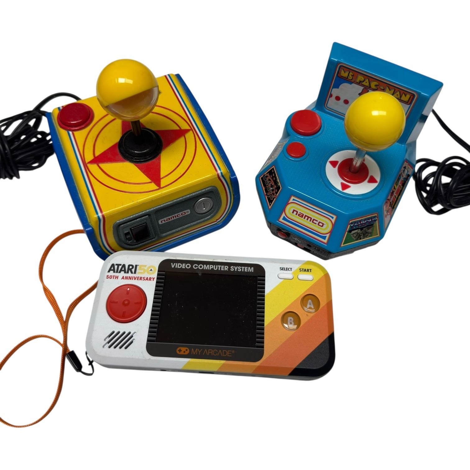 Lot includes retro handheld video games Namco Super Pac-Man, Ms. Pac-Man and Atari My Arcade 50th Anniversary console. Each unit features classic game styles for portable play. Item is as pictured.