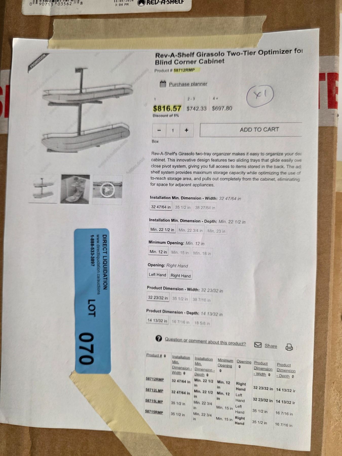 Rev-A-Shelf Girasolo 2 tier optimizer for blind corner cabinet - Wholesale Value: $815