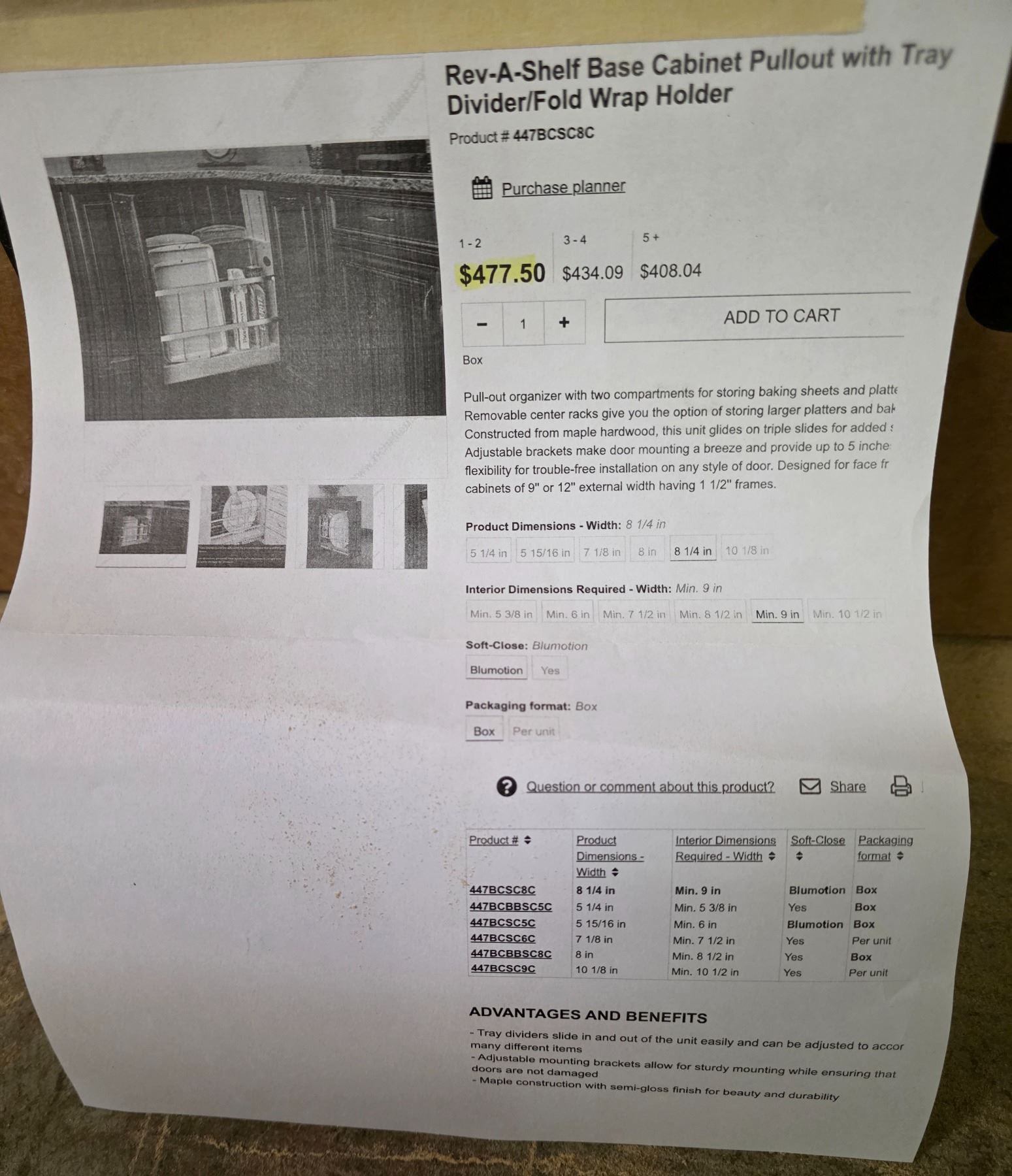 Rev-A-Shelf base cabinet pull-out w/ tray - Wholesale Value: 475
