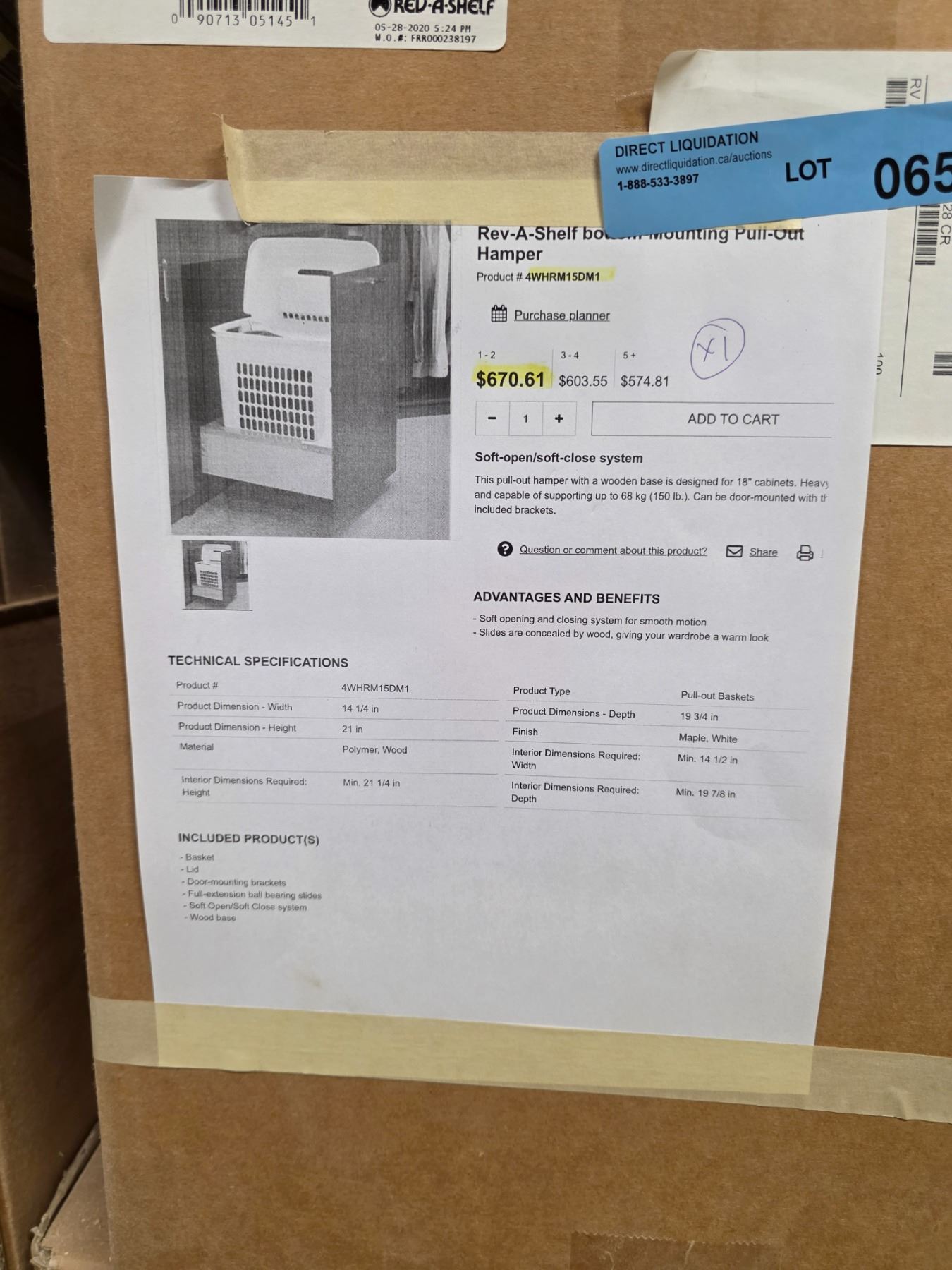 Rev-A-Shelf bottom mounting pull-out hamper & Marathon "Fly-Out" shelves - Wholesale Value: $1,340