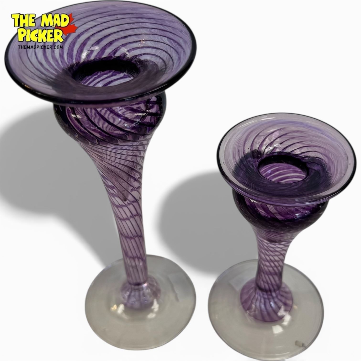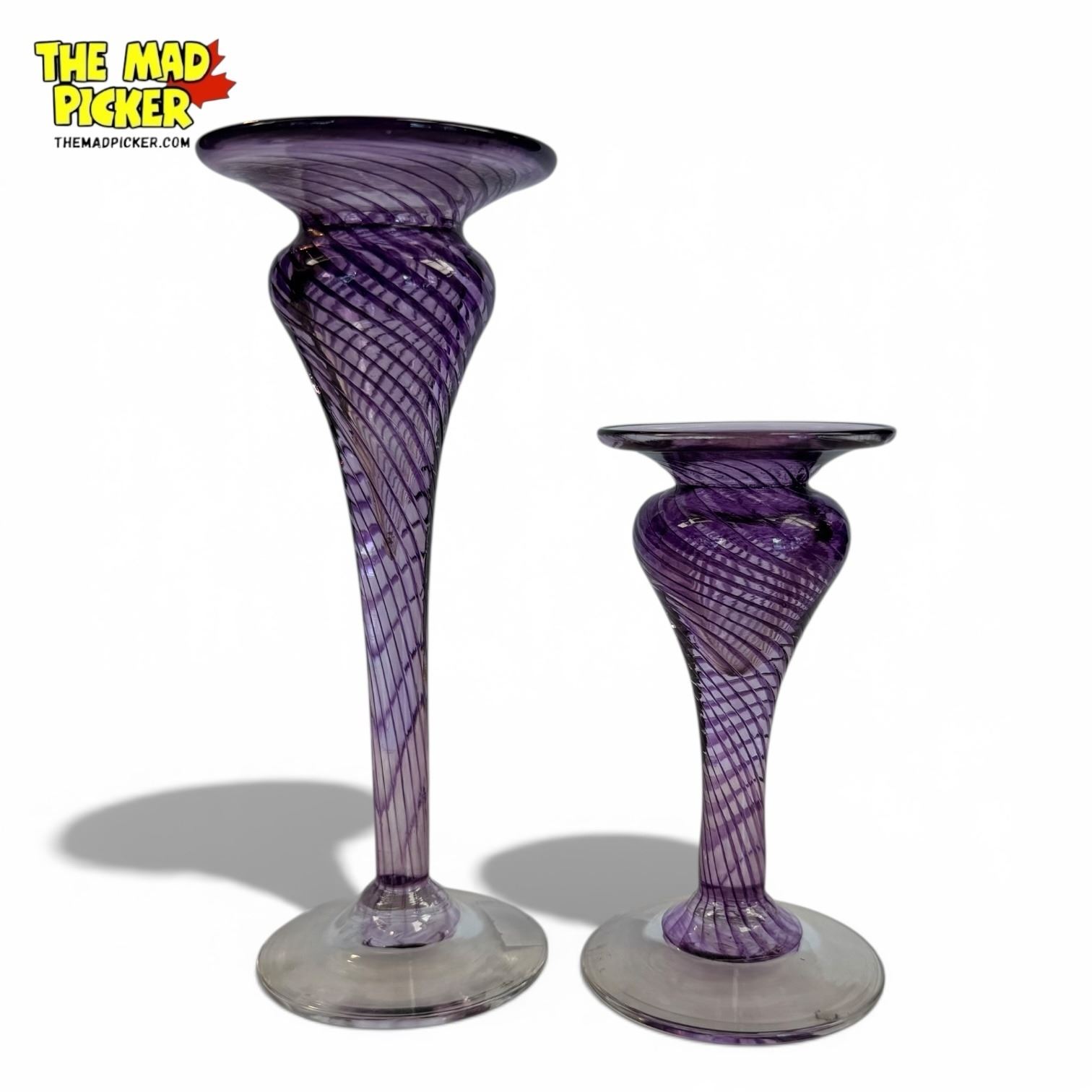 Set of vintage Robert Held art glass candlestick holders, signed and dated 1996. Hand-blown in Canada with a distinctive amethyst and clear/white swirled design. Functional as candle holders or vases. Known for their craftsmanship, these pieces are both decorative and durable.