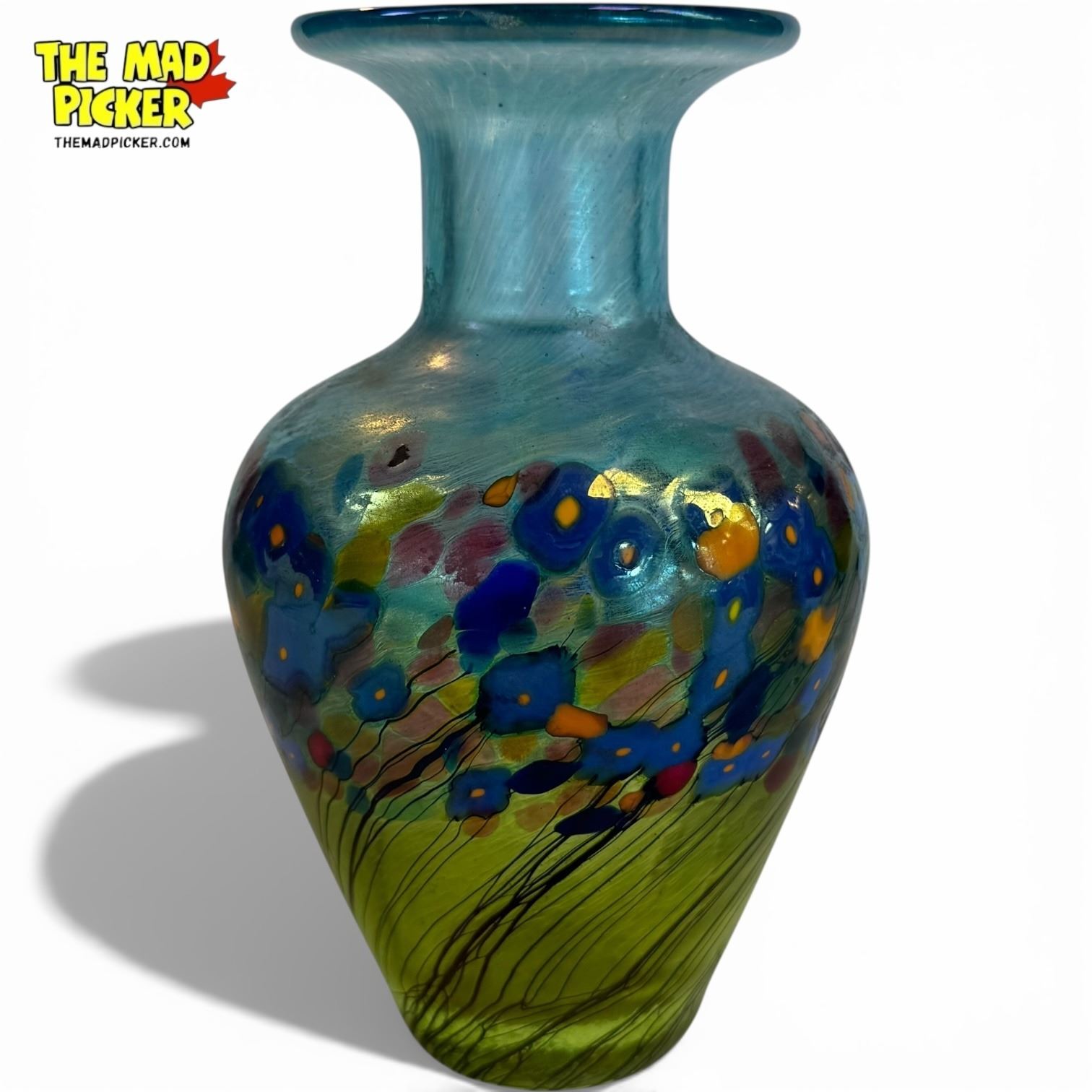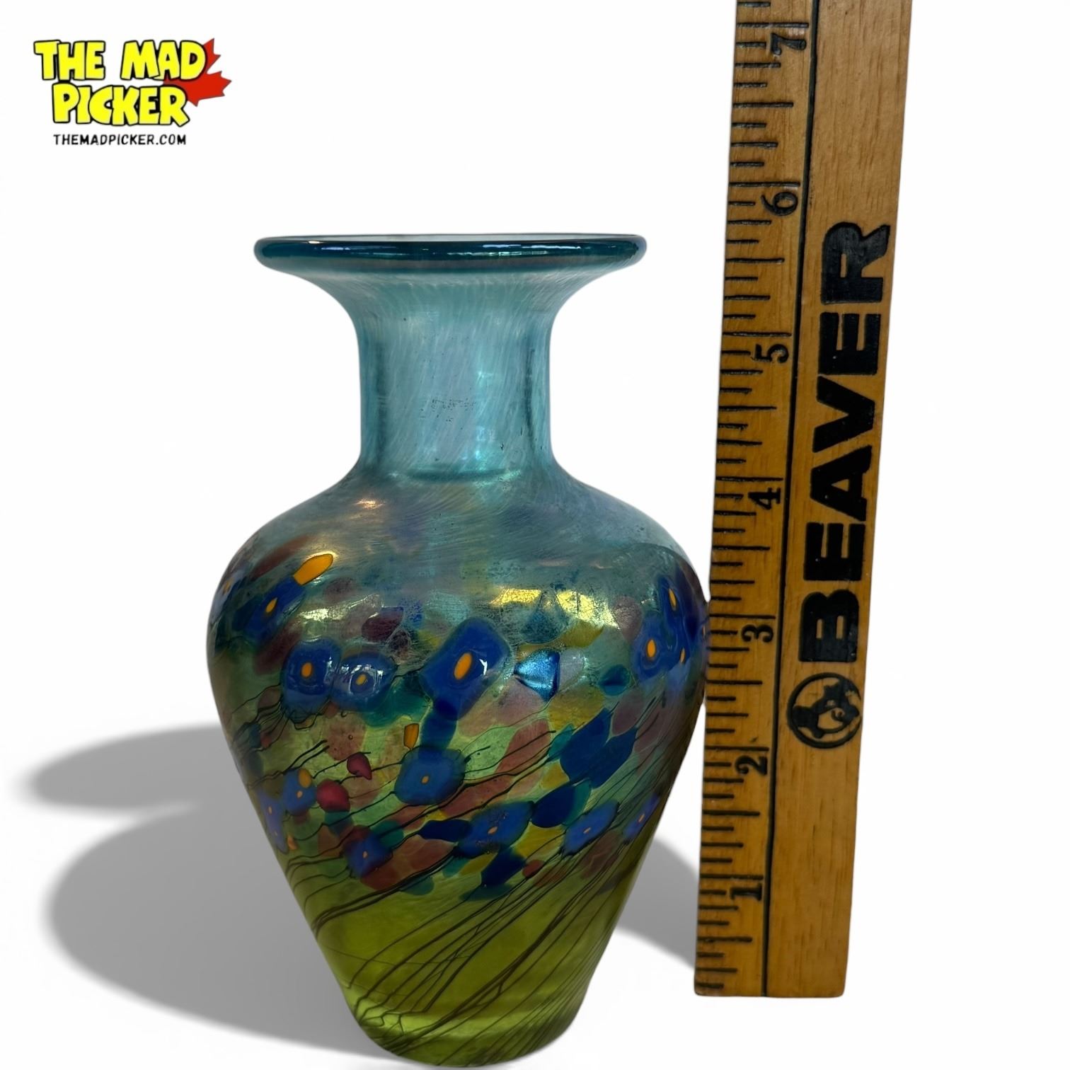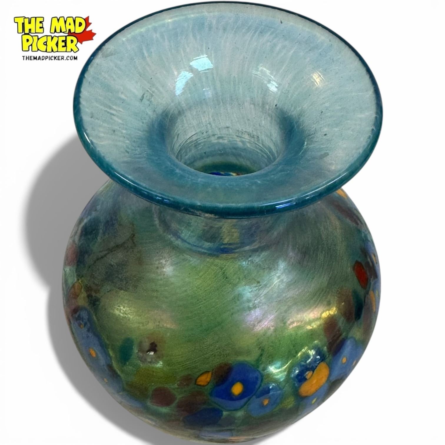 Hand-blown art glass vase by Canadian artist Robert Held in the 'California Poppy' pattern. Features vibrant blue and green iridescent tones with colorful floral motifs resembling poppies. Stands 6 inches tall. Robert Held is celebrated for his contributions to Canadian art glass design.