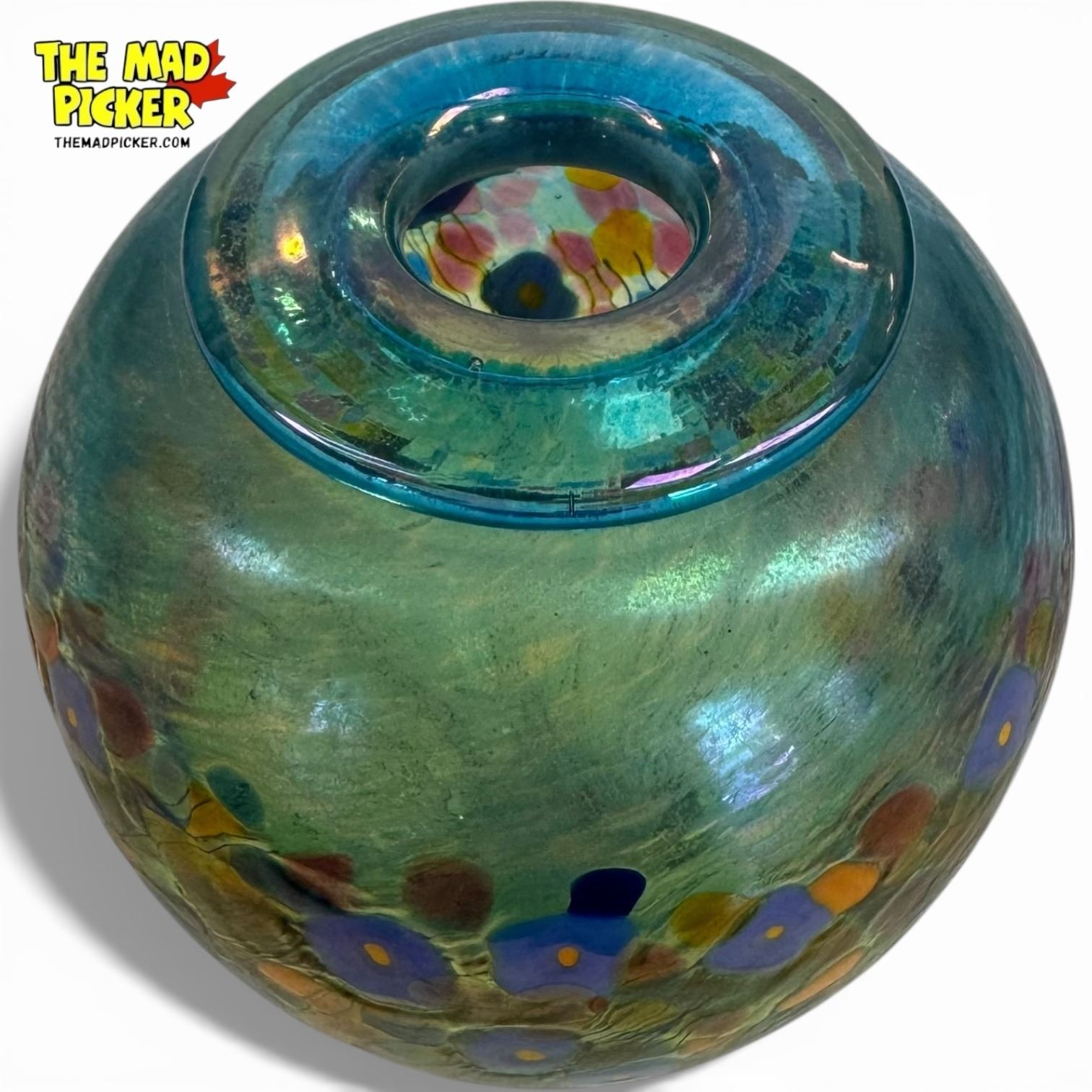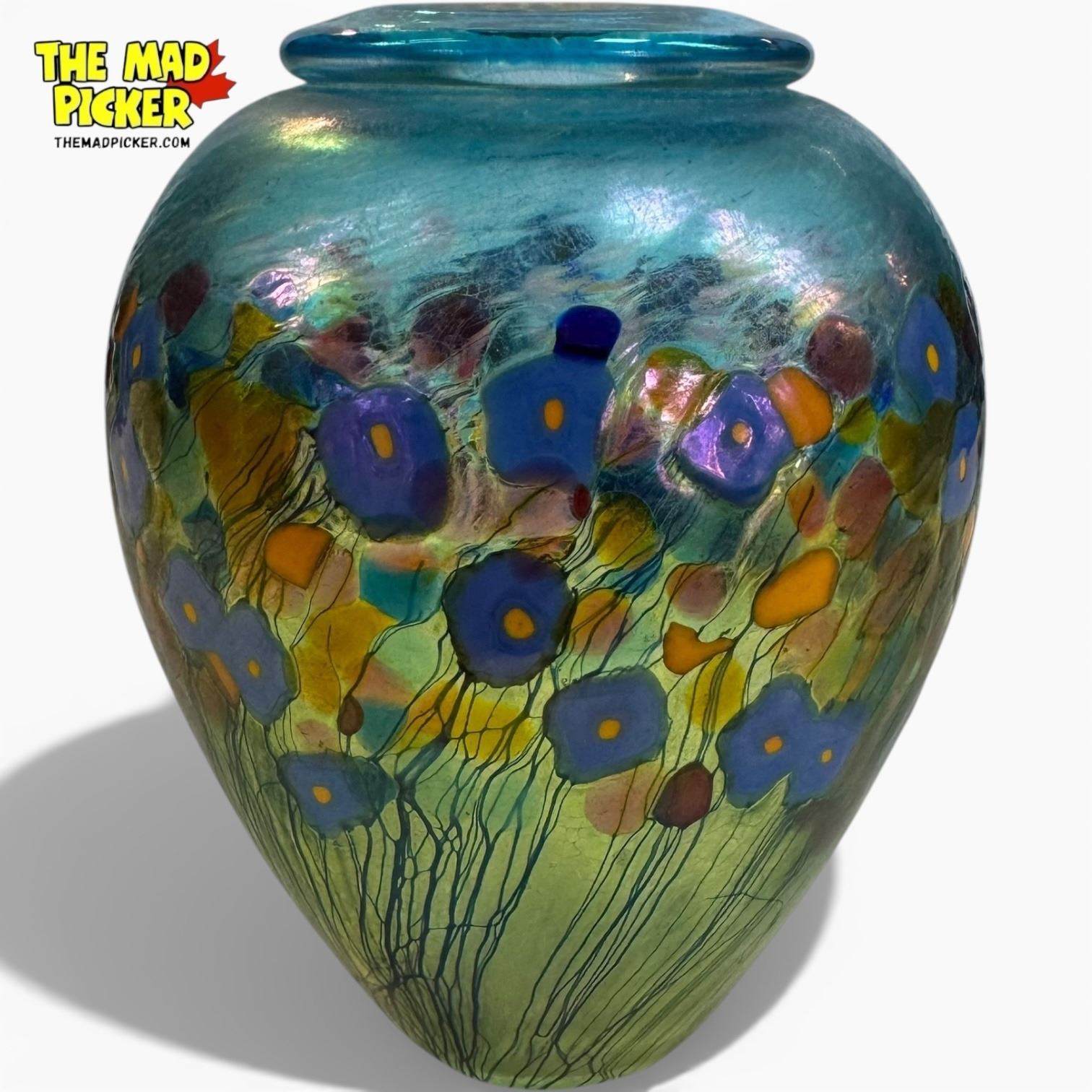 Hand-blown art glass vase by Canadian artist Robert Held in the 'California Poppy' design. Features blue luster with multicolor iridescent 'oil spot' pattern reminiscent of poppies. Made in Vancouver, British Columbia, prior to his studio's relocation to Vancouver Island. Measures 5 inches tall.