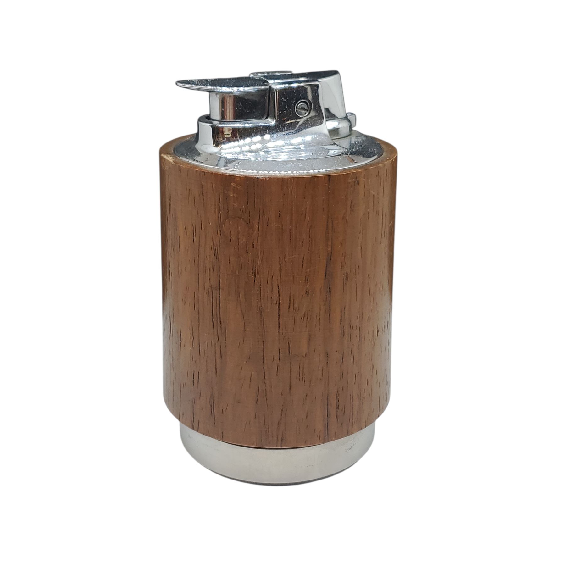 Ronson Varaflame table lighter featuring a chrome body with teak wood accents. Manufactured in England during the 1960s and demonstrating characteristic Mid-Century Modern design. Features adjustable flame dial. Marked 'Ronson' on the base.