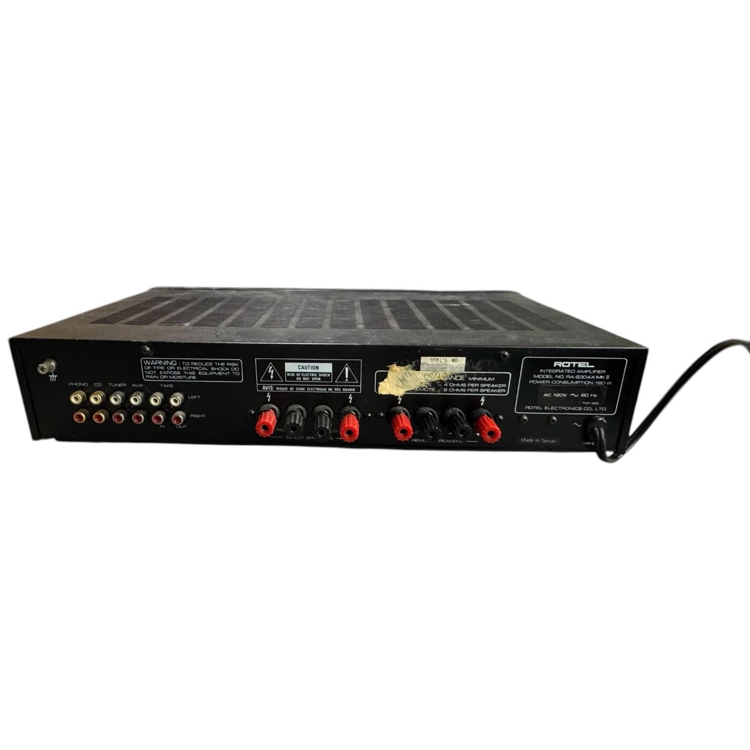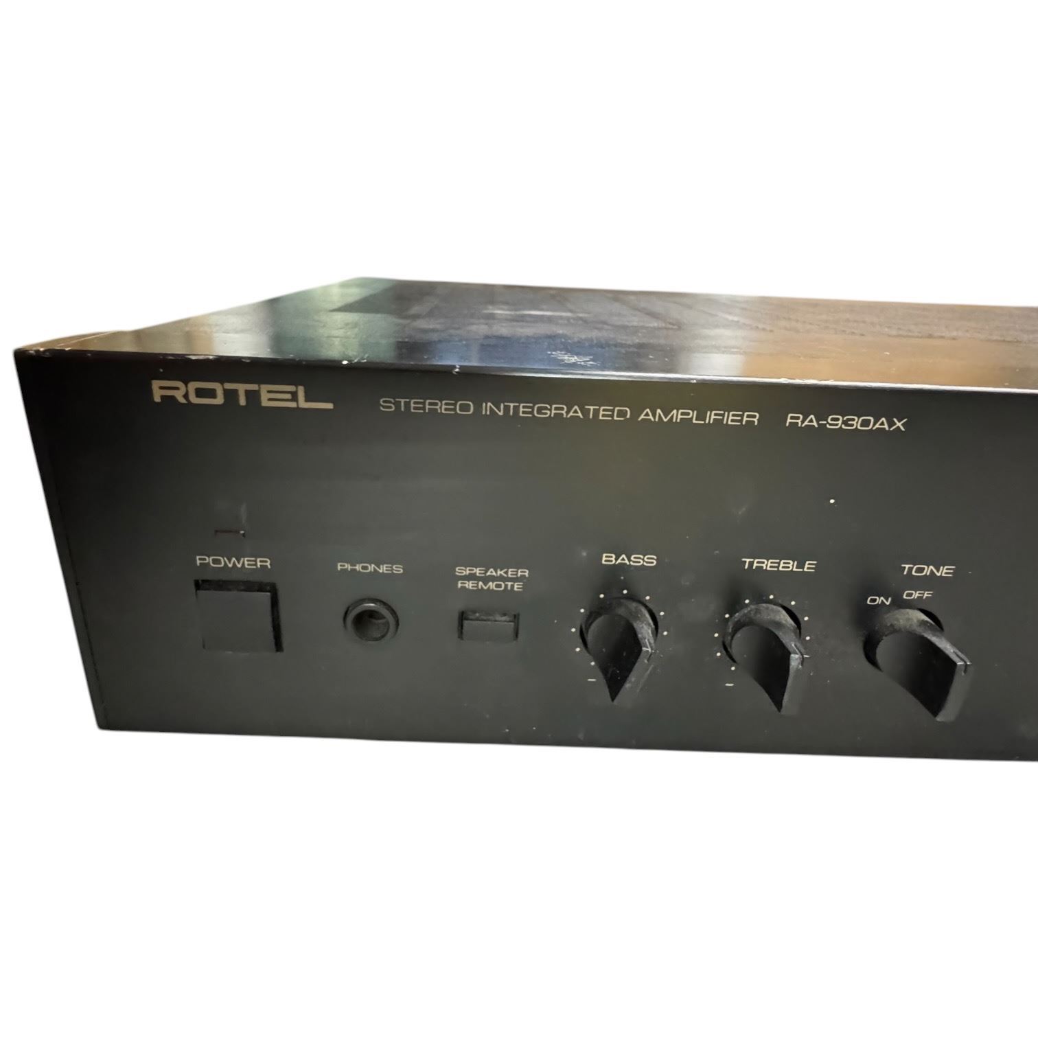 Rotel RA-930AX stereo integrated amplifier from the 1990s in black finish. Features a power output of 30 watts per channel at 8 ohms, bass and treble tone controls, and phono input for vinyl playback. Known for its high-performance audio quality and minimalist design. Item is as pictured.