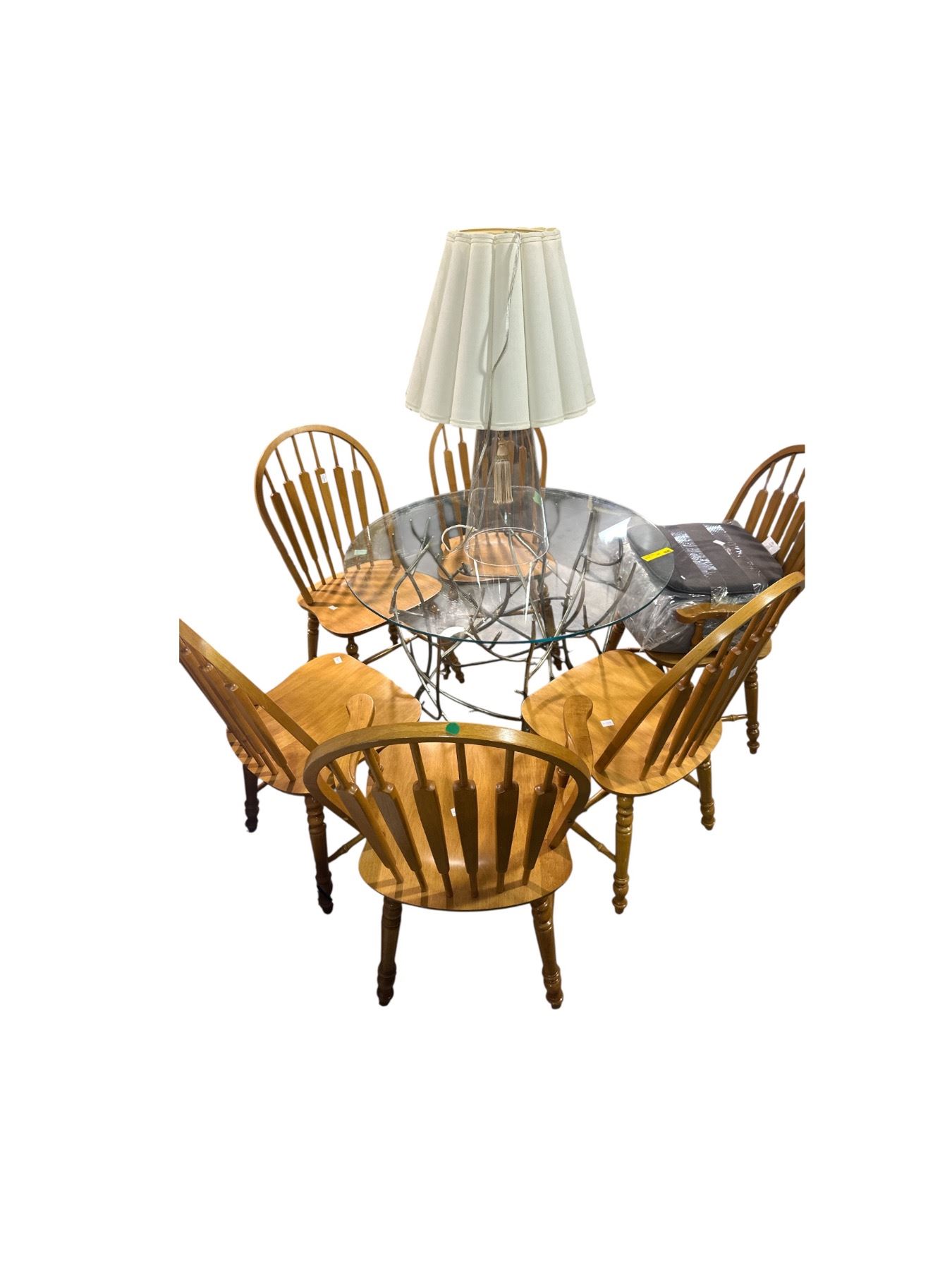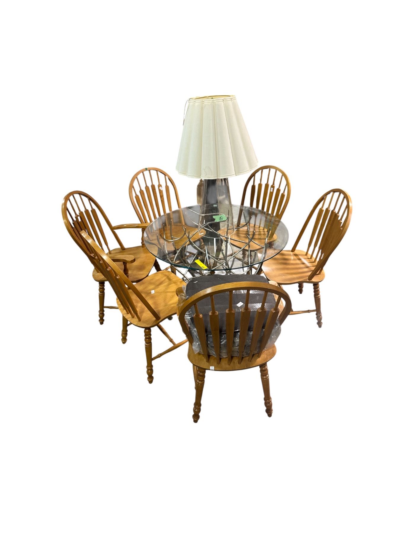 Round Glass Top Dining Table with Metal Base & Six Wooden Dining Chairs, Includes Table Lamp