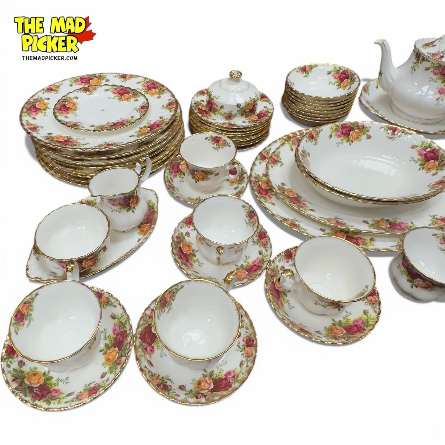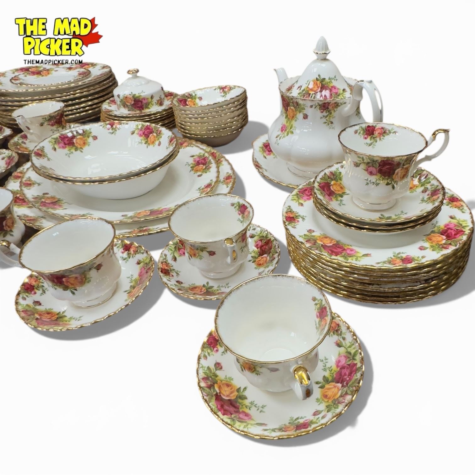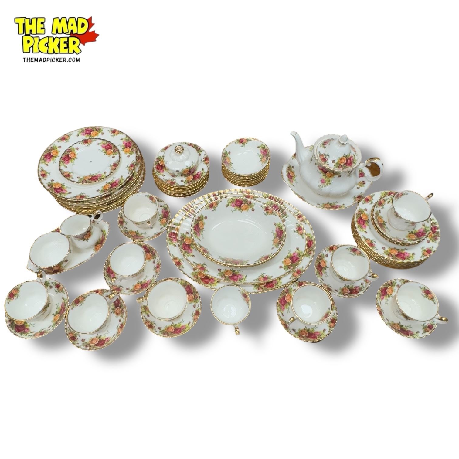 Royal Albert Old Country Roses 65-piece dinnerware set, crafted from fine bone china. Introduced in 1962, this collection features a design inspired by English roses and is embellished with 22-carat gold accents. Includes dinner plates, teacups, saucers, and serving pieces. Hand wash only, not dishwasher or microwave safe.