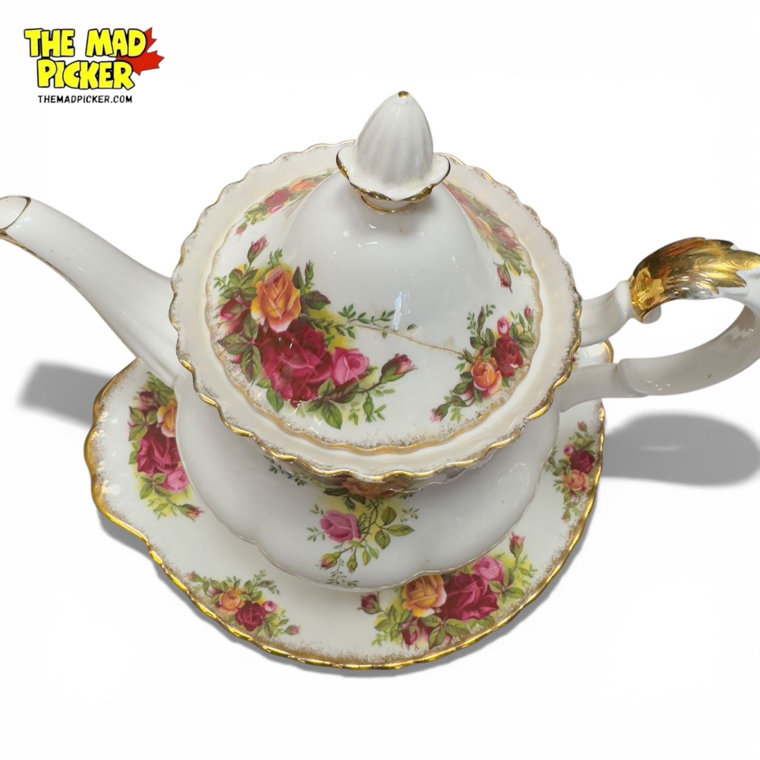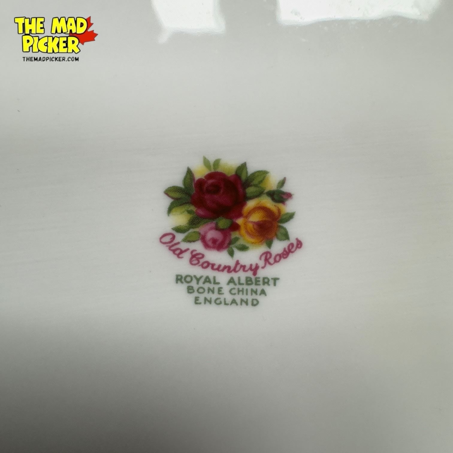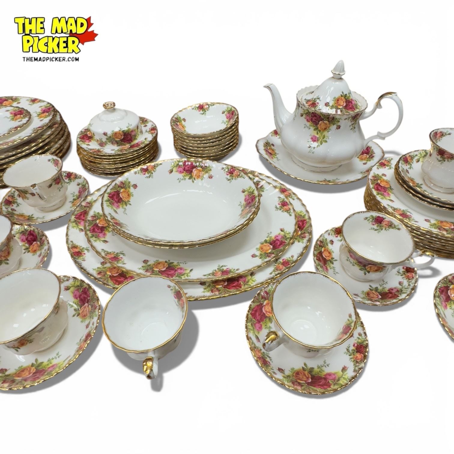 Royal Albert Old Country Roses 65-piece dinnerware set, crafted from fine bone china. Introduced in 1962, this collection features a design inspired by English roses and is embellished with 22-carat gold accents. Includes dinner plates, teacups, saucers, and serving pieces. Hand wash only, not dishwasher or microwave safe.