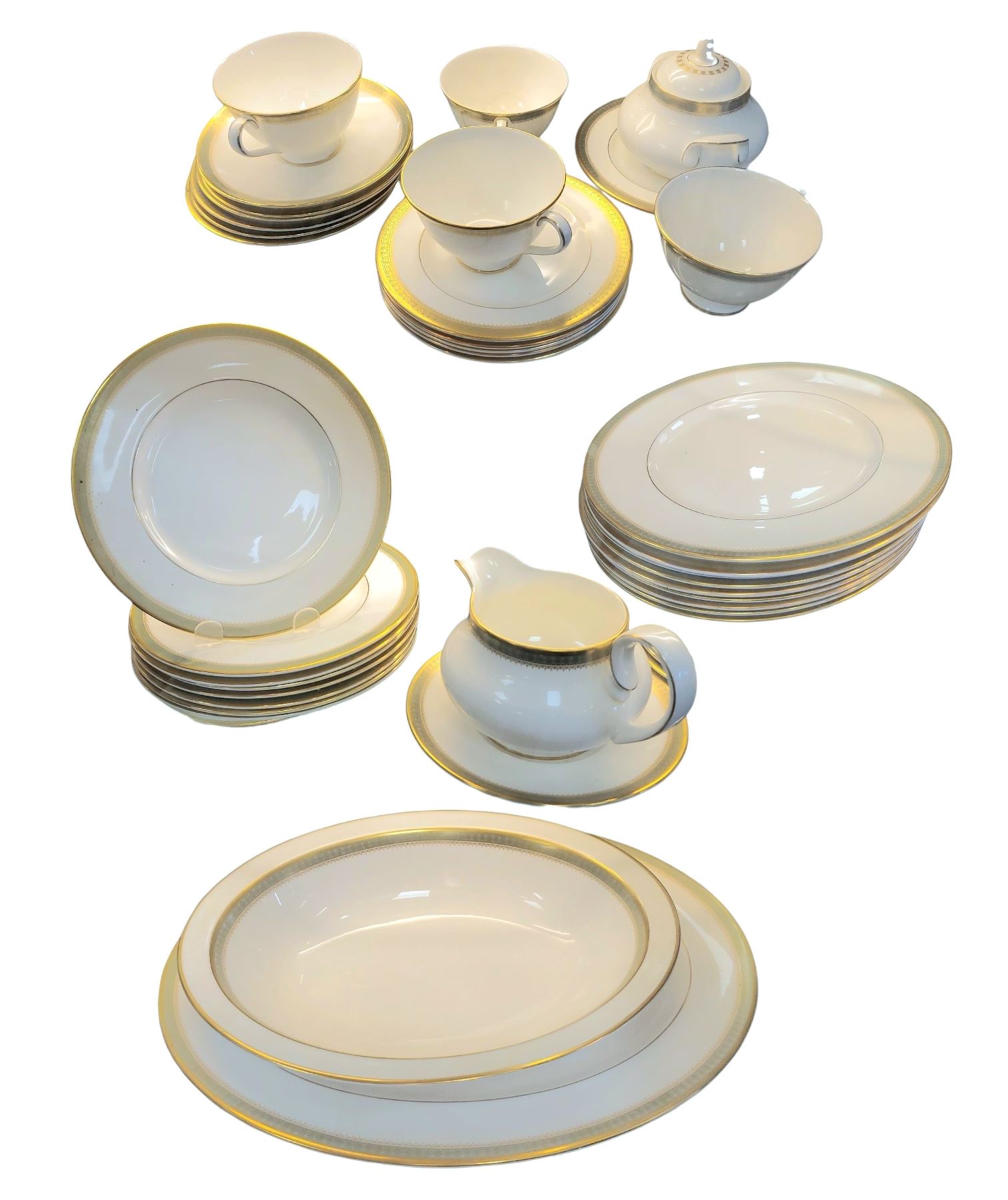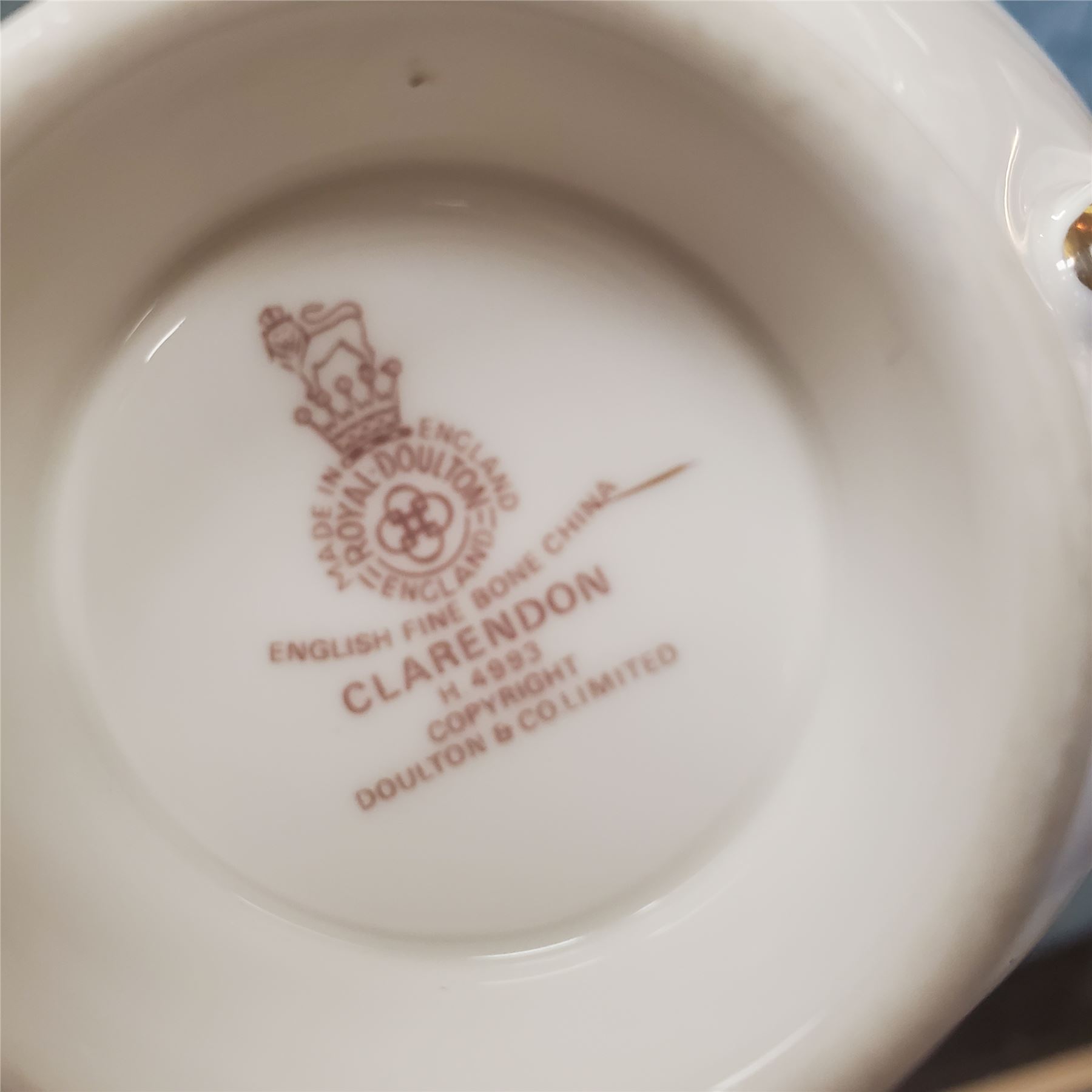 37-piece Royal Doulton Clarendon pattern set crafted in fine bone china. Includes plates, bowls, cups, saucers and serving pieces featuring the Clarendon design. Made in England. Item is as pictured.