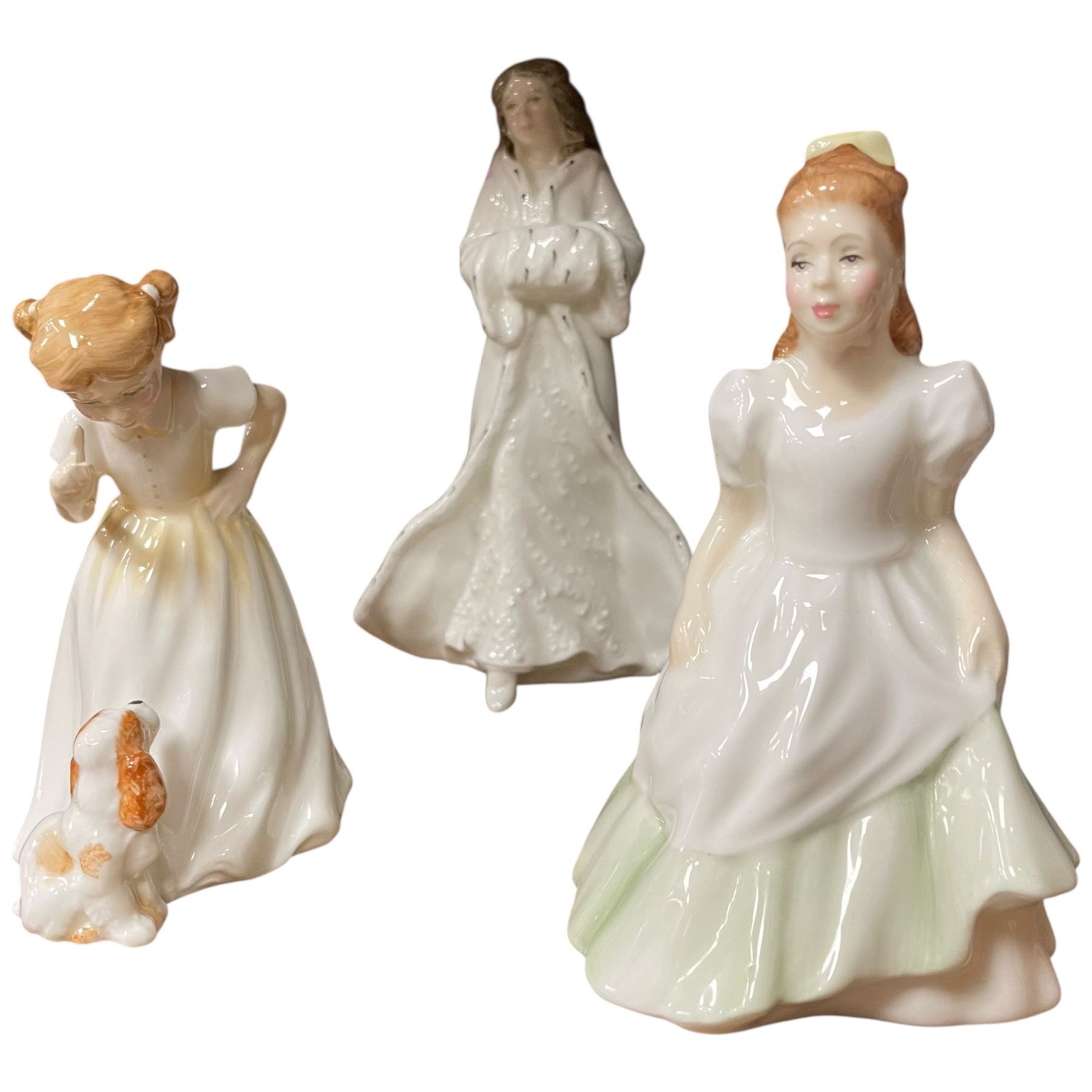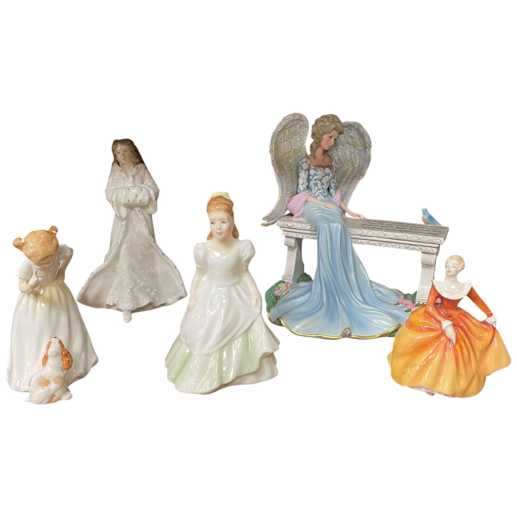 Set of Royal Doulton hand-painted fine bone china figurines HN3123, HN3036, HN3488, HN3220, depicting detailed scenes and characters. Includes Thomas Kinkade Heaven's Embrace Figurine featuring intricate designs inspired by Kinkade's art. Item is as pictured.