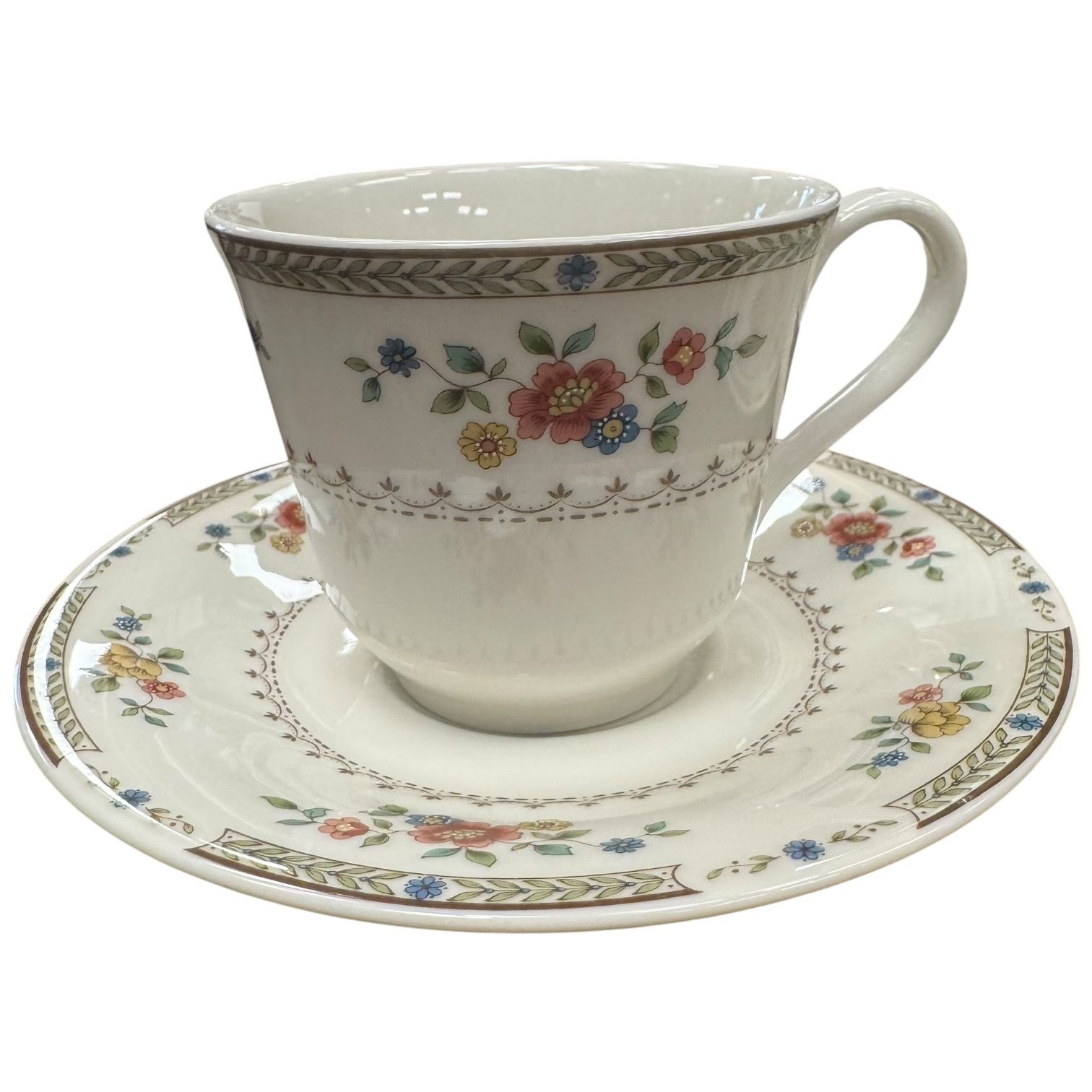 Royal Doulton Kingswood tableware set consisting of 29 pieces. Includes teapot, bowl, tea cups and saucers, plates, creamer and sugar bowl. Features the Kingswood pattern. Item is as pictured.
