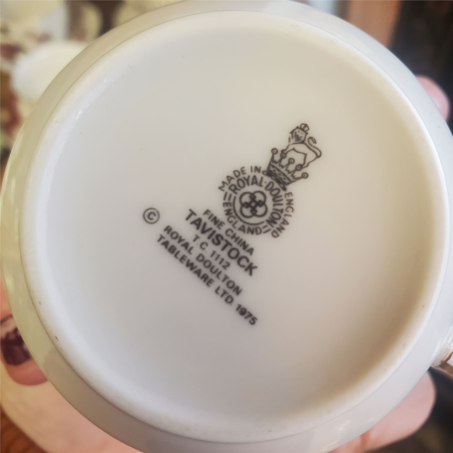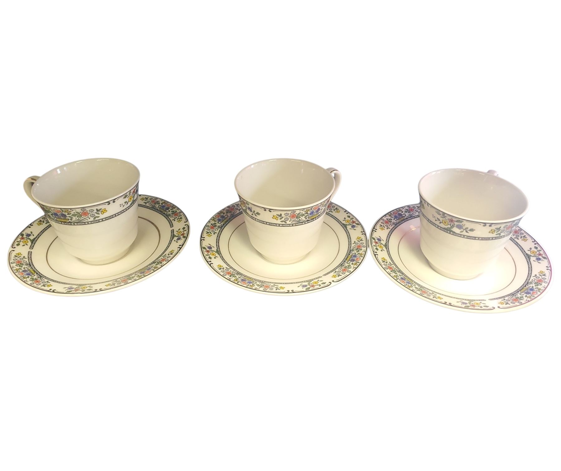 Royal Doulton bone china teacups and saucers set featuring Tavistock pattern. Includes three teacups and three matching saucers with delicate floral design. Manufactured in England. Suitable for tea service or display. Item is as pictured.