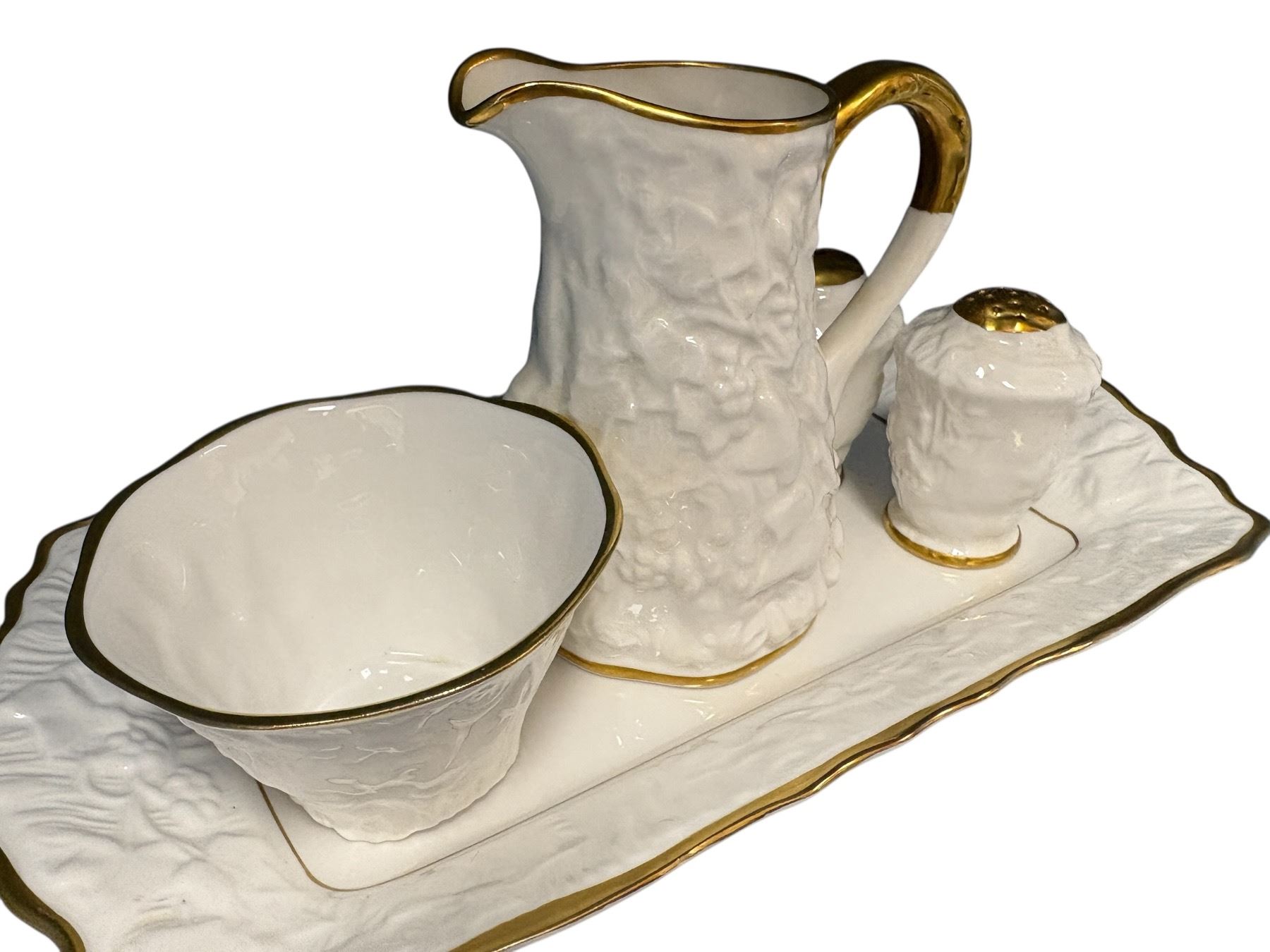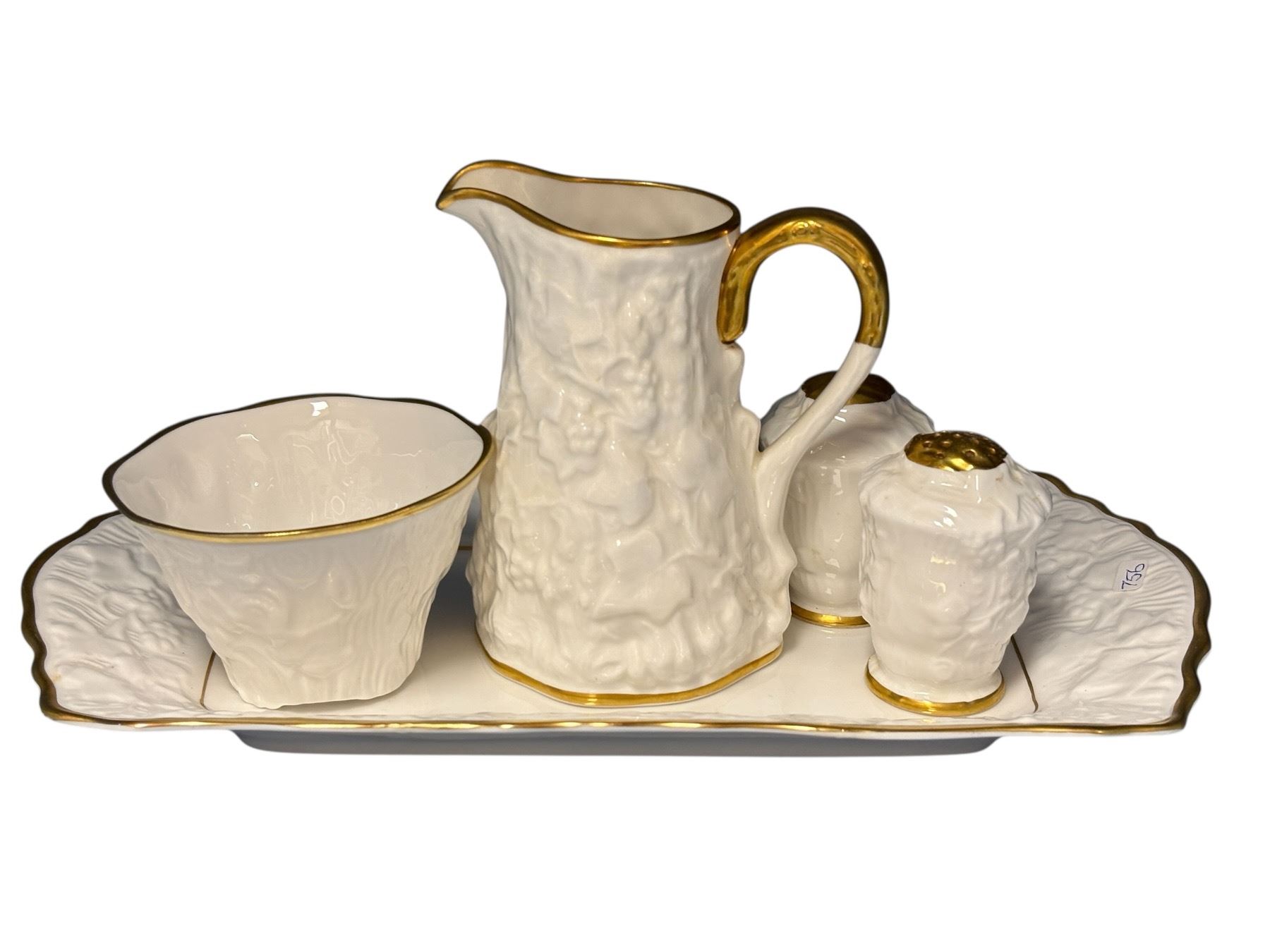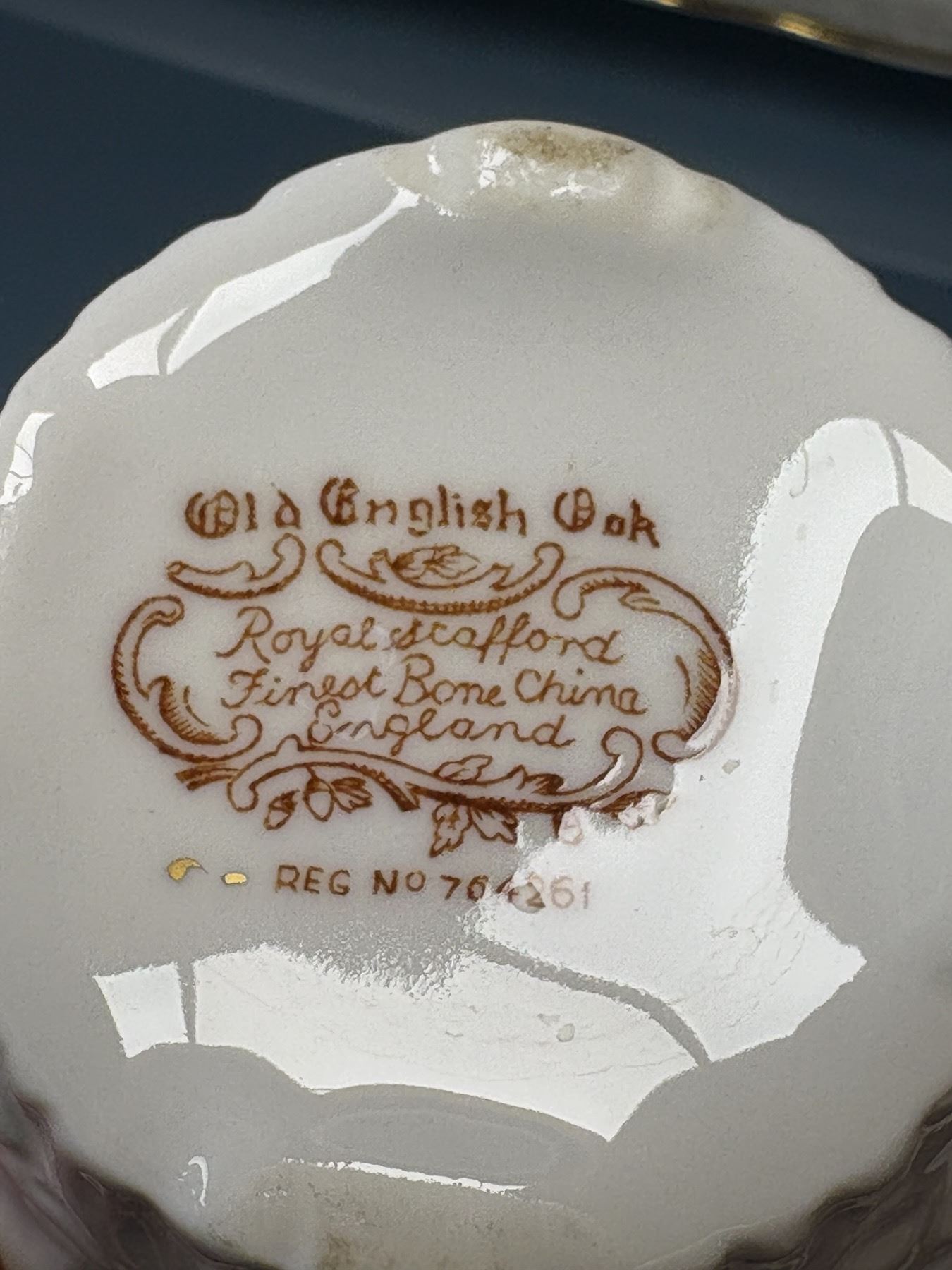 Royal Stafford bone china cream and sugar caddy set with matching salt and pepper shakers. 'Old English Oak' pattern, adorned with delicate oak leaf and acorn motifs. Made in England, features gilded accents. Marked 'Royal Stafford Finest Bone China England' on the base.